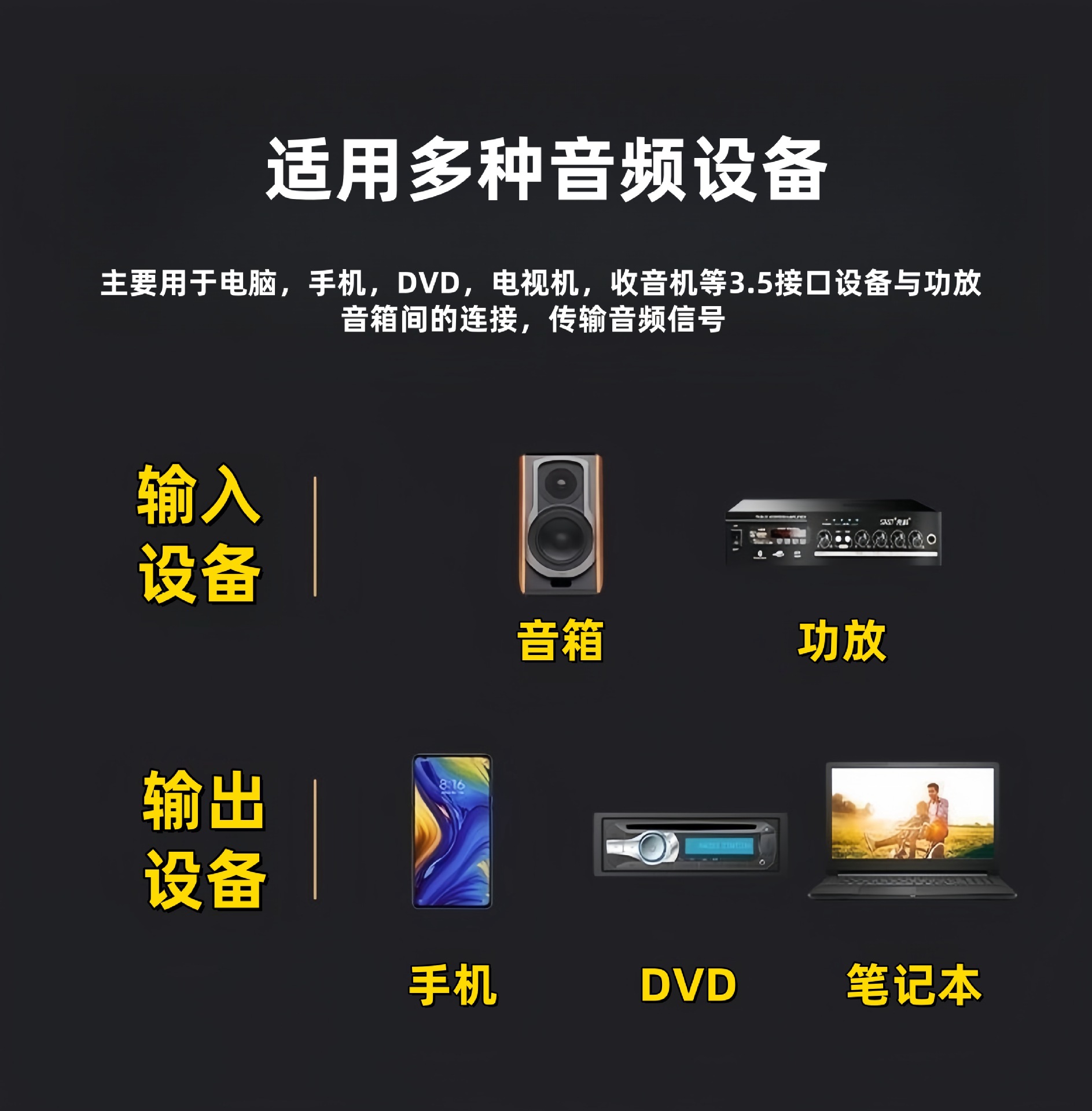 用途:适用于计算机,MP3 DVD CD机 电视机 收音机 电脑与功放 音箱之间的连接并传输它们的音频信号