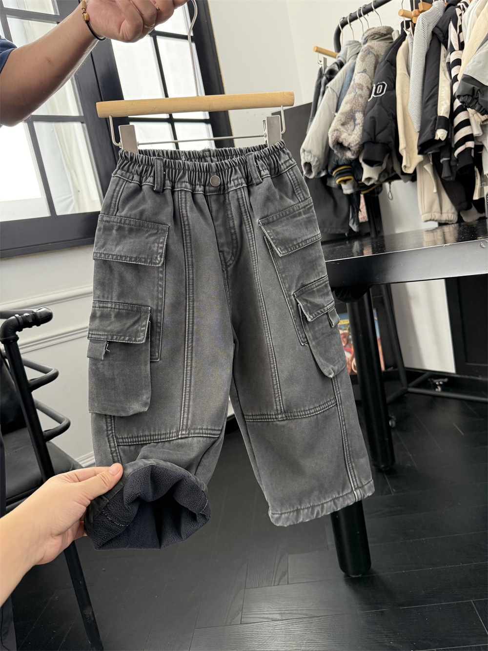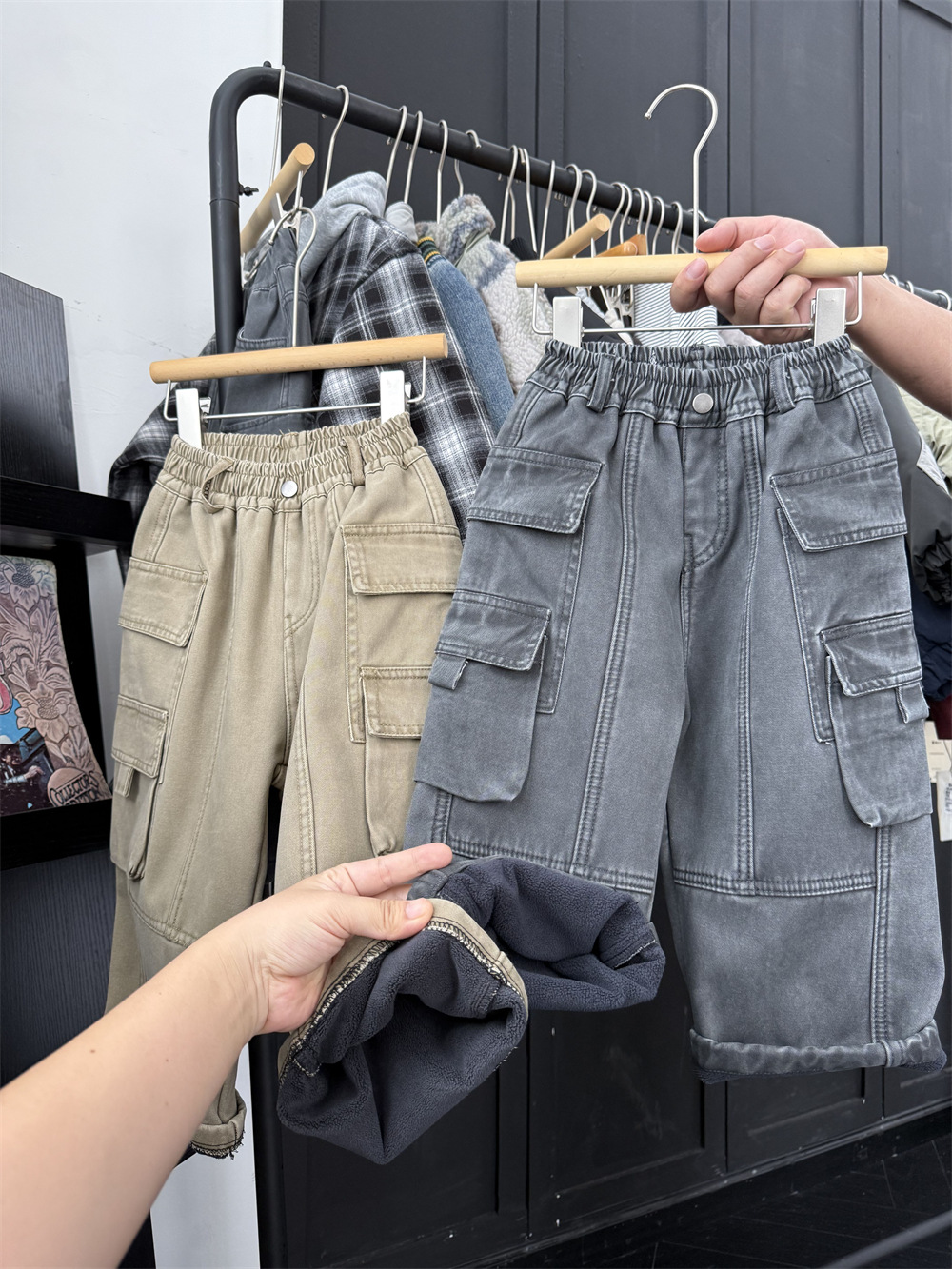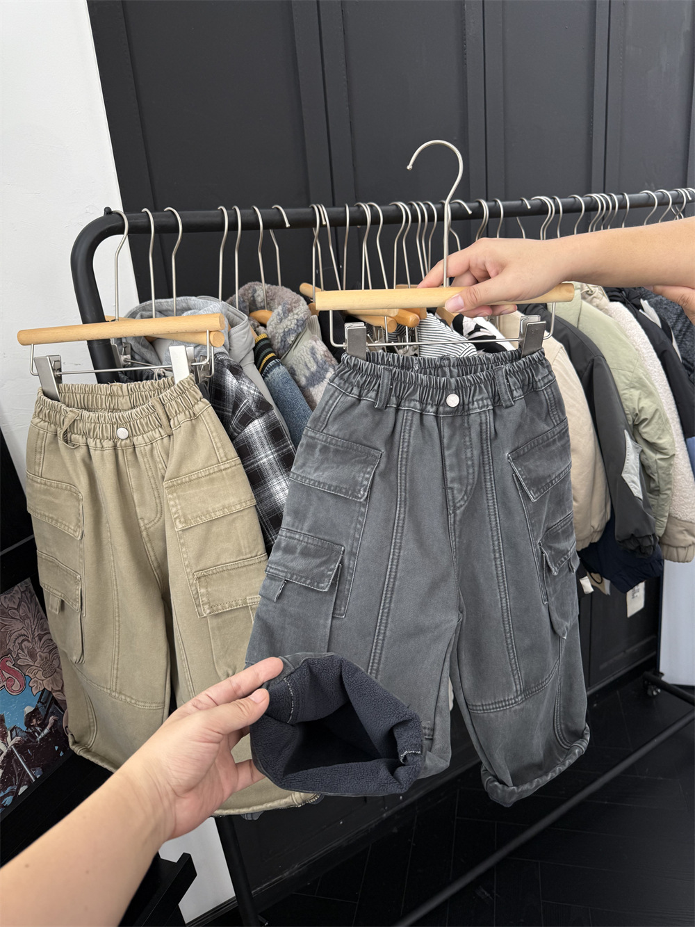 남학생과 여학생을위한 겨울 어린이 스타일의 고민 twill 원피스 벨벳 바지 기모 두꺼운 스트레이트 팬츠 바지스토어 가기