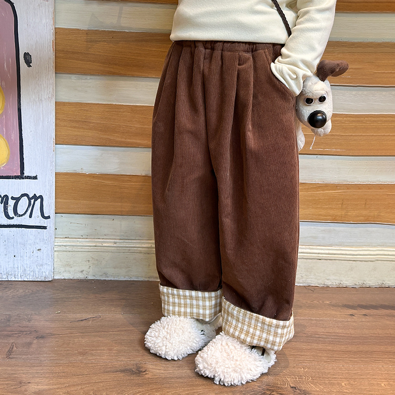 클리어런스 상품【플리스 안감】남녀 아동 캐주얼 바지 한국 스타일 체크무늬 롤업 코듀로이 팬츠 트렌디