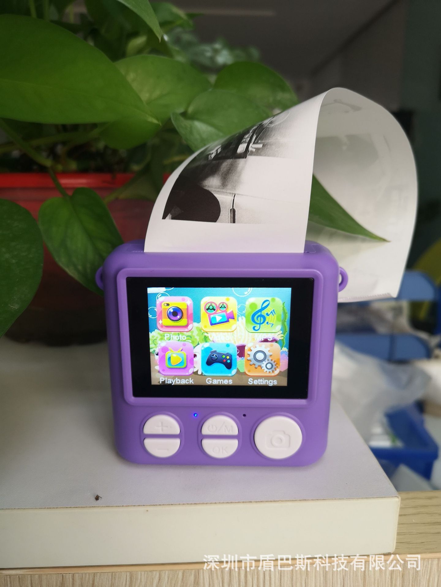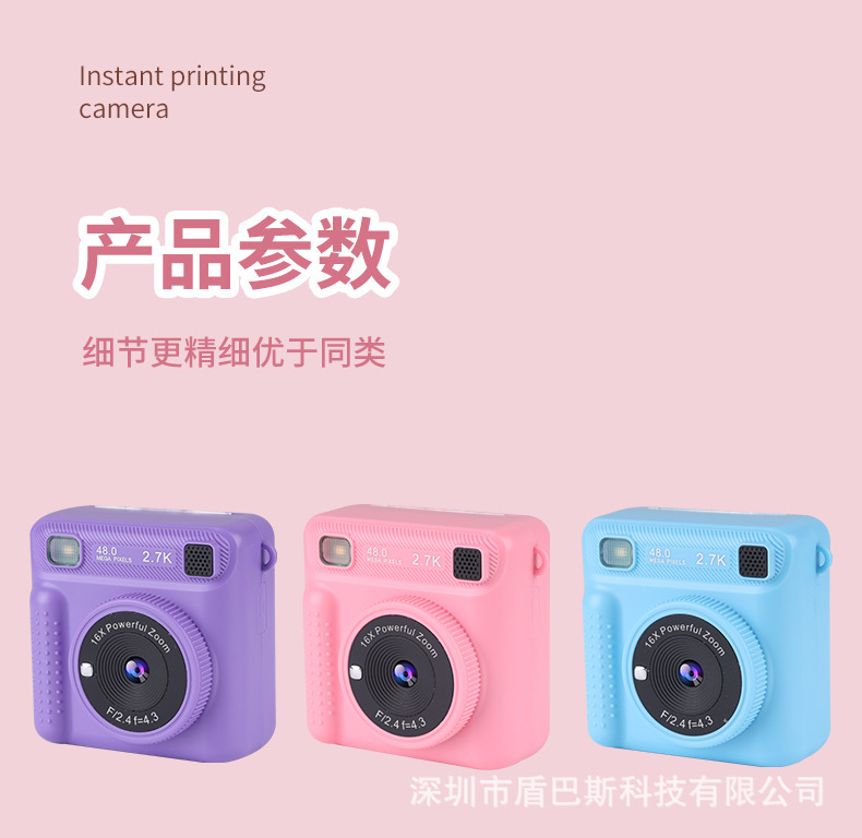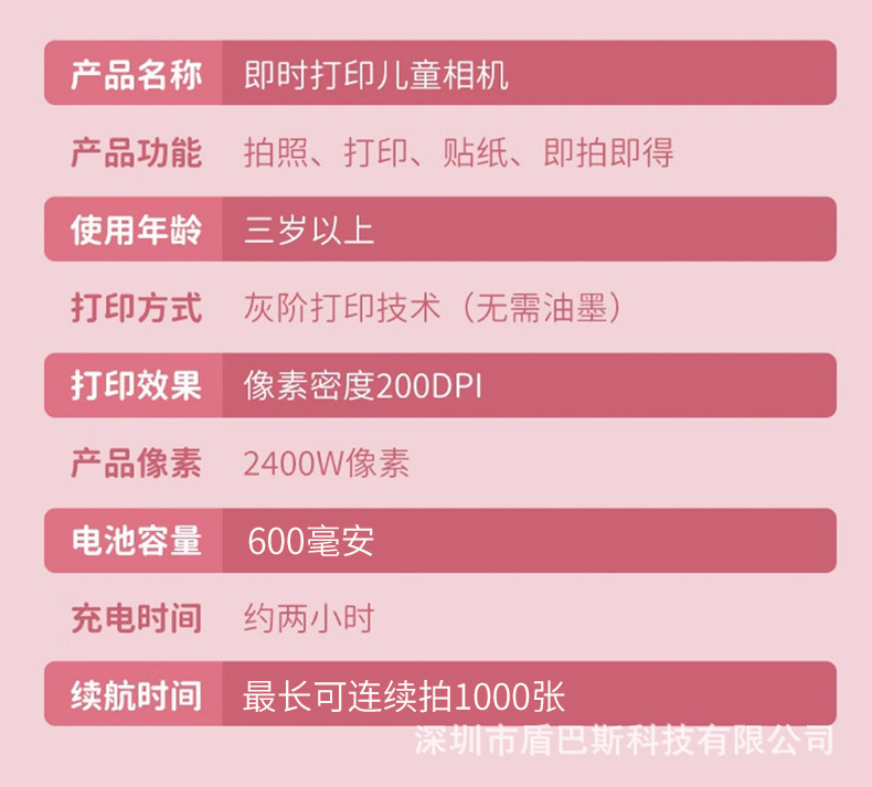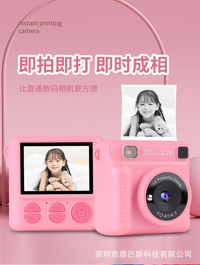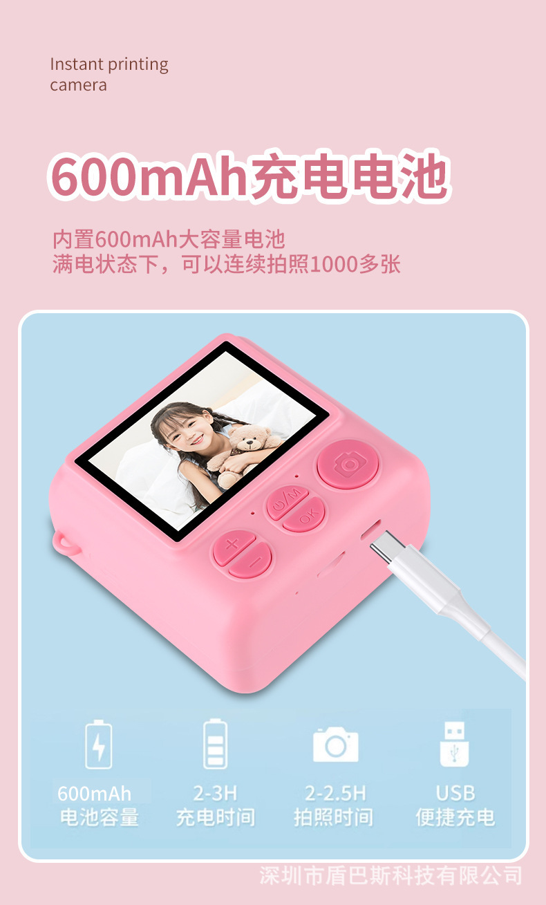 本产品儿童手机H12,主要特点是可以立拍立打印相片功能,大屏幕2.4寸,可以拍照,录像,大头贴变化,玩小游戏等功能,支持32G内存卡,配件有说明书,充电线,挂绳,天地盒子和打印纸。