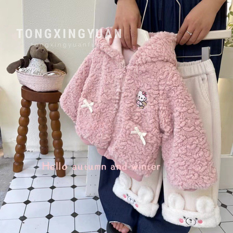 여자 푹신한 코트 겨울 한국 어린이 의류 아기 소녀 귀여운 후드 탑 바지 세트 겨울 도매스토어 가기