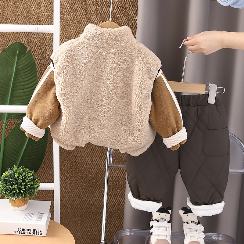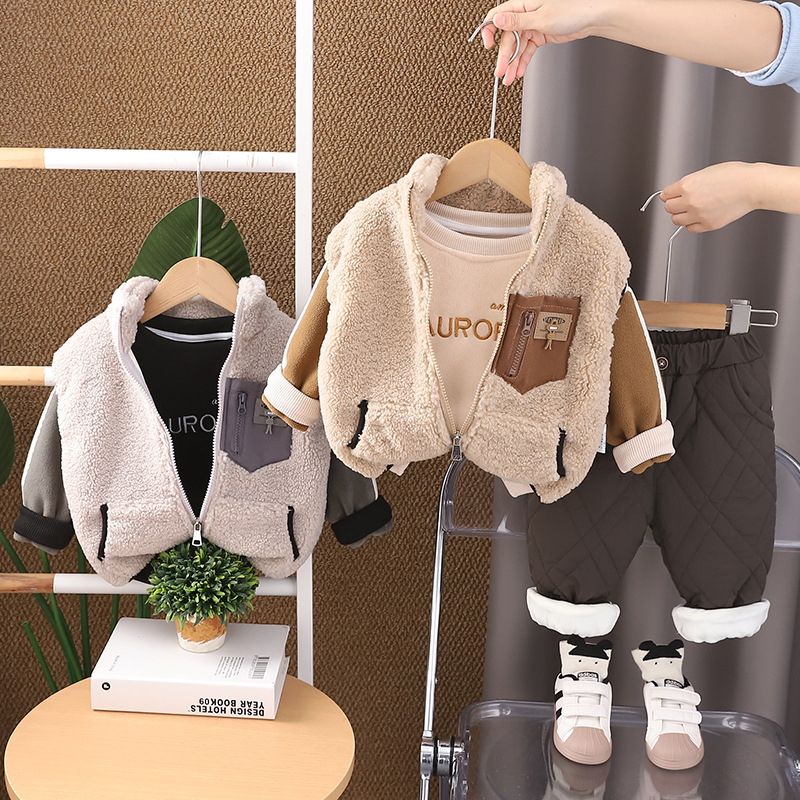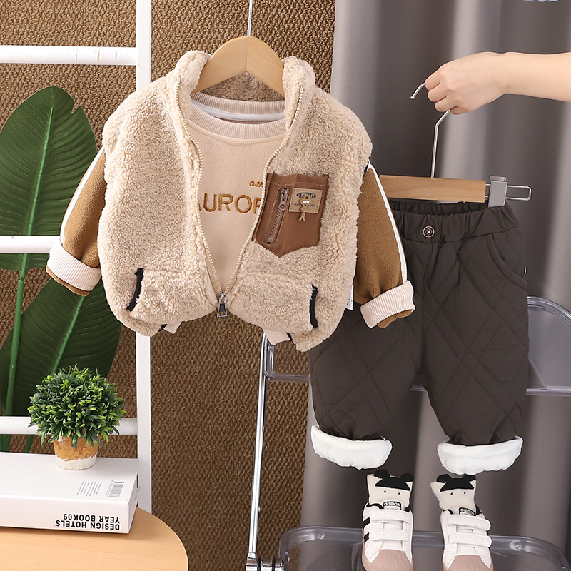 소년 세트 어린이 가을 착용 플러스 벨벳 재킷 스포츠 3 피스 세트 2024 새로운 가을 및 겨울 봉제 아기 아동복스토어 가기