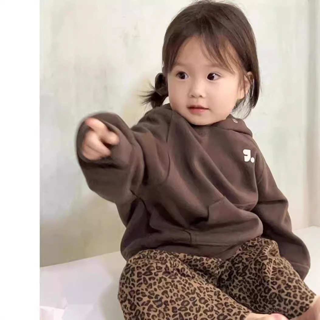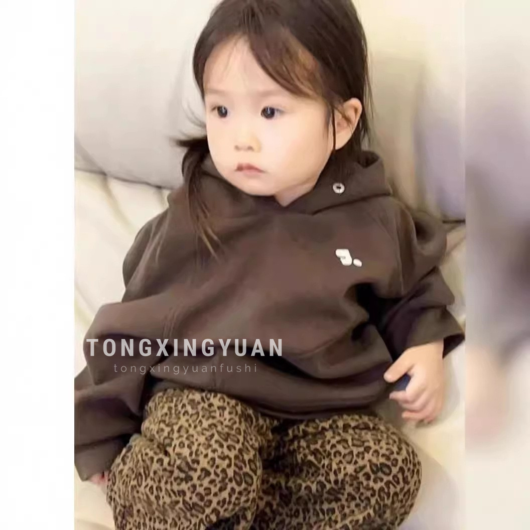 한국 스타일 봄 가을 2025년 가을 신상 커피색 후드티 여아용 레오파드 프린트 캐주얼 팬츠 투피스 도매스토어 가기
