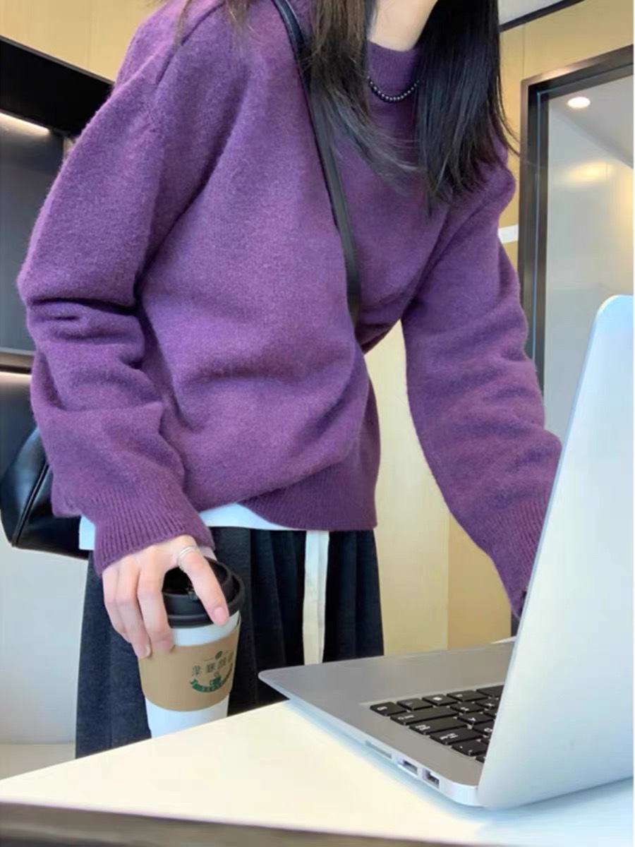 이른 가을 착용 보라색 크루 넥 긴팔 니트 탑 여성 가을 및 겨울 새로운 틈새 올 매치 루즈 슈퍼 룩 스웨터스토어 가기
