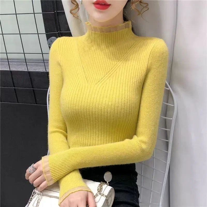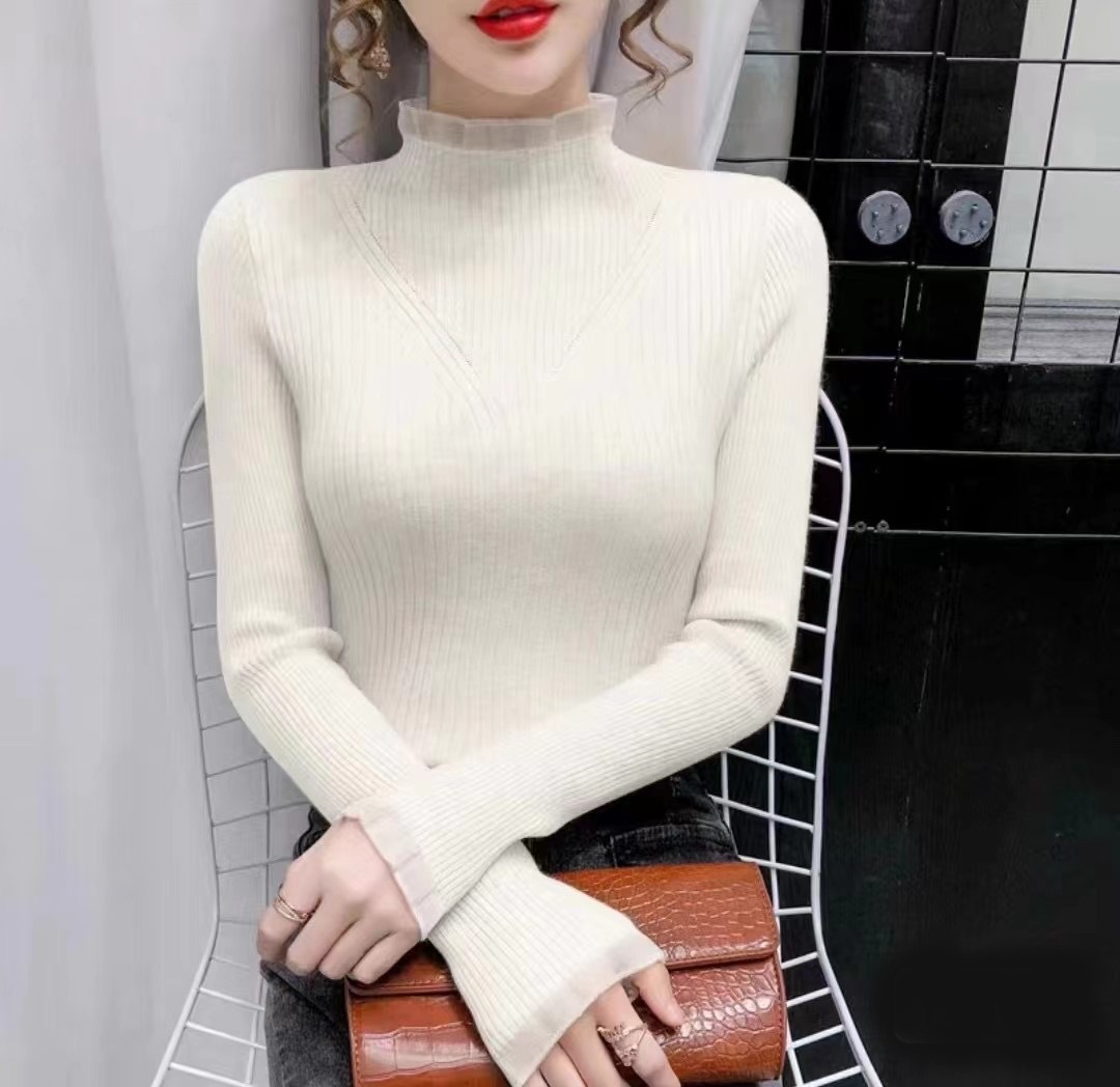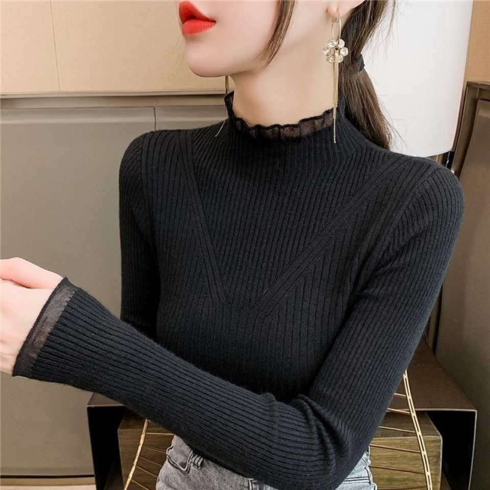 2024 년 가을과 겨울 새로운 반쪽 터틀넥 스웨터베이스 셔츠 여성용 내부 스타일 탑 레이스 스티칭 미들 칼라 니트 스웨터