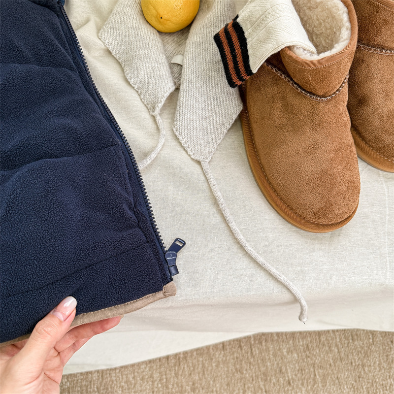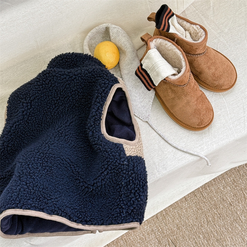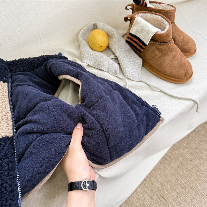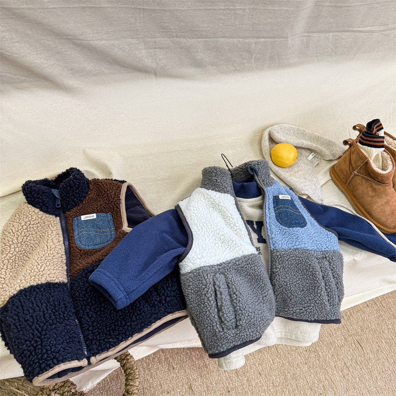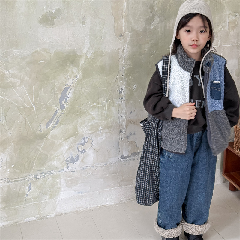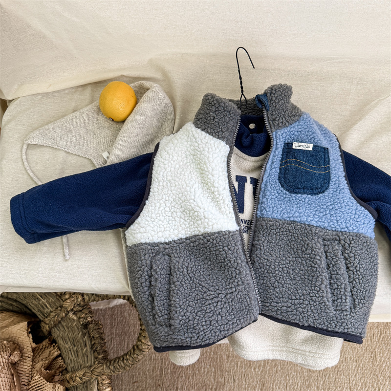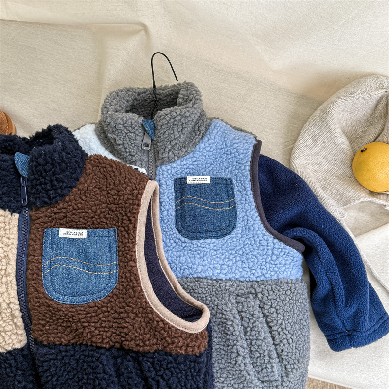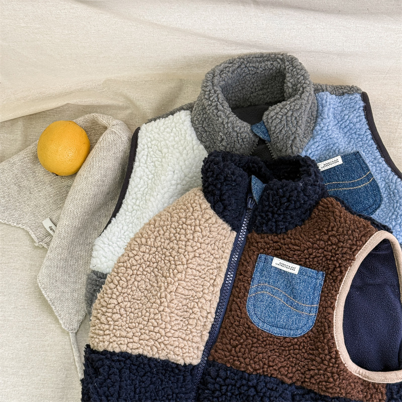 2024 소년 소녀를위한 겨울 어린이 양고기 벨벳 조끼 서양식 컬러 블록 칼라 코튼 따뜻한 면 조끼 카디건 재킷