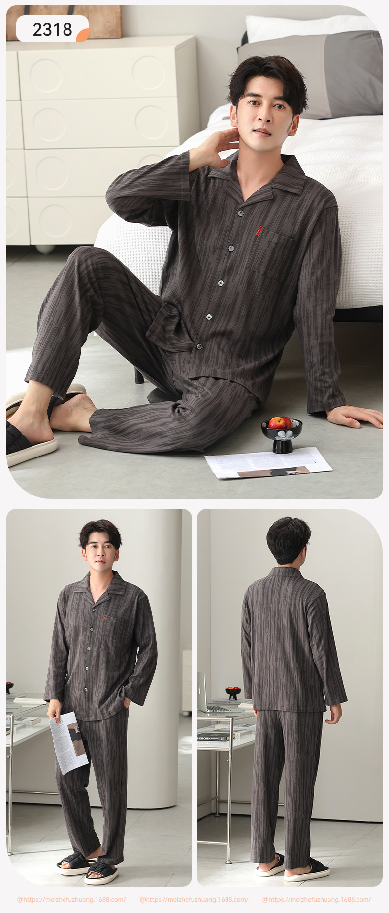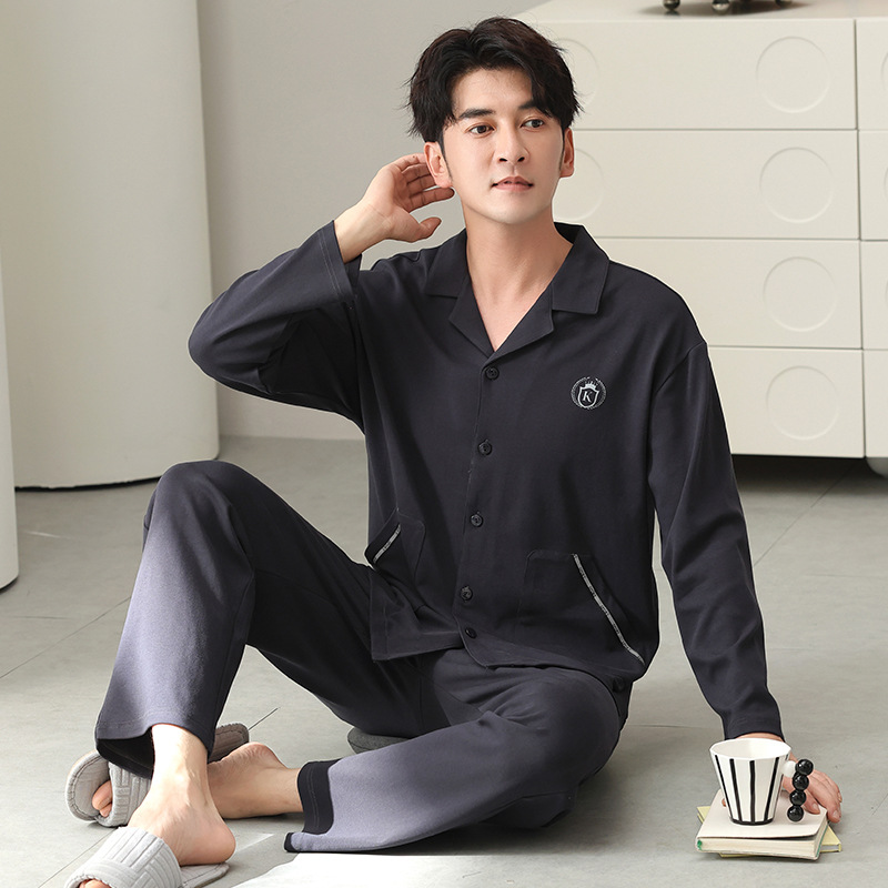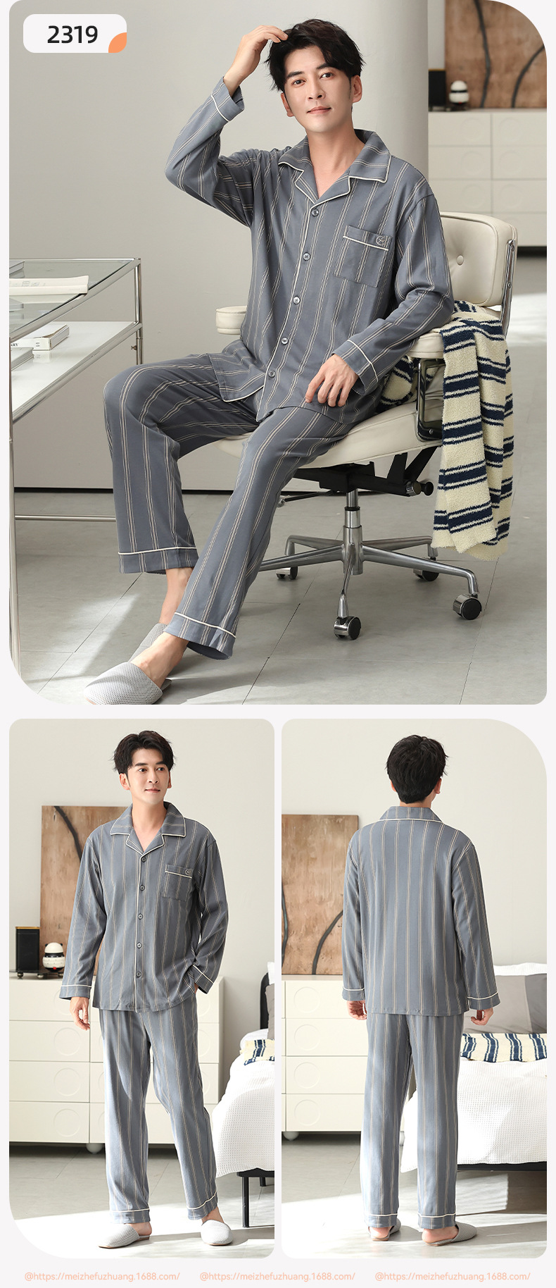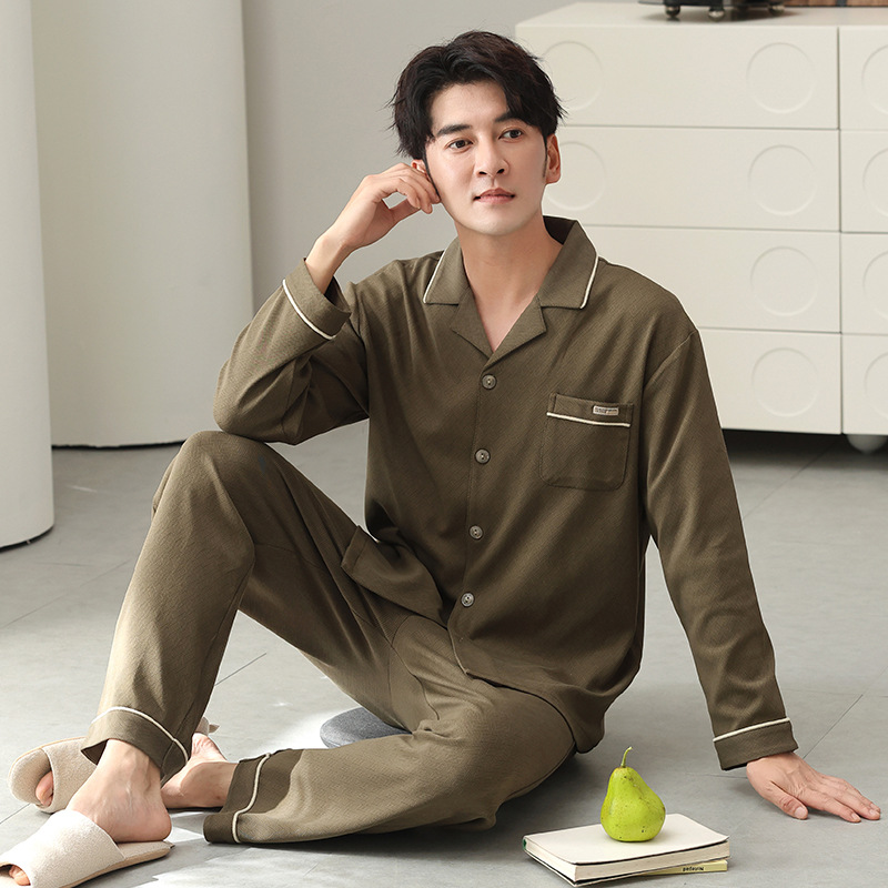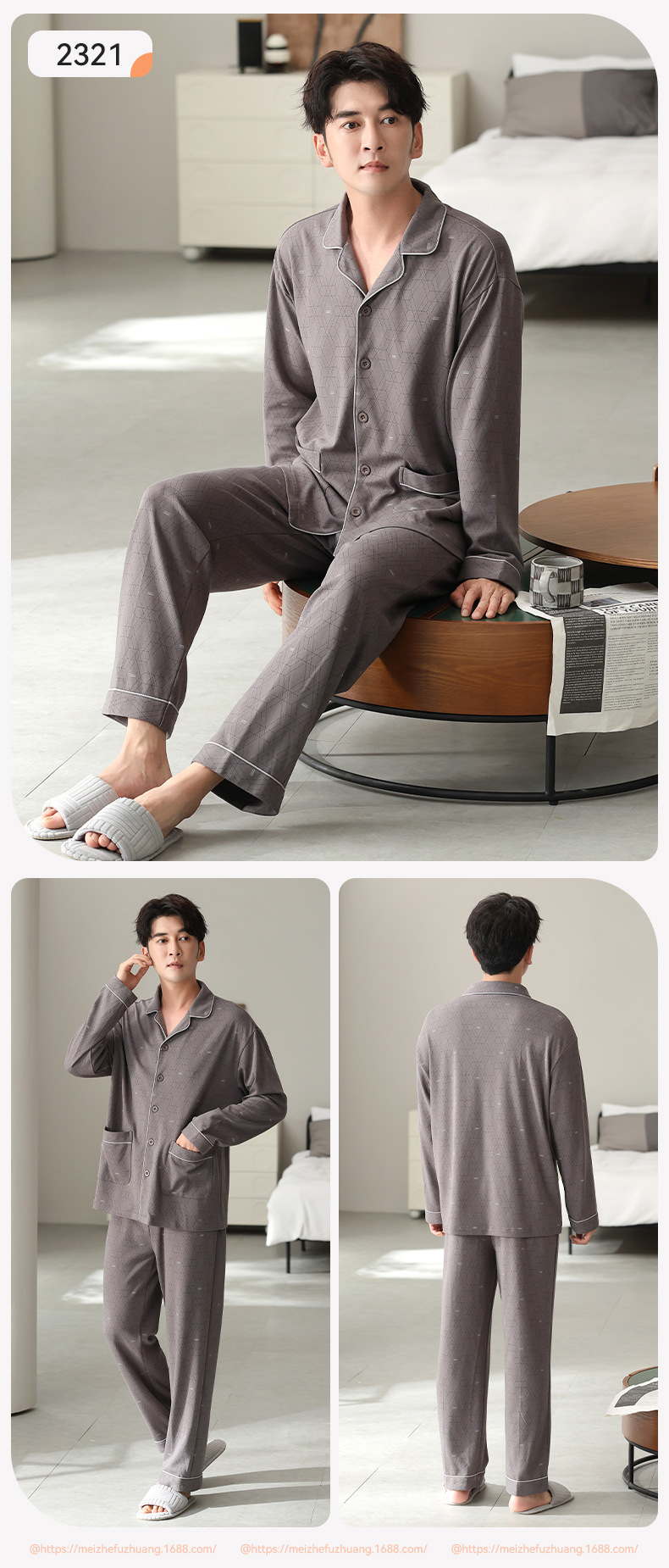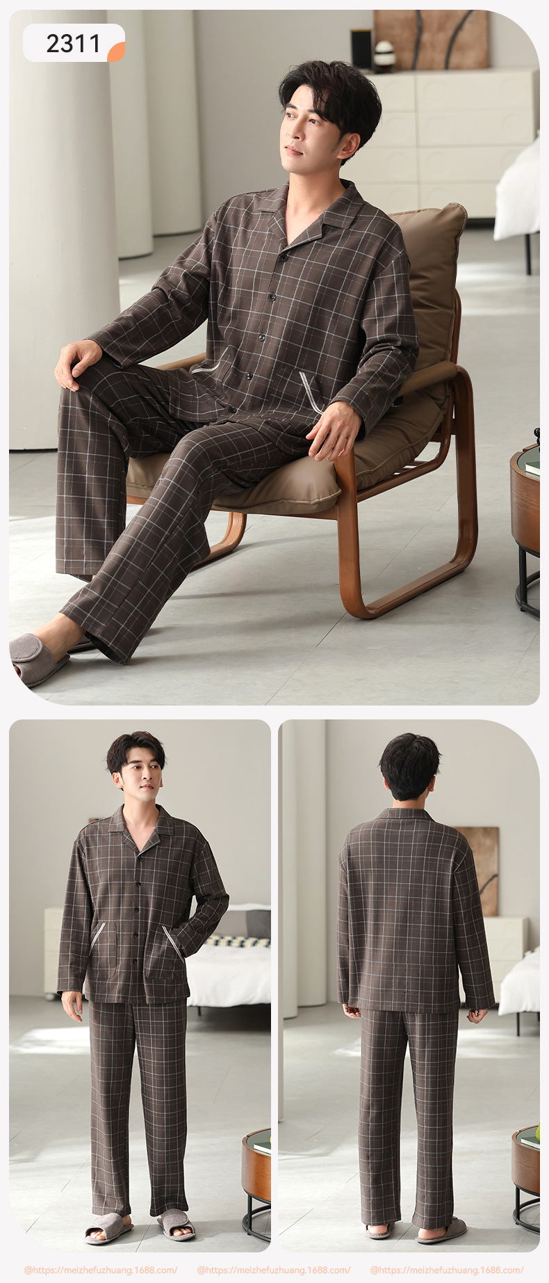 새로운 도착 순면 잠옷 남성 가을과 겨울 간단한 패션 옷깃 카디건 남성 홈 의류 세트 외부에서 착용 할 수 있습니다.스토어 가기