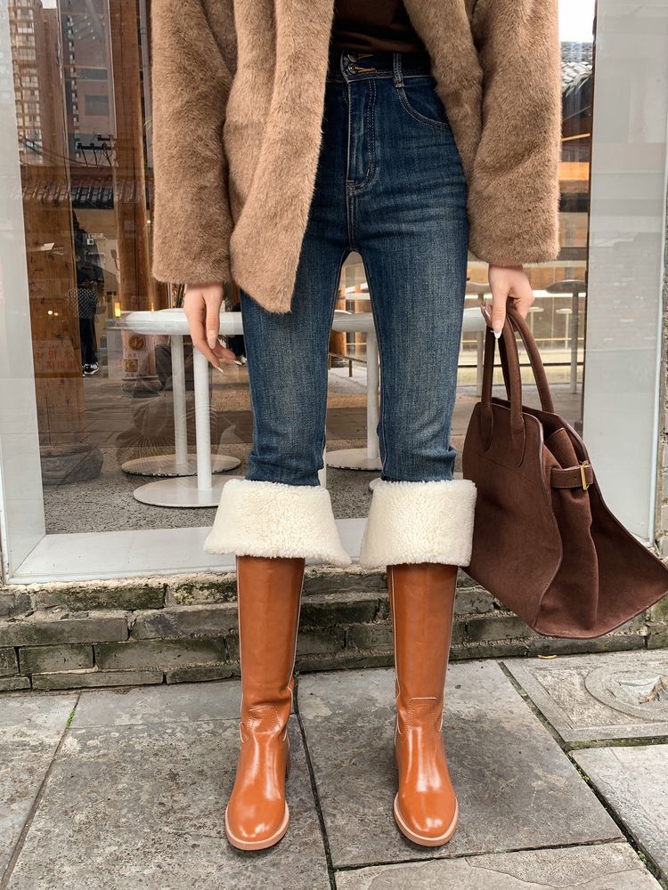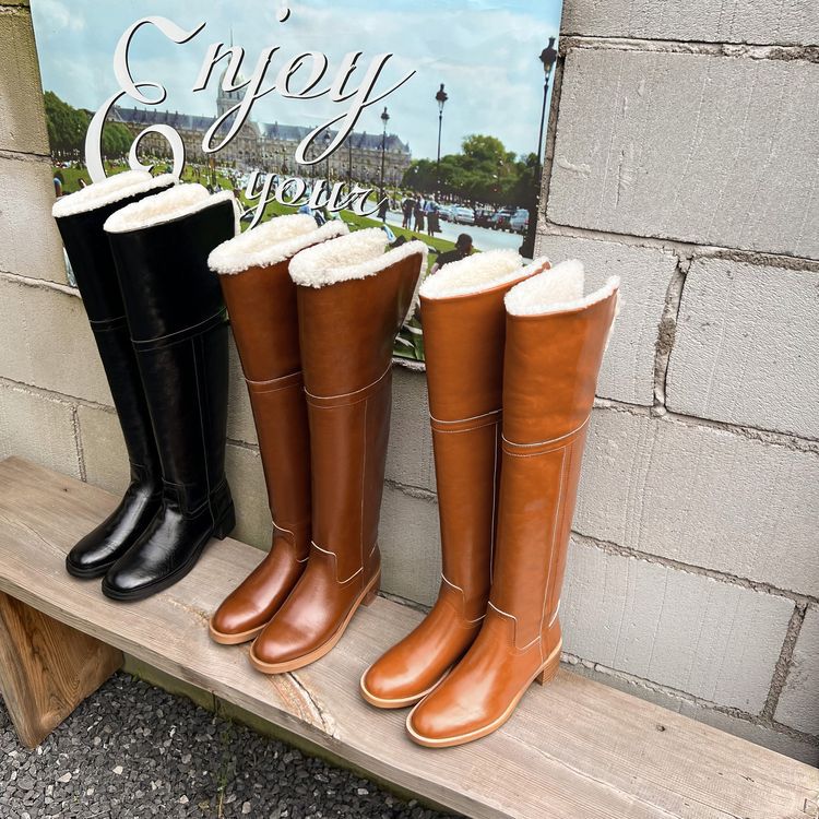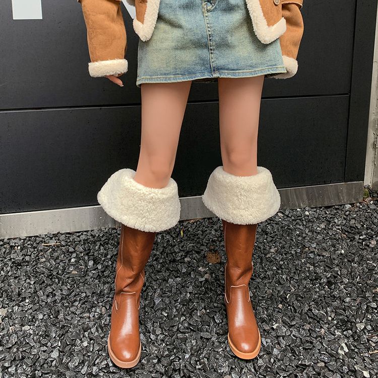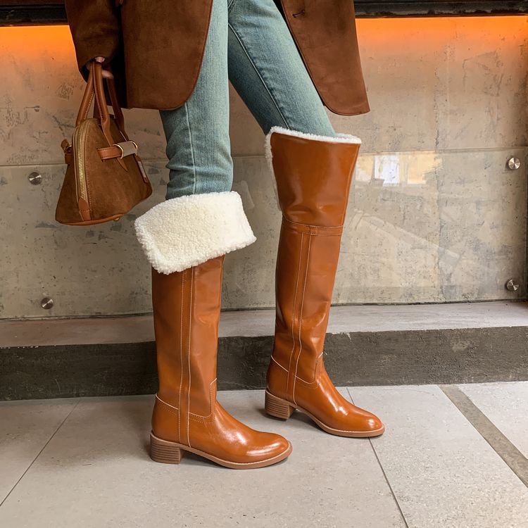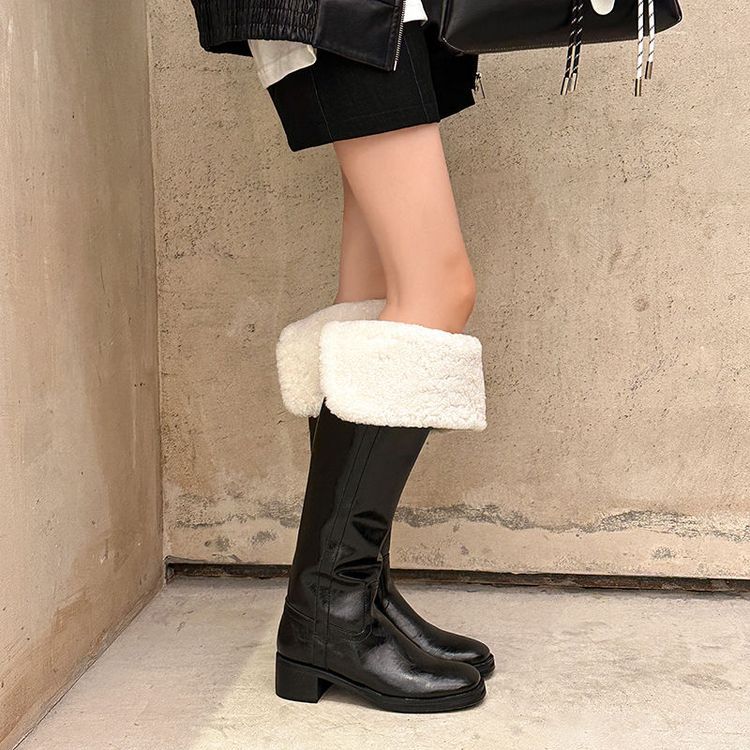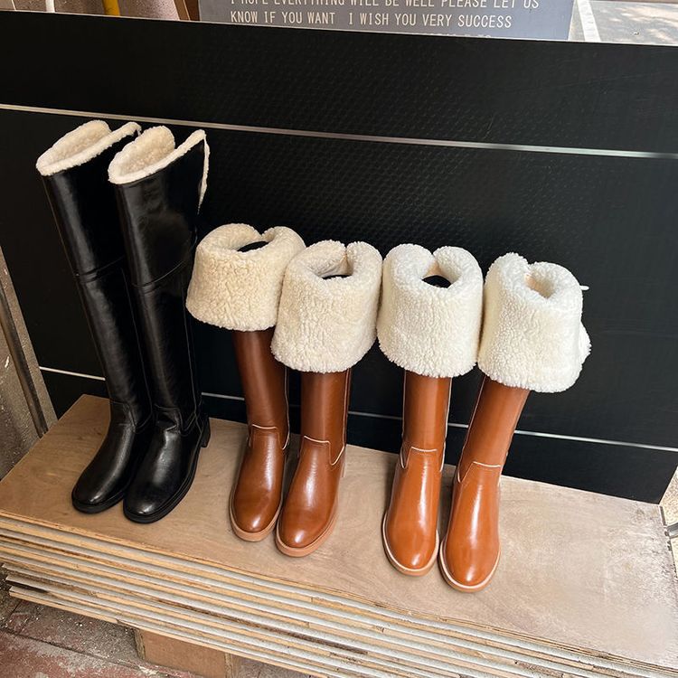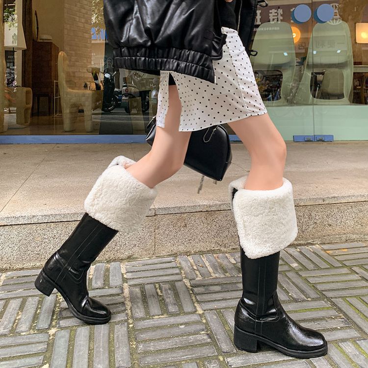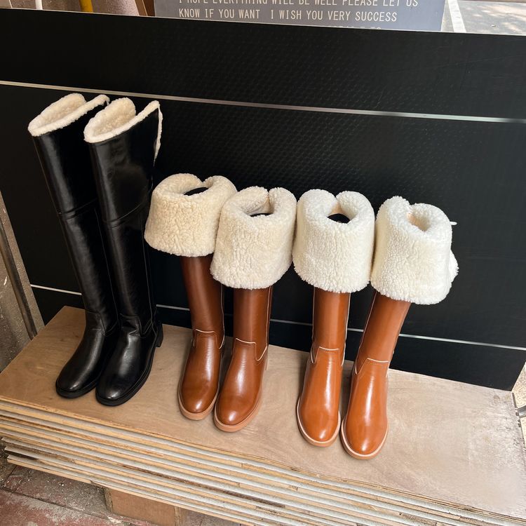 2024 가을과 겨울 두꺼운 무릎 위 여성용 롱 부츠 마오 마오 턴 업 양방향 롱 부츠 미드 힐 하이 기모 두꺼운 코튼 슈즈스토어 가기