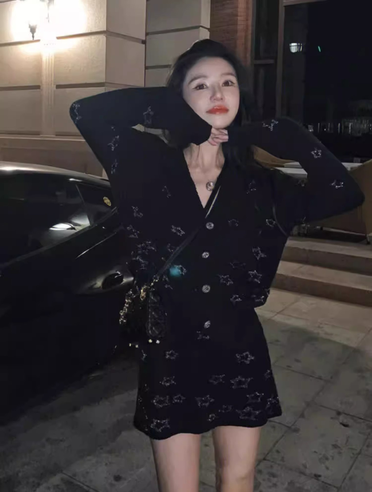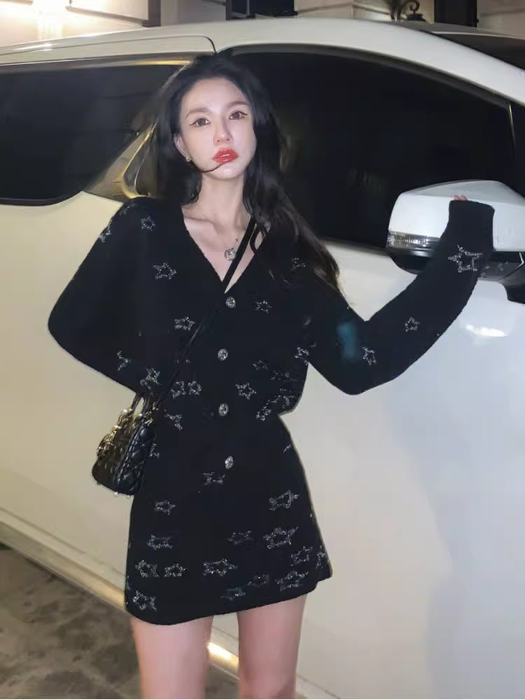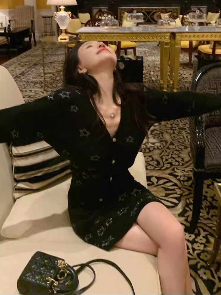 프랑스 스타일 차 브레이크 헵번 스타일 하이 엔드 리치 가족 딸 골드 투피스 원피스 여성 봄 샤넬 스타일 V 넥 원피스