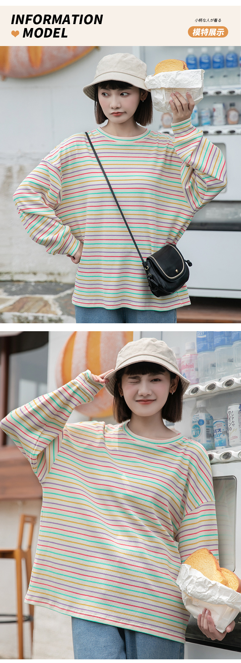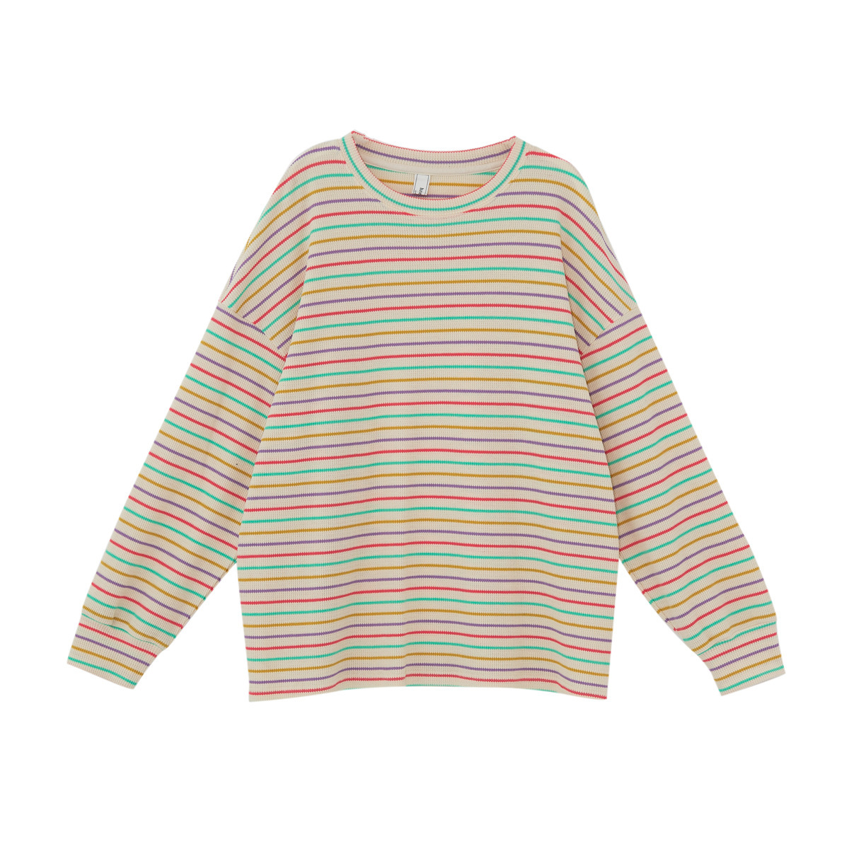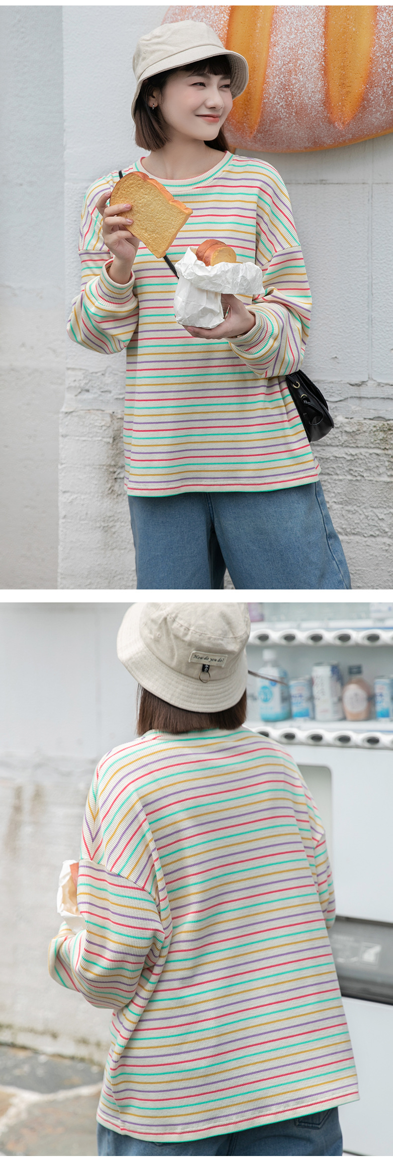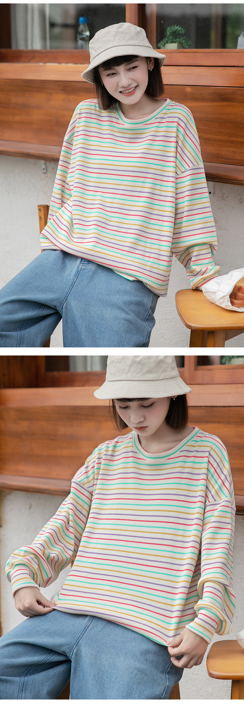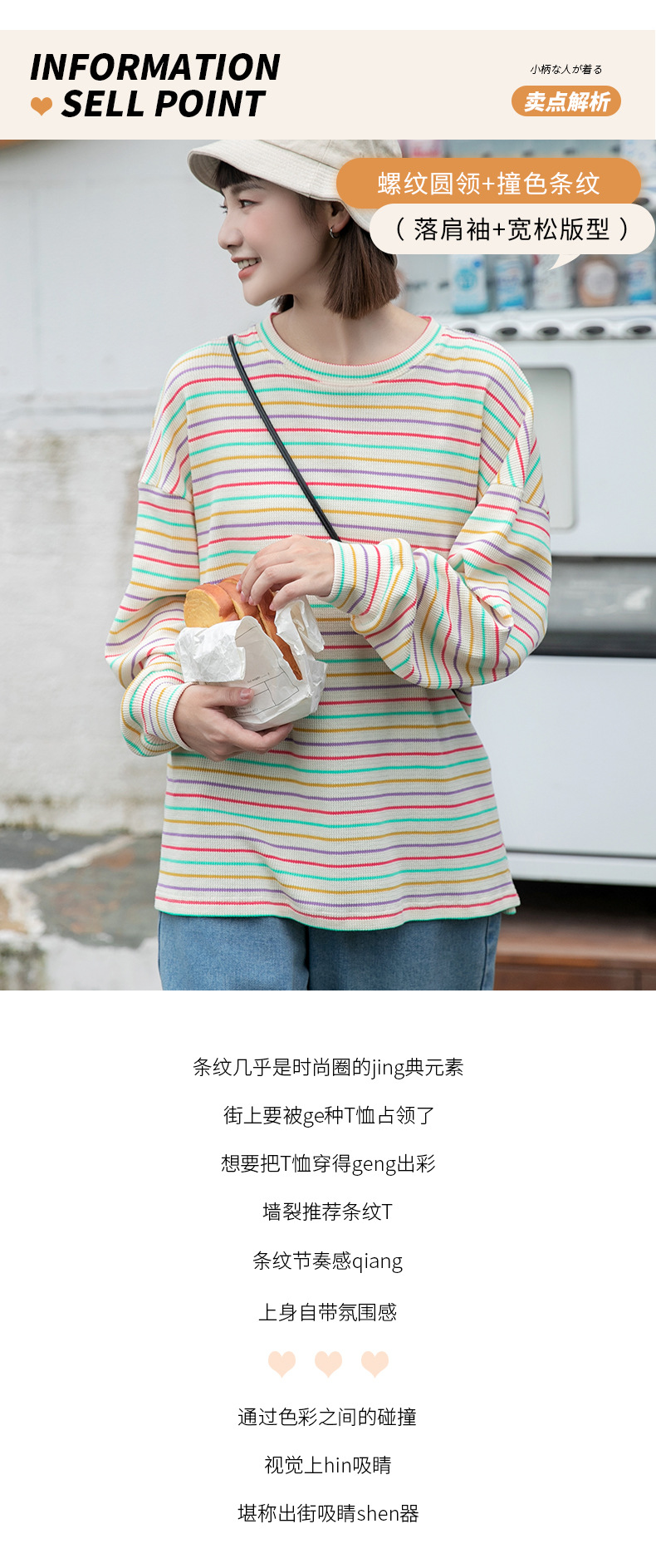 황정 루즈핏 어깨 드러나는 컬러풀 스트라이프 니트 긴팔 티셔츠 여성 가을 신상 루즈핏 라운드넥 상의 컬리지 스타일스토어 가기