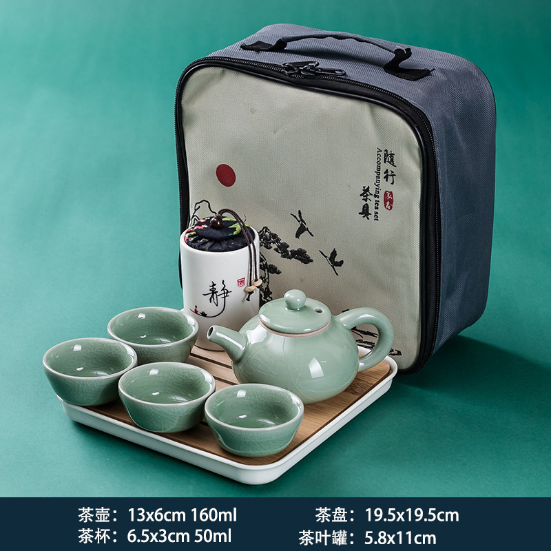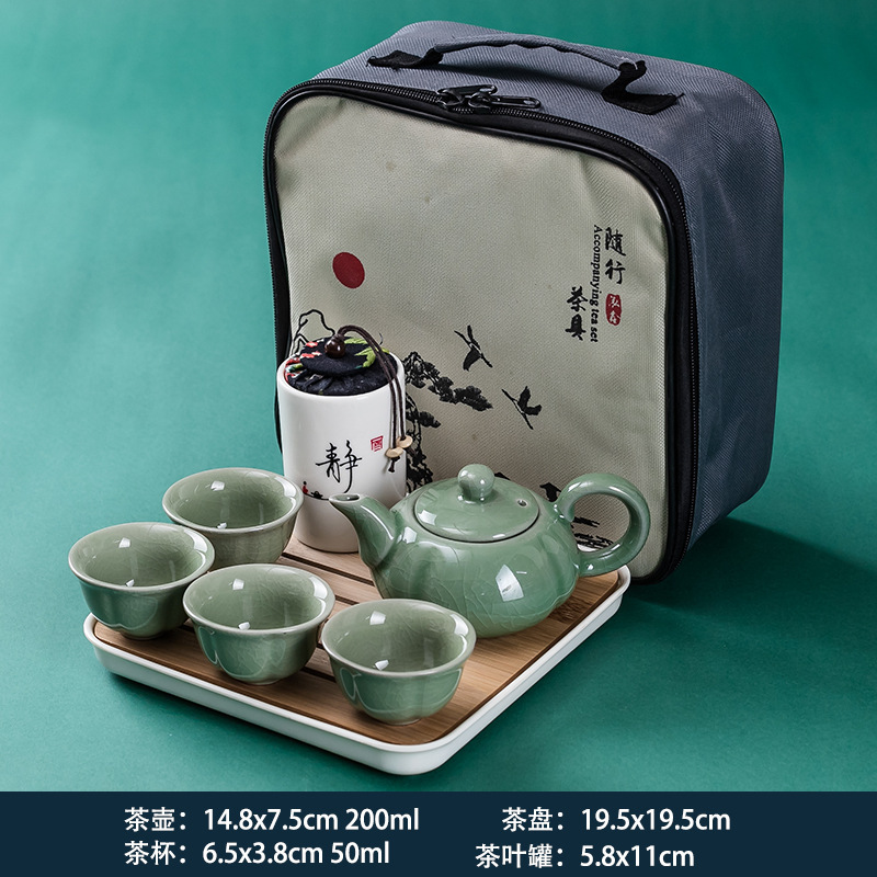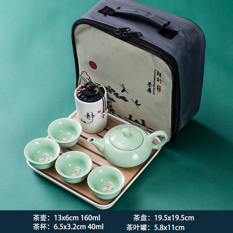 • 절묘한 녹색 국화 찻주전자 5개 + 접시 + 항아리 + 가방