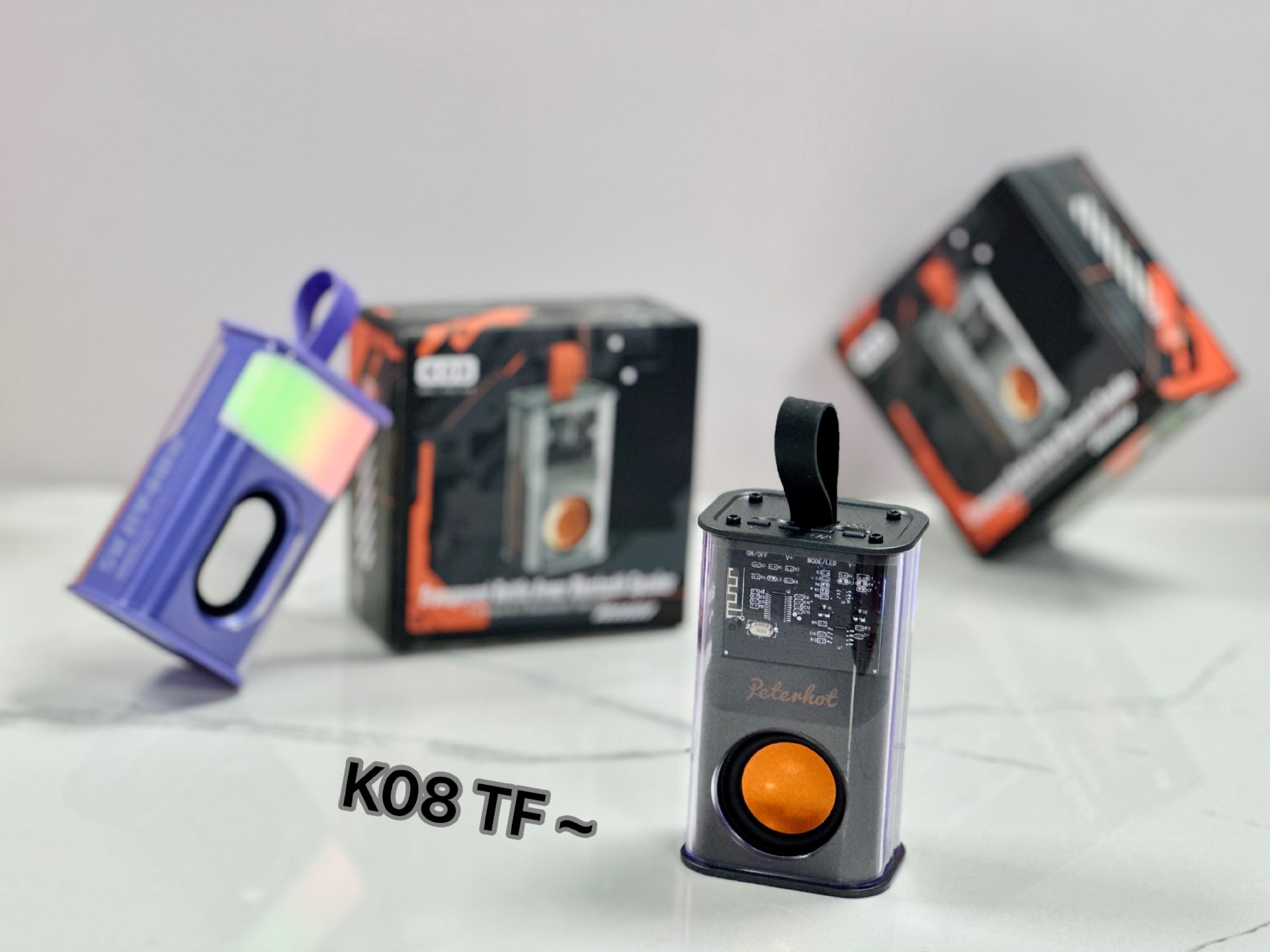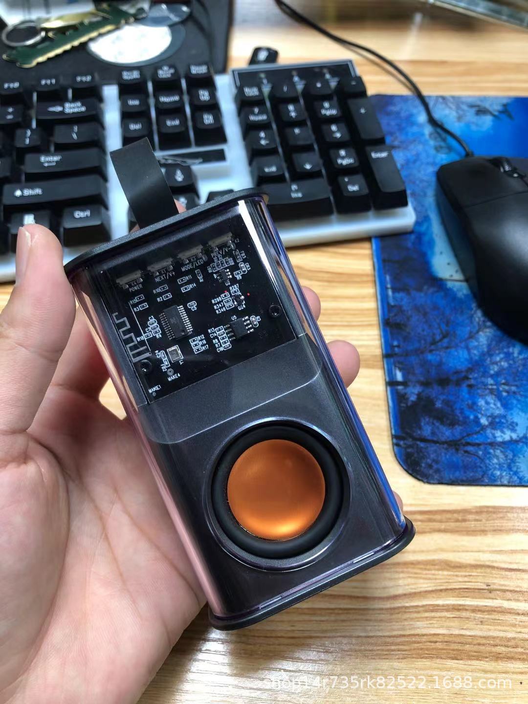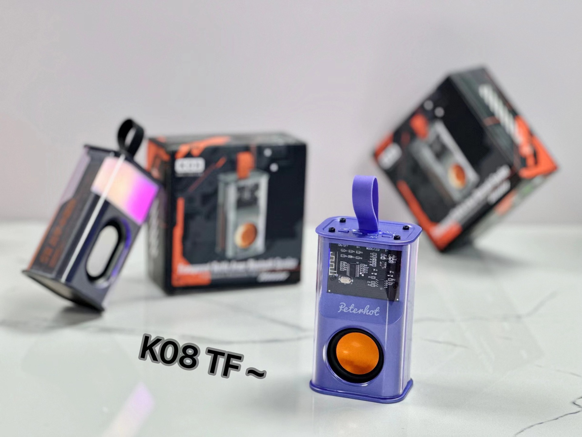 K08TF 插卡,杰理5.3主控,2018功放3w输出功率,4054充电过充保护,40圆外磁唡叭8个高磁铁,隋圆5030跑道振膜反贴不锈钢面,14500圆柱500毫安电池带普通精工板保护。配50cm长TPC充电线,黑色的小合子没有吸塑内托100个每件。