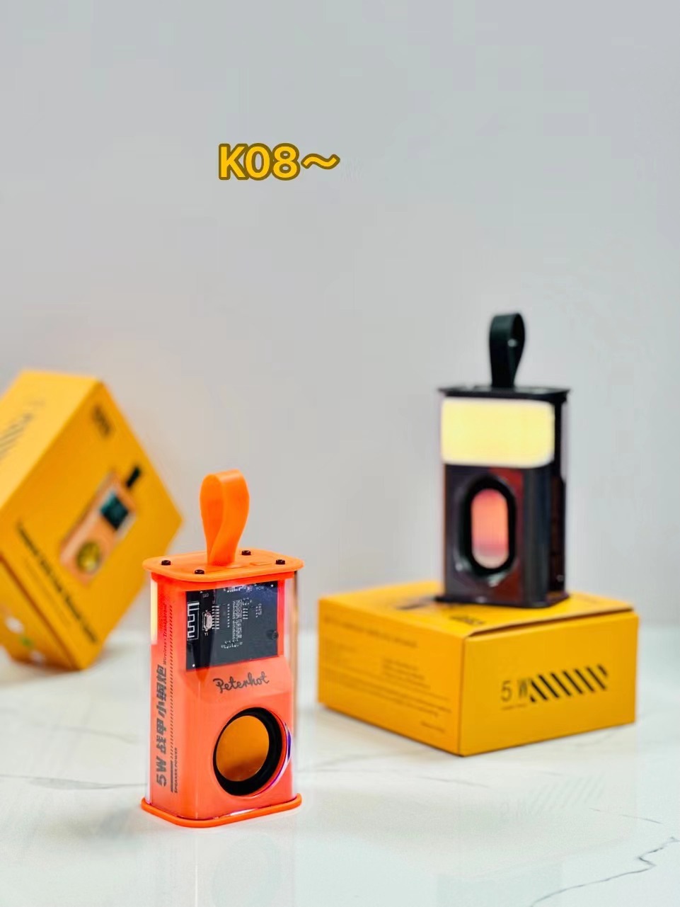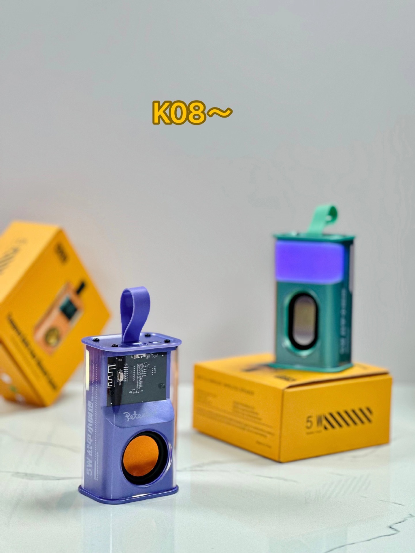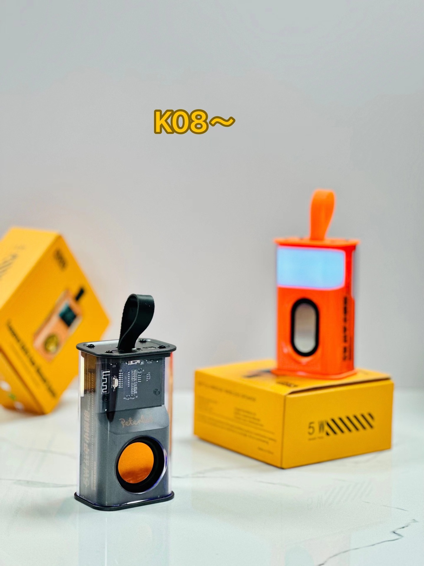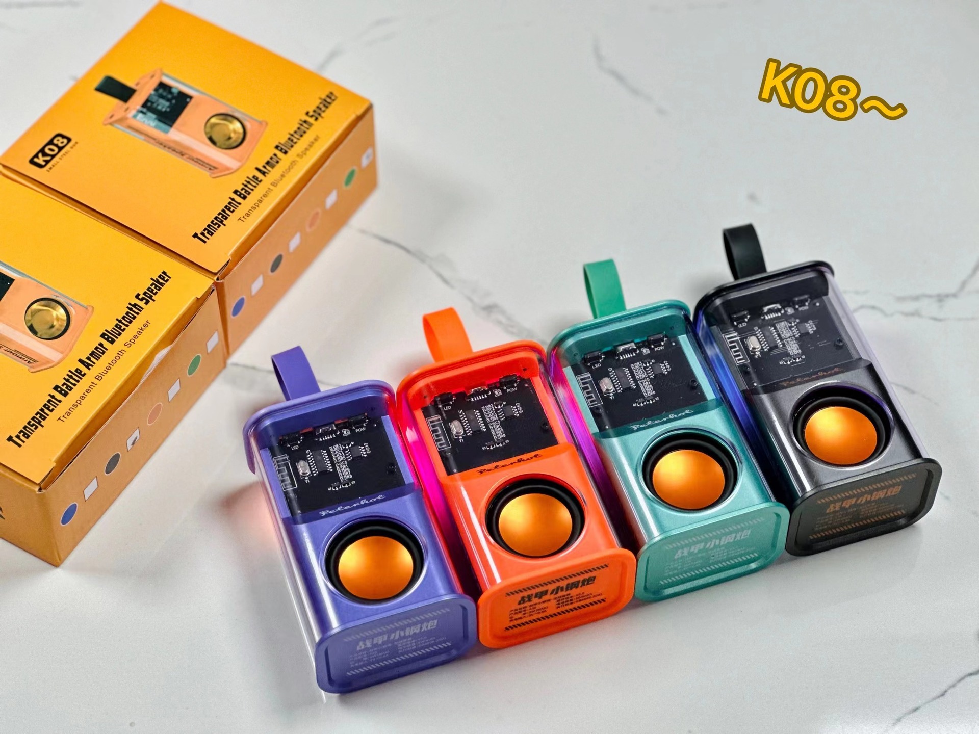 K08不插卡,中科蓝讯5.3主控,2018功放3w输出功率,4054充电过充保护,40圆外磁唡叭8个高磁铁,隋圆5030跑道振膜反贴不锈钢面,14500圆柱500毫安电池带普通精工板保护。配50cm长TPC充电线,黄色的小合子没有吸塑内托100个每件。