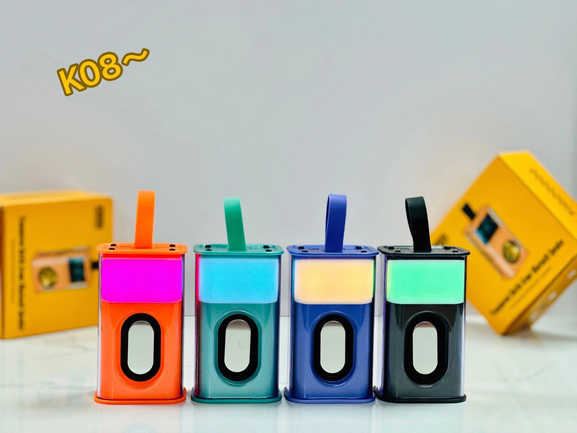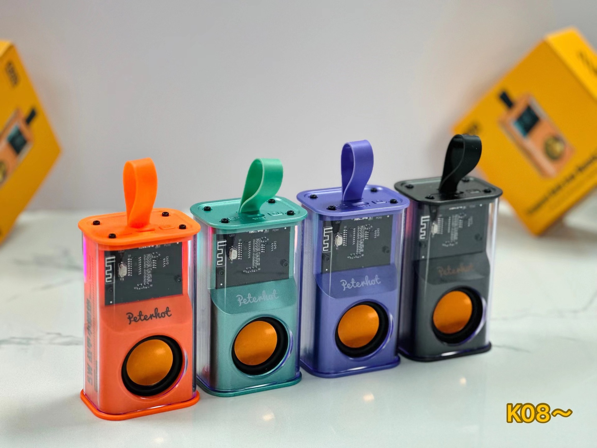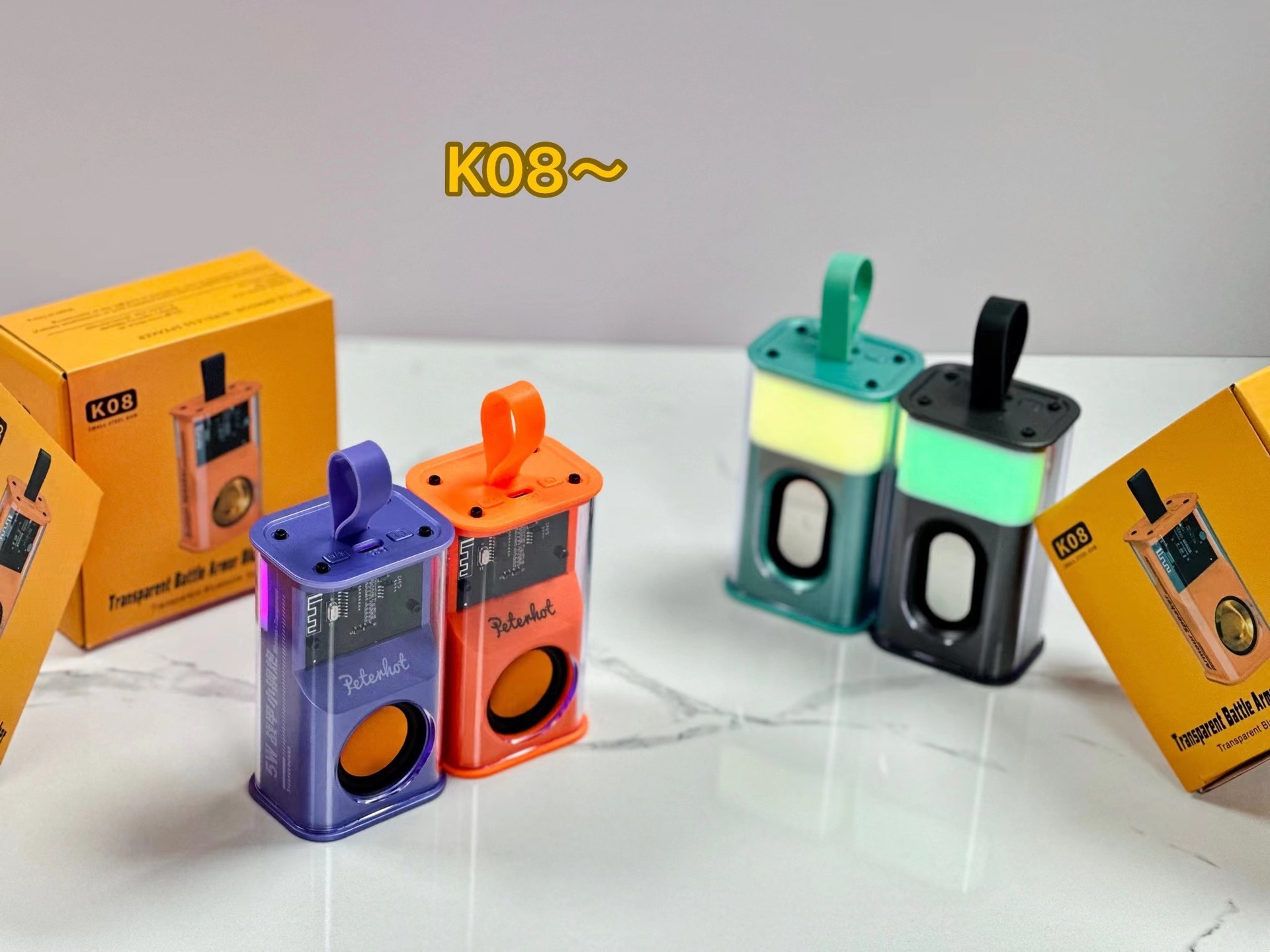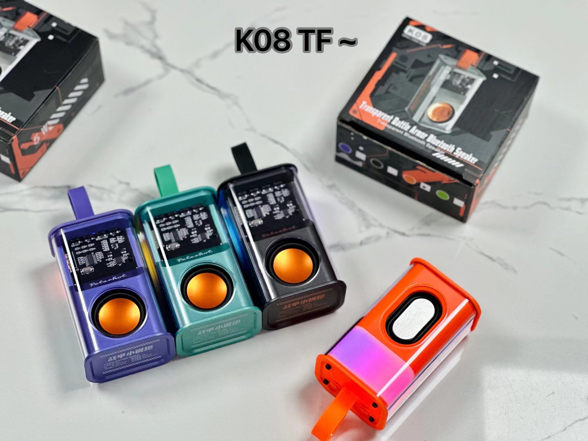 K08不插卡,中科蓝讯5.3主控,2018功放3w输出功率,4054充电过充保护,40圆外磁唡叭8个高磁铁,隋圆5030跑道振膜反贴不锈钢面,14500圆柱500毫安电池带普通精工板保护。配50cm长TPC充电线,黄色的小合子没有吸塑内托100个每件。