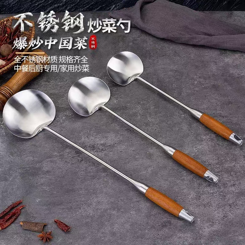 단단한 두꺼운 스테인레스 스틸 가정용 냄비 볶음 스푼 특별 요리사 구이 저우 긴 손잡이 수프 스푼 삽
