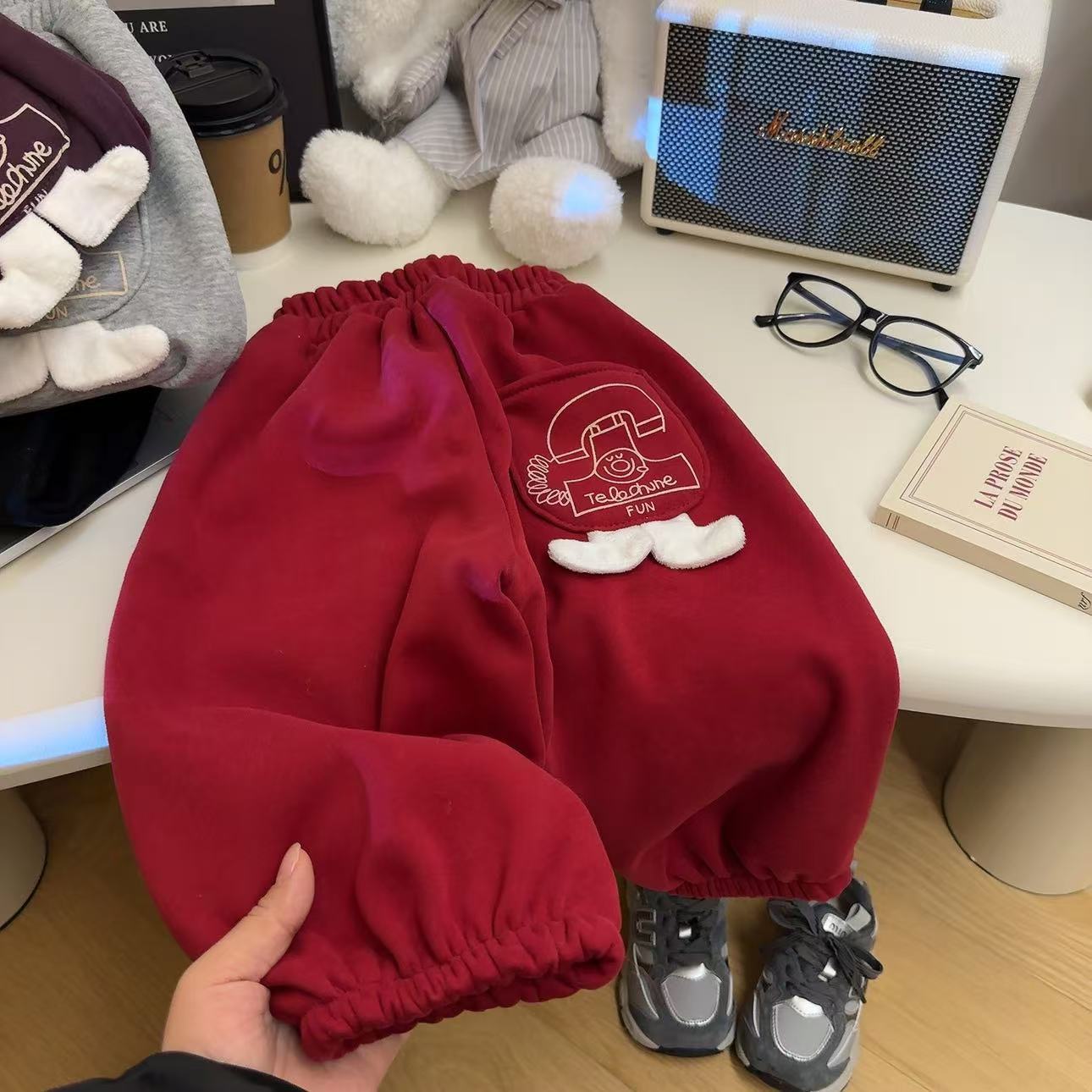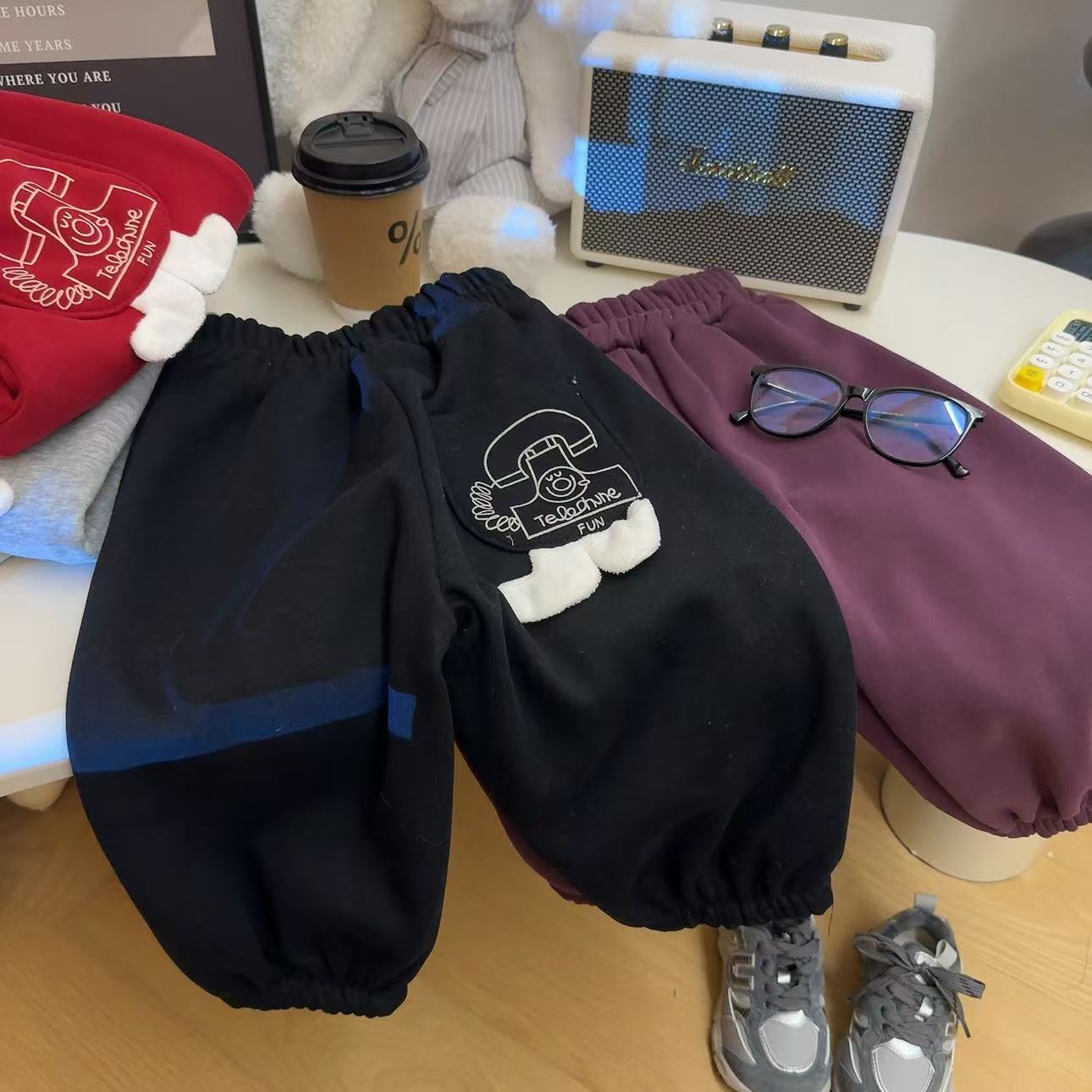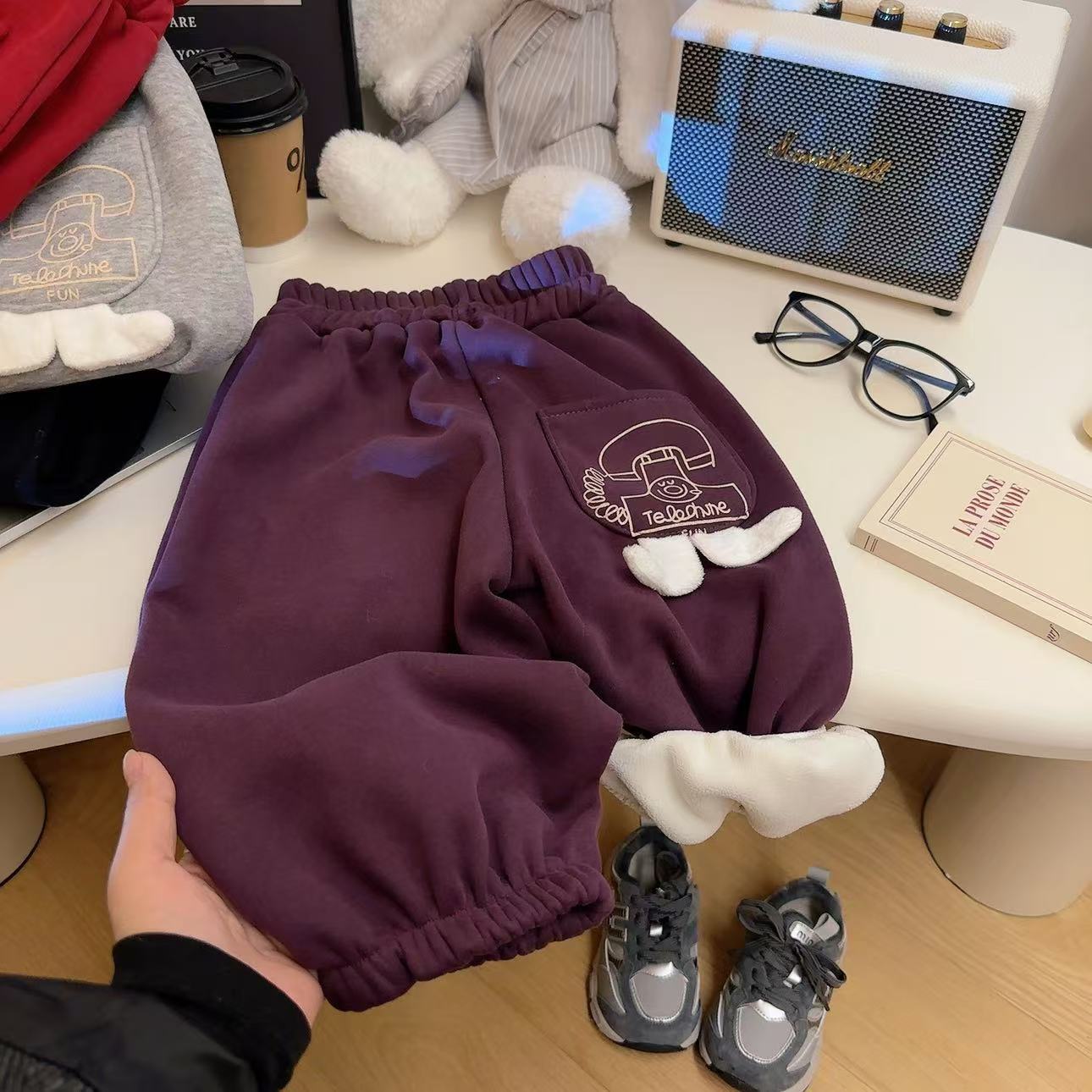 어린이 가을과 겨울 새로운 3 차원 캐주얼 바지 2024 한국식 느슨한 운동복 올매치 서양식 양털 추가 바지 소년 소녀를위한 바지스토어 가기