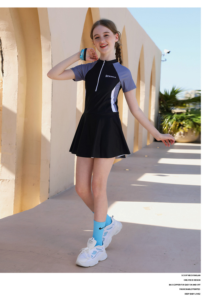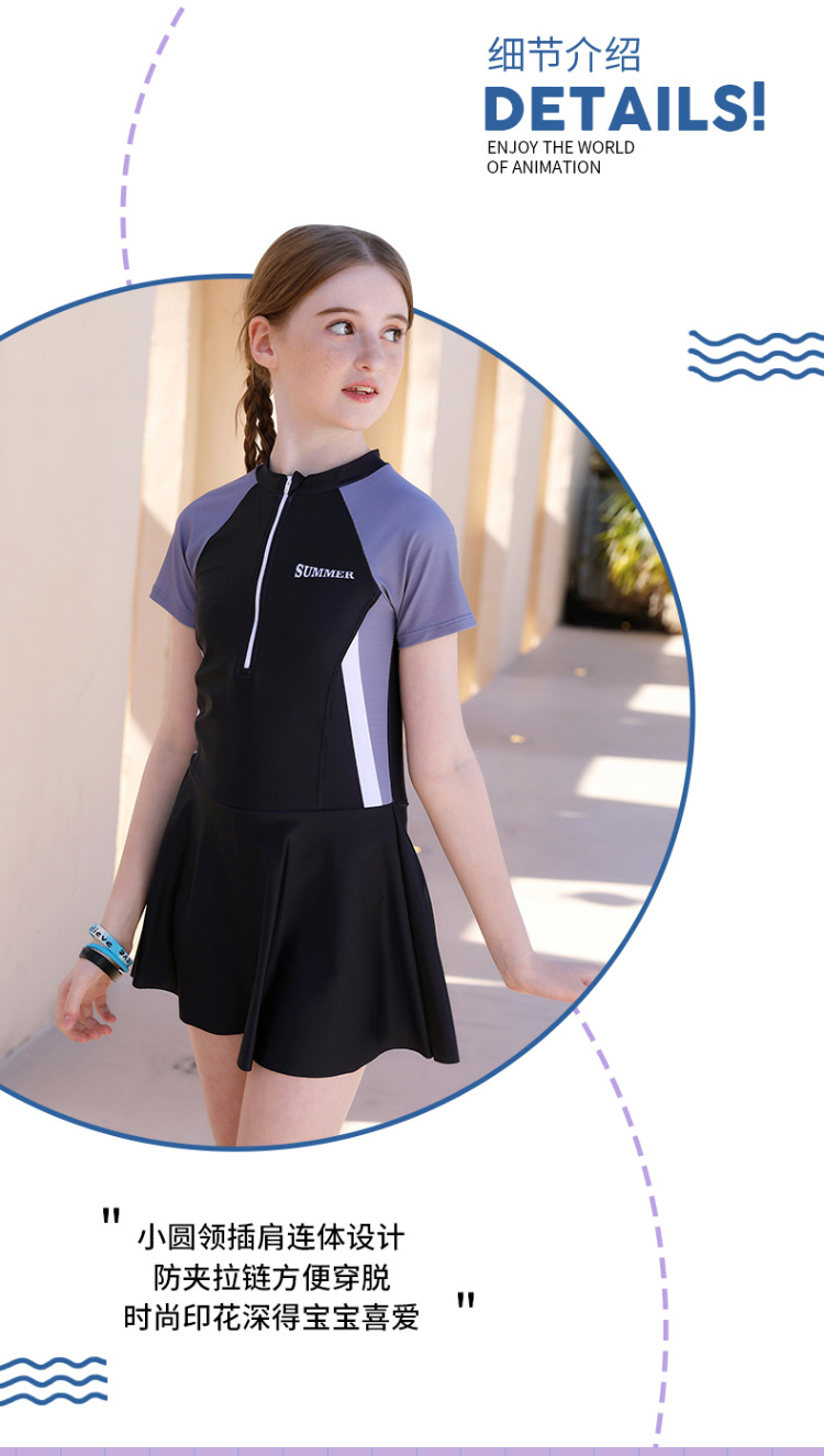 2024 새로운 국경 한국 스타일 원피스 스커트 보수 복서 수영 트렁크 선 스크린 하프 슬리브 스포츠 어린이 수영 세트 여성스토어 가기