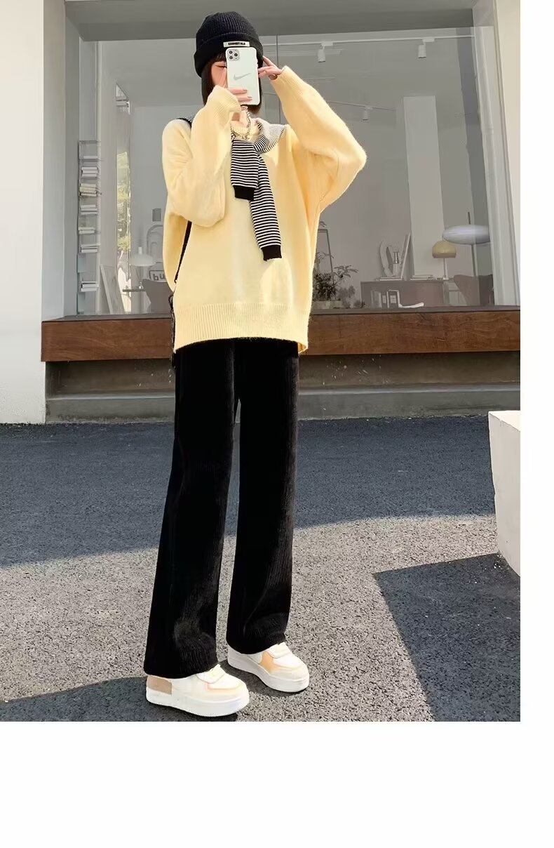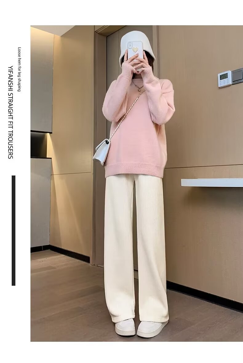 수직 스트라이프 체닐 와이드 레그 바지 여성 가을 및 겨울 새로운 높은 허리 투약 느슨한 직선 캐주얼 기모 바지