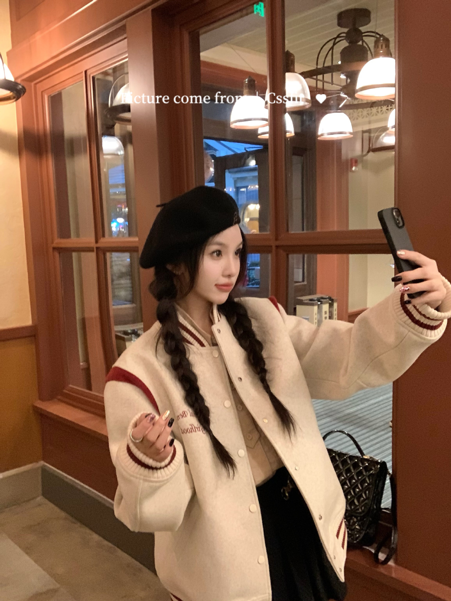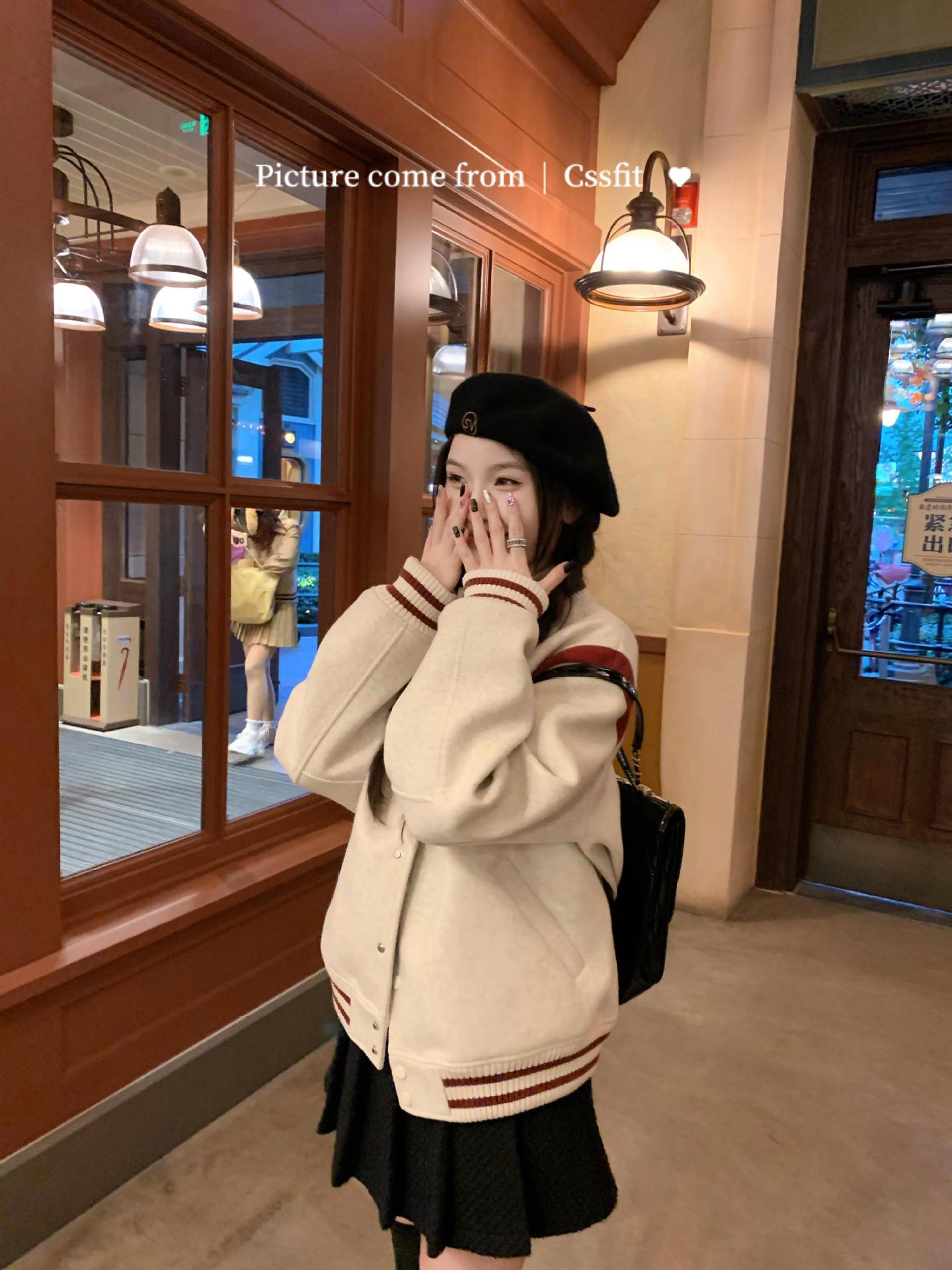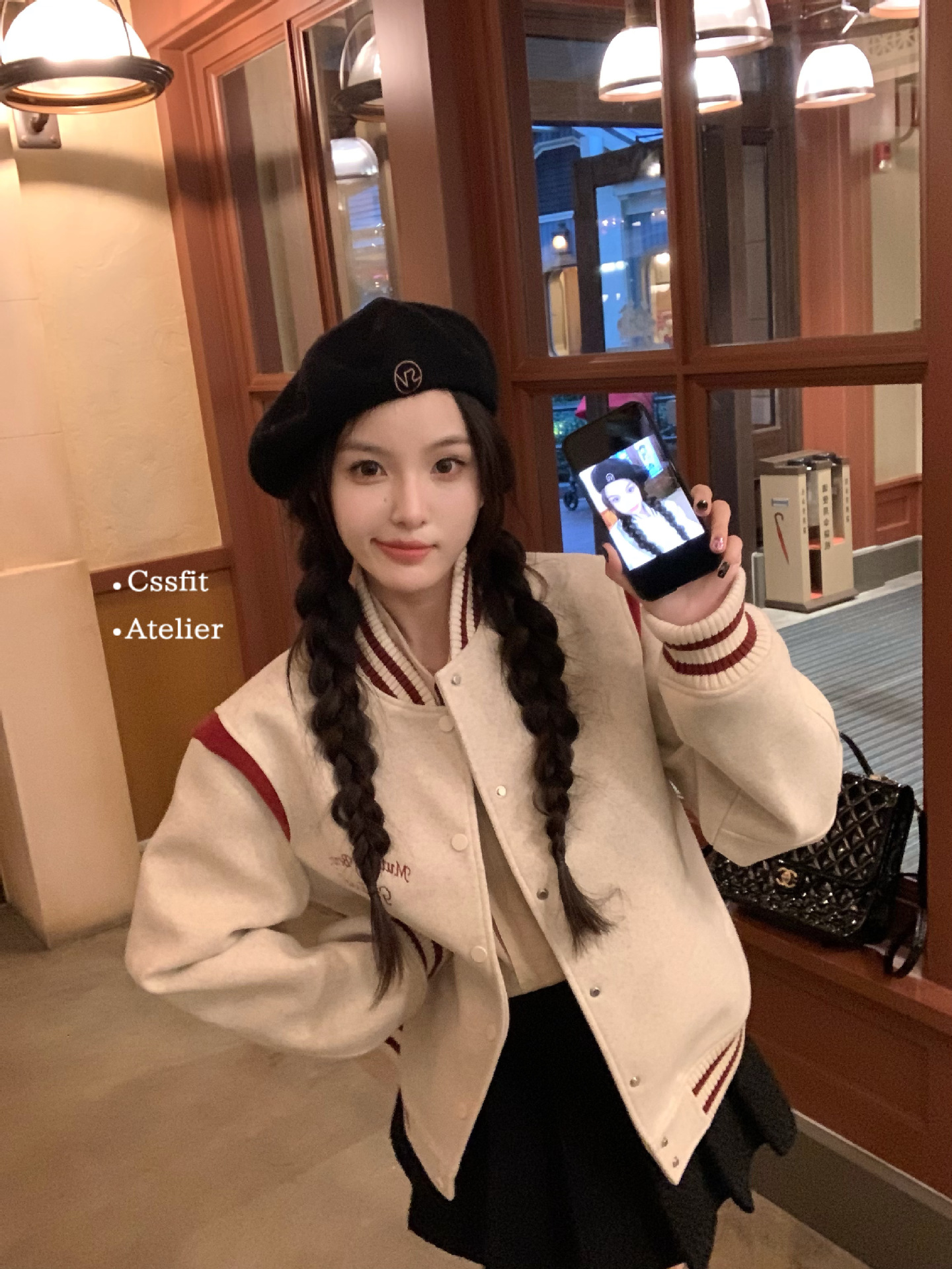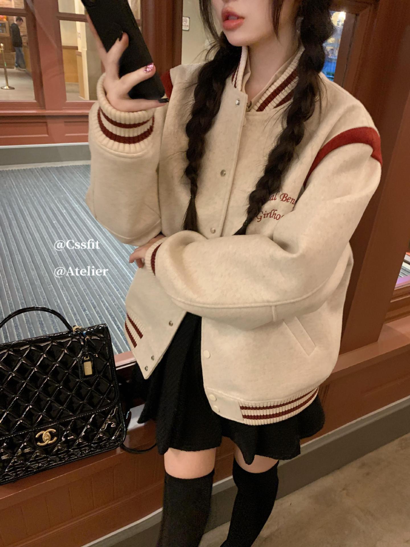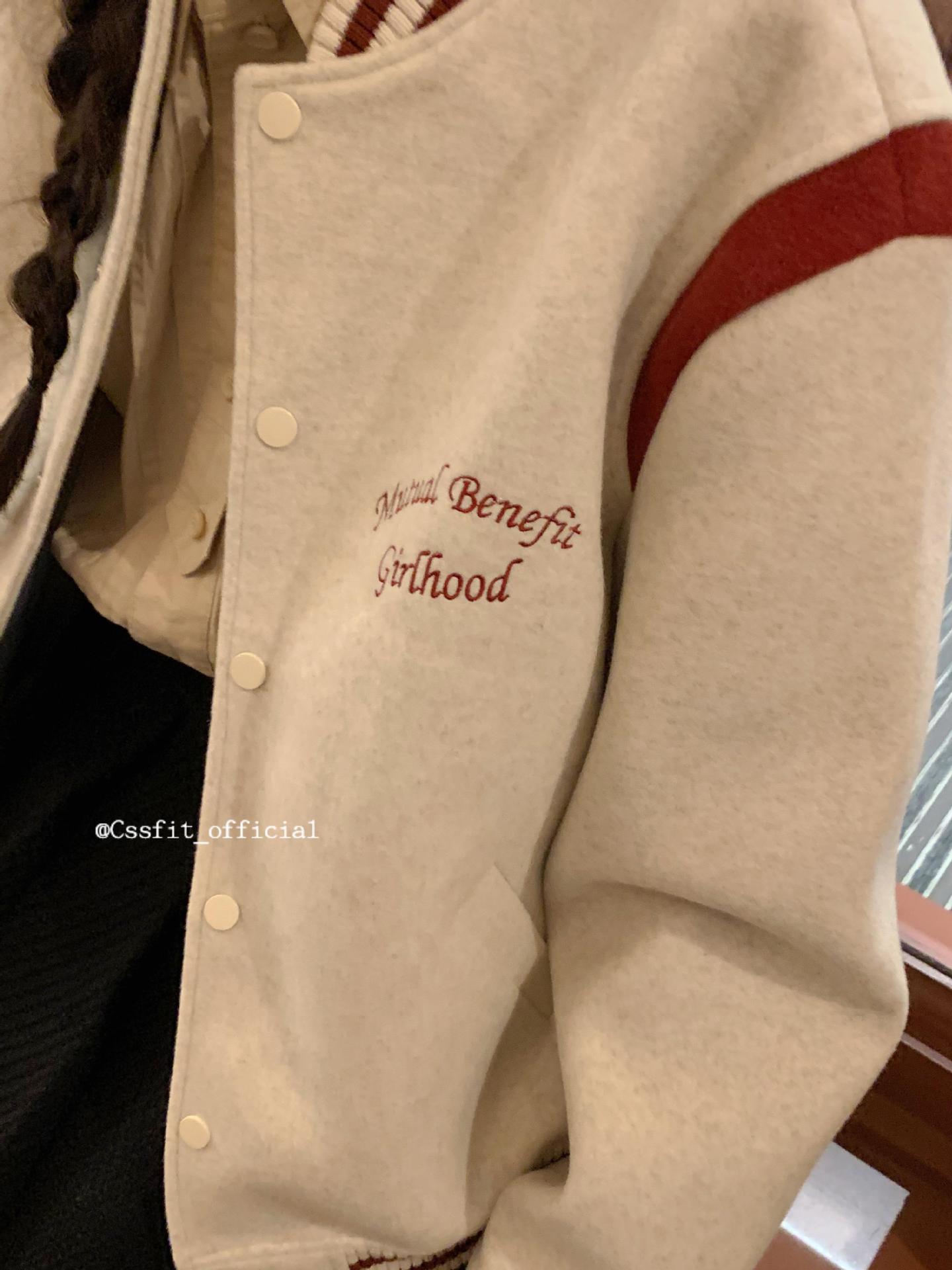 야구 세트 코트 수 놓은 봄과 가을 여자 재킷 양모 탑 새로운 느슨한 한국 스타일 2024 유행 편지 미국 스타일스토어 가기
