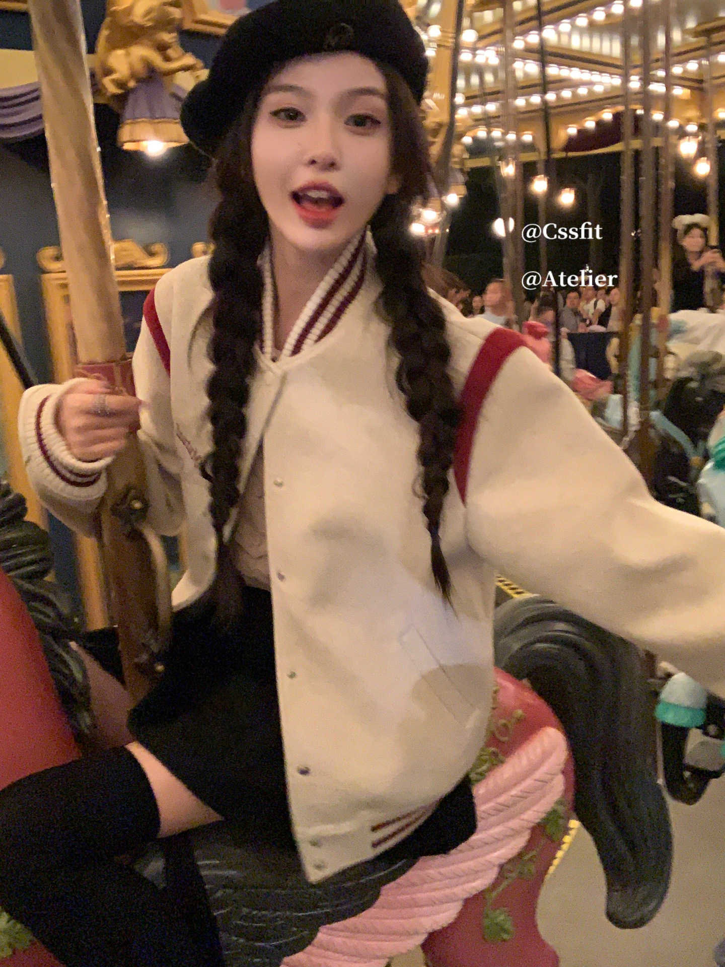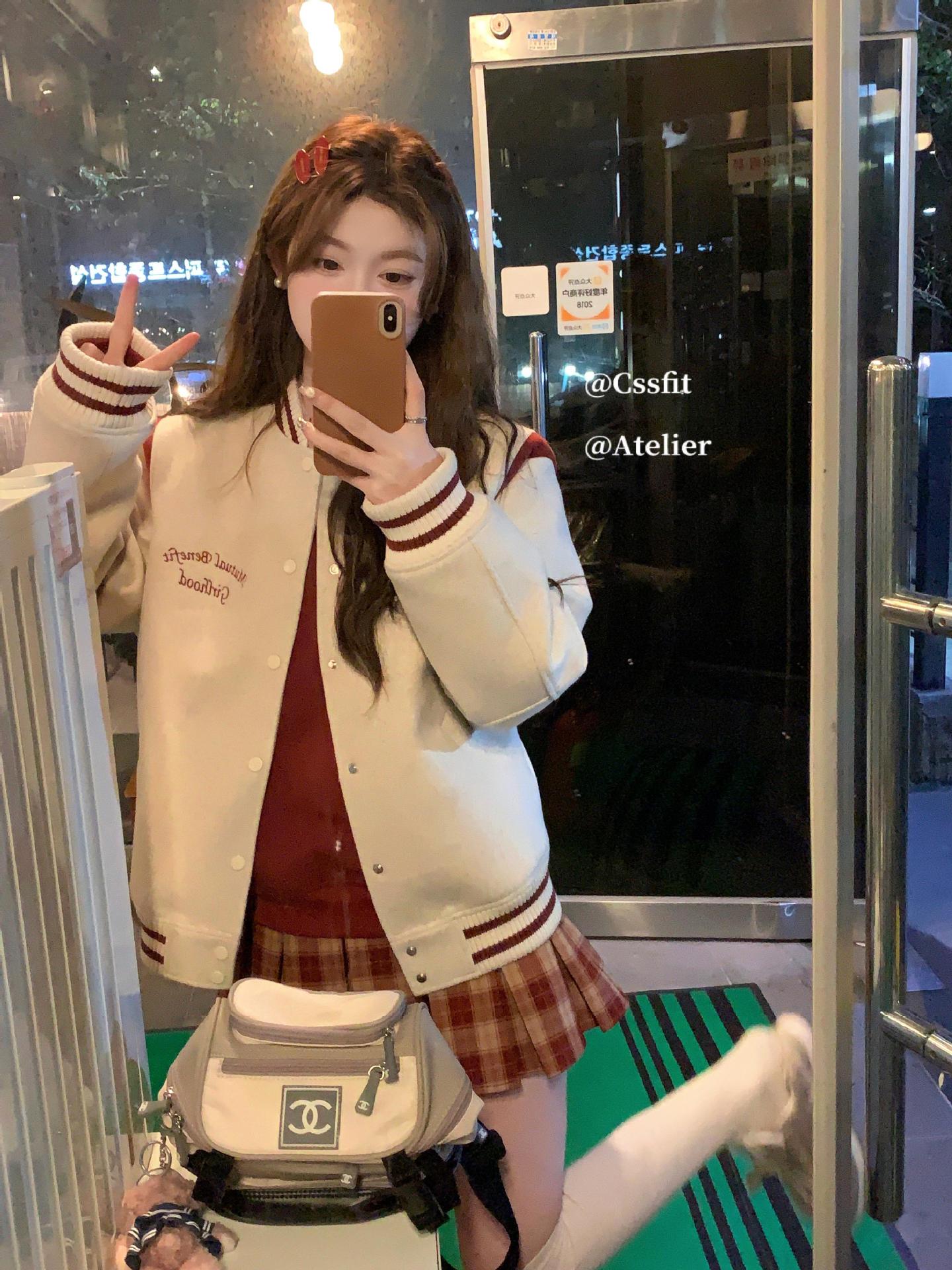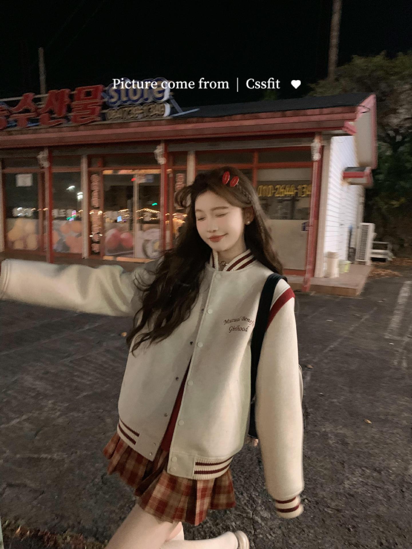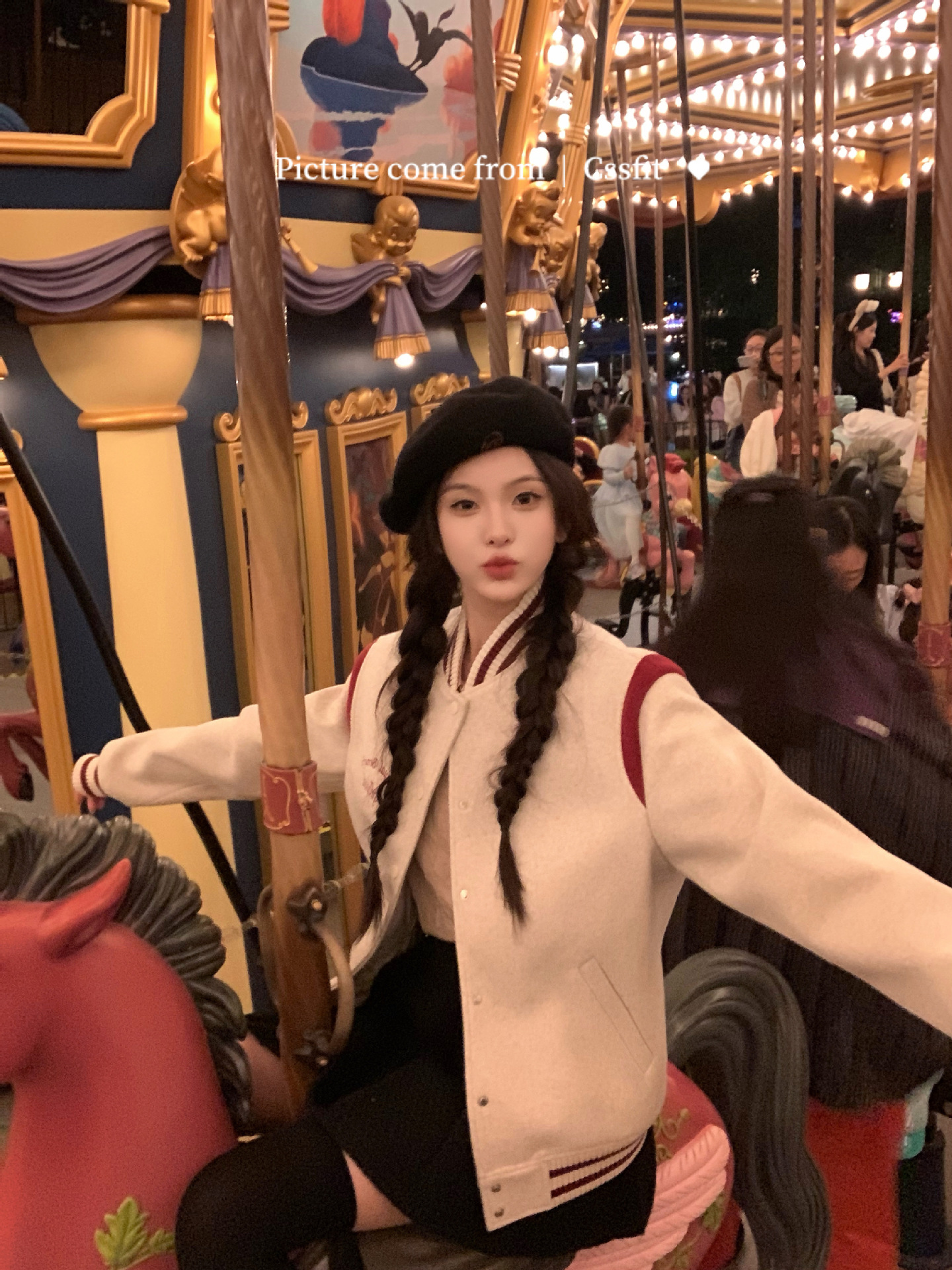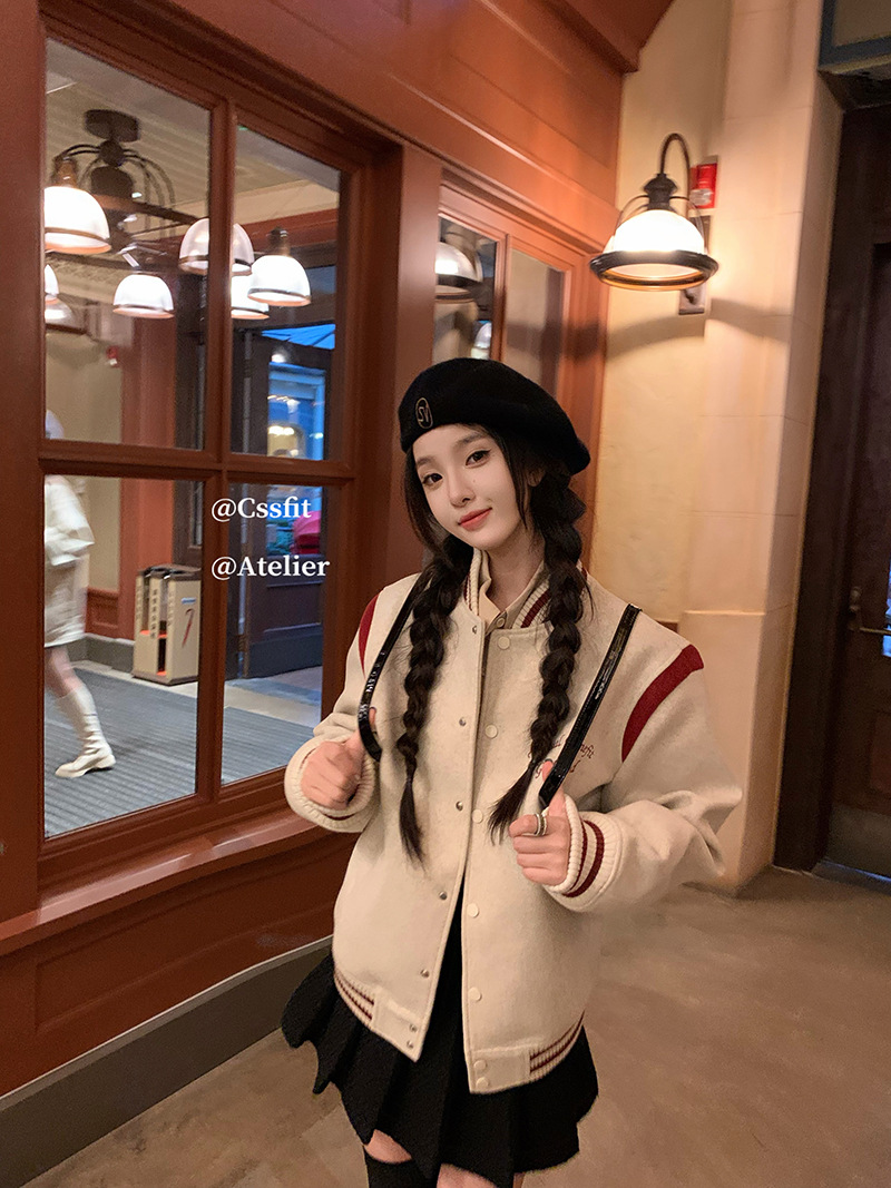 야구 세트 코트 수 놓은 봄과 가을 여자 재킷 양모 탑 새로운 느슨한 한국 스타일 2024 유행 편지 미국 스타일스토어 가기