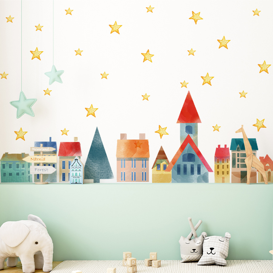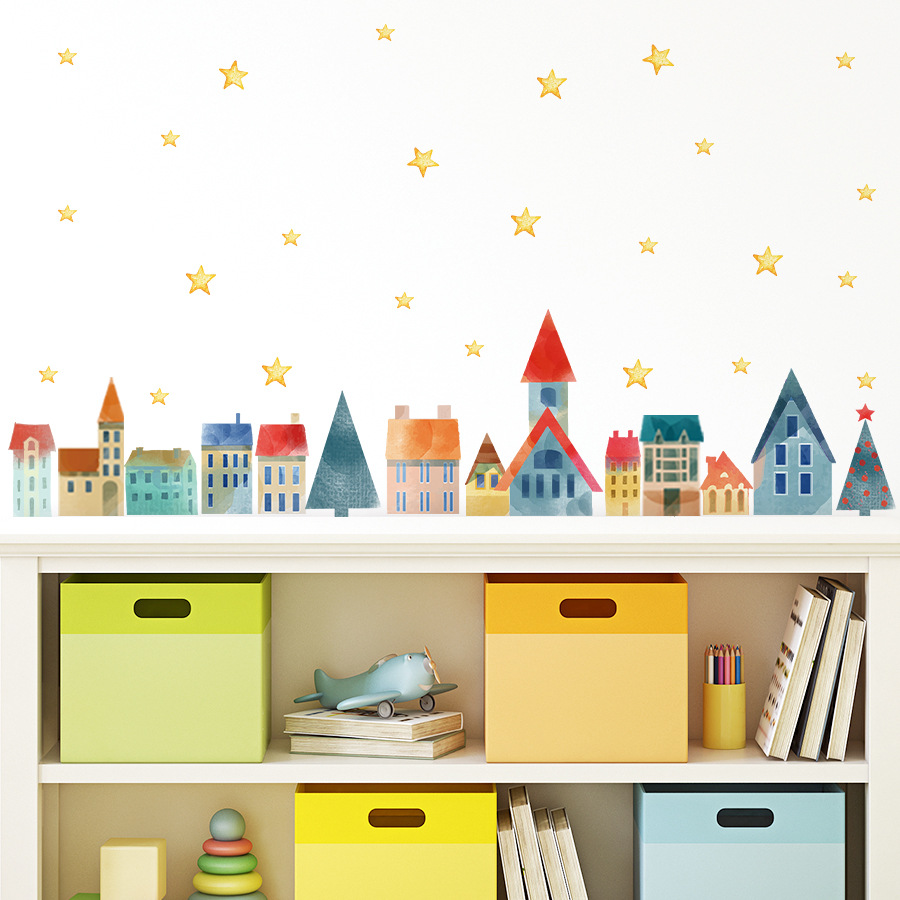 크리스마스 만화 스타 타운 자체 접착 벽 스티커 어린이 방 거실 배경 벽 장식 스티커 ZN3210F