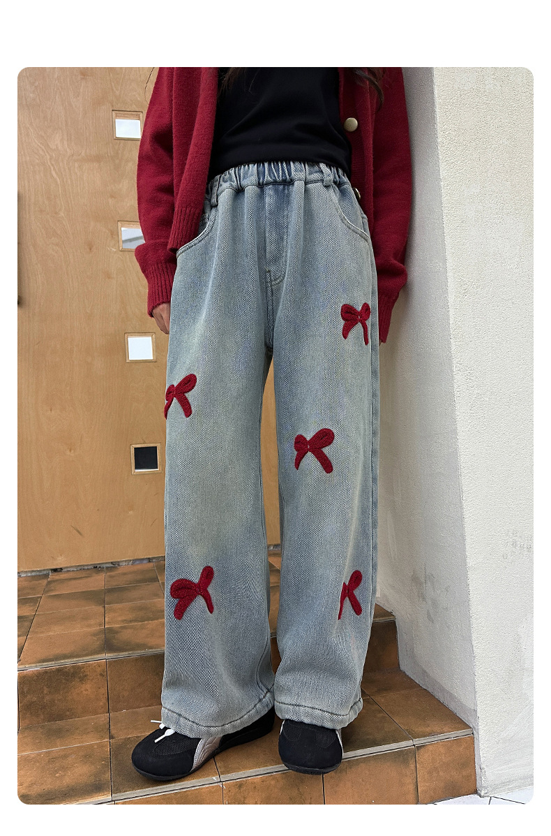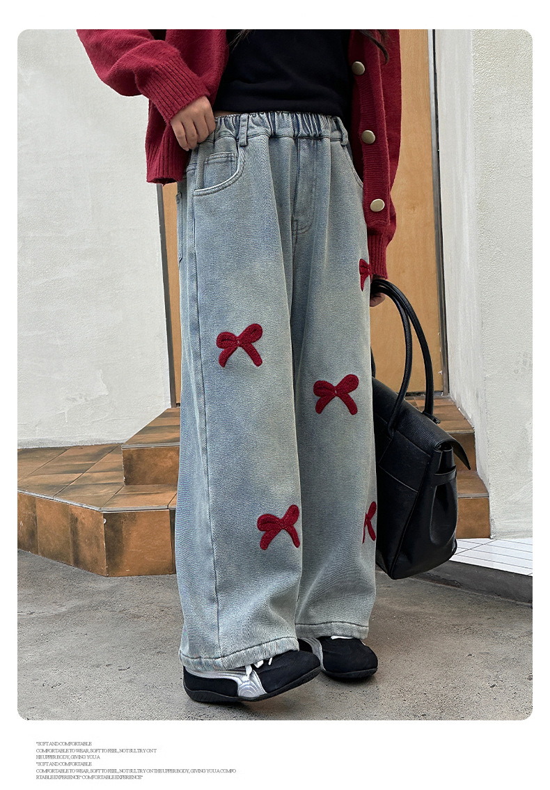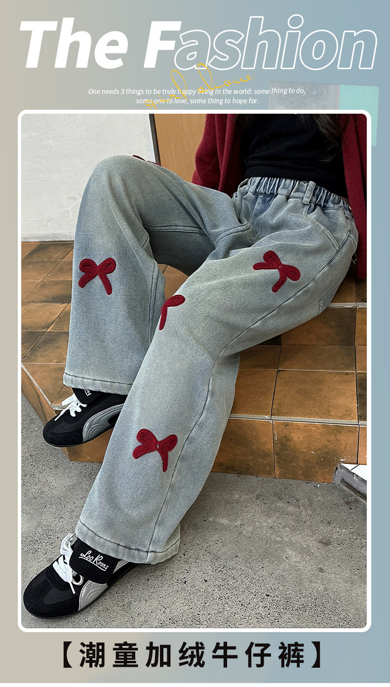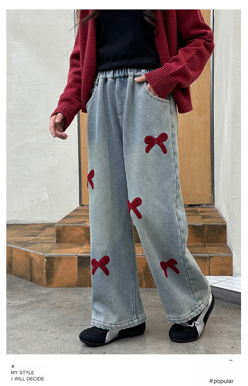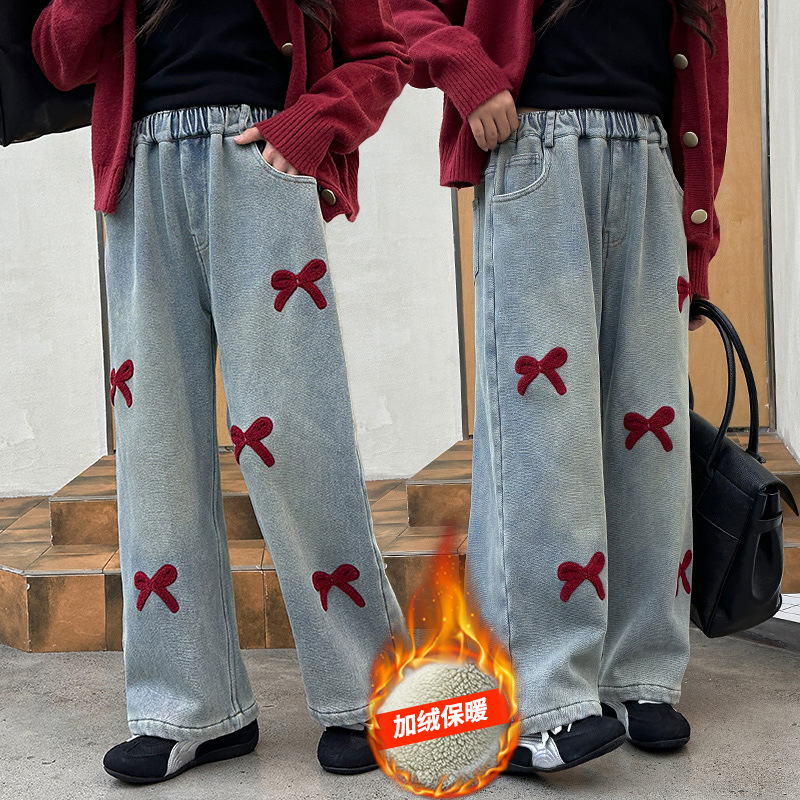 소녀 청바지 기모 가을과 겨울 2024 새로운 소녀 겨울 넓은 다리 바지 겨울 두꺼운 어린이 바지스토어 가기