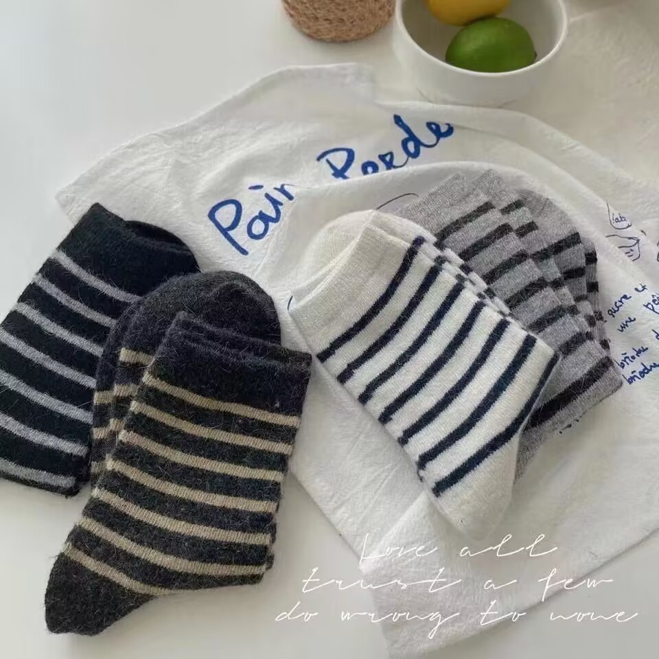 가을과 겨울 슈퍼 두꺼운 울 봉제 양말 여성의 간단한 색상 매칭 스트라이프 빈티지면 양말 다목적 중간 두꺼운 양말스토어 가기
