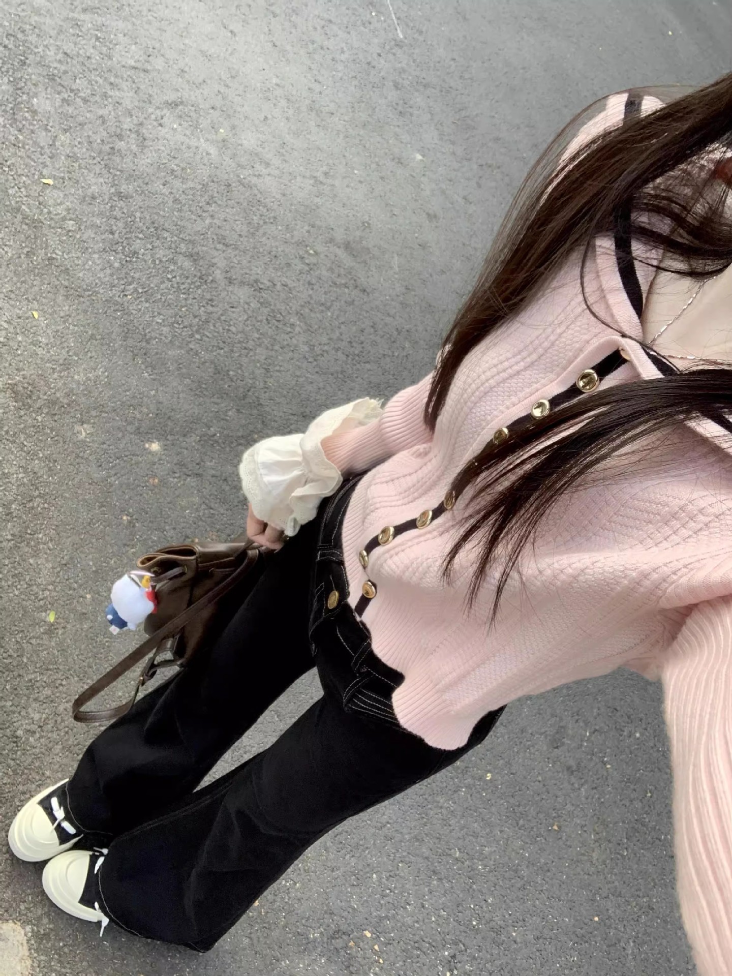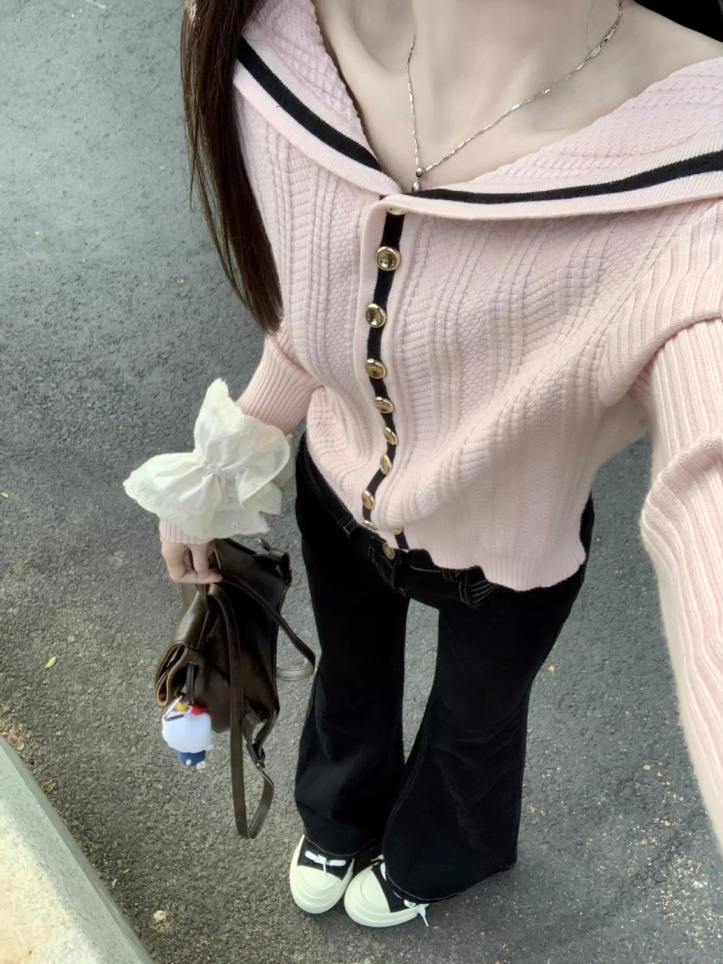 해군 칼라 핑크 오프 숄더 스웨터 카디건 여성 가을 및 겨울 새로운 달콤한 시대 감소 니트 쇼트 탑 코트스토어 가기