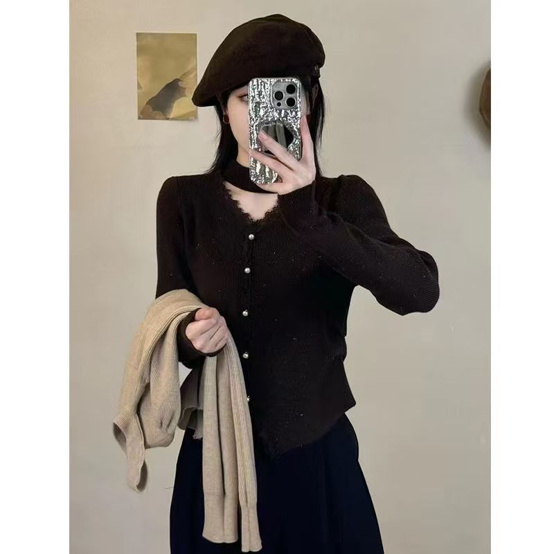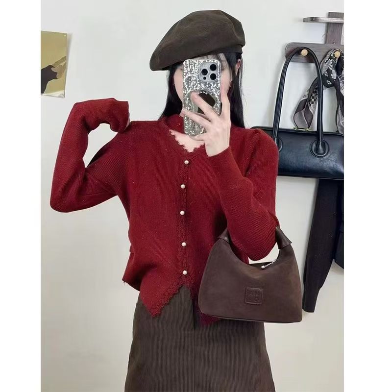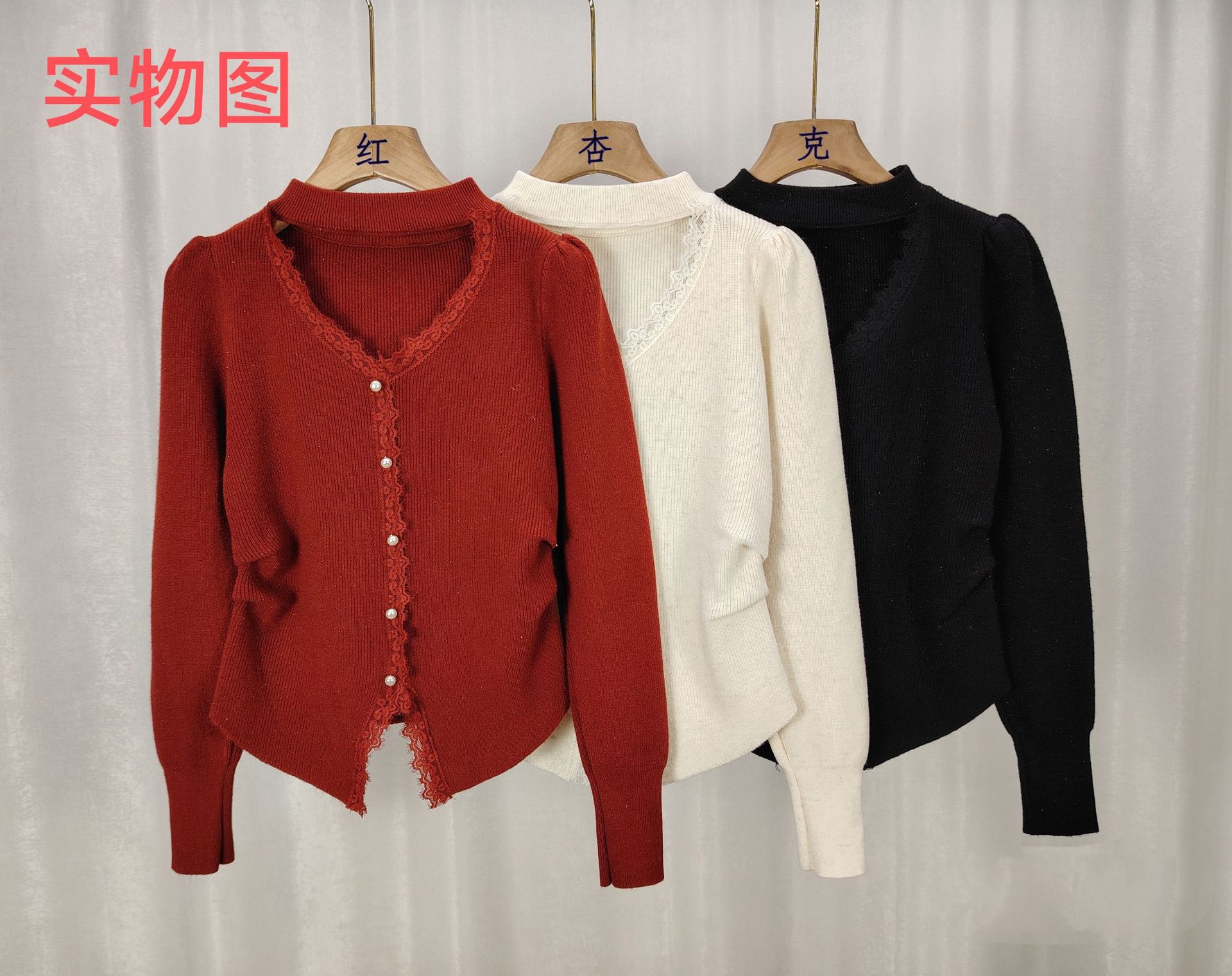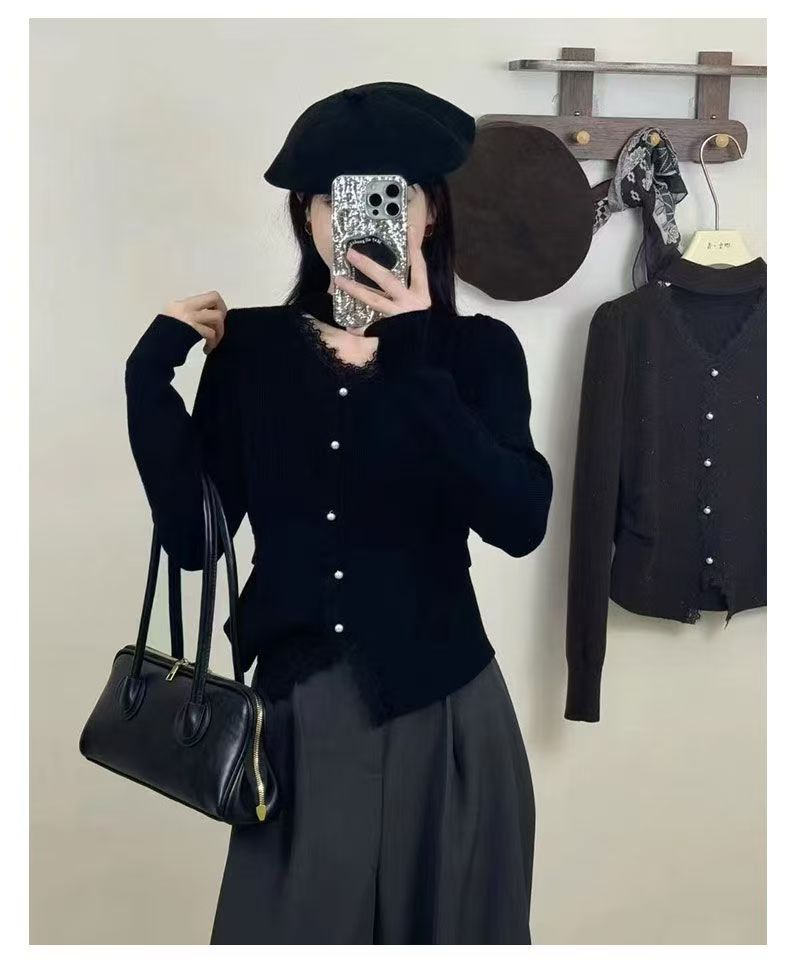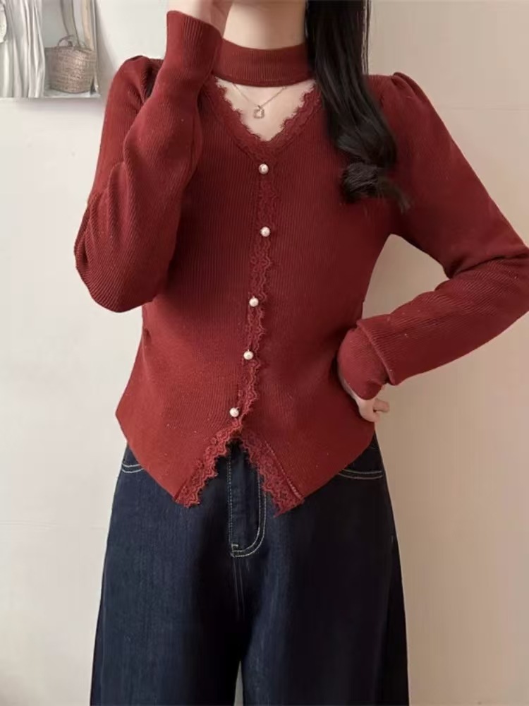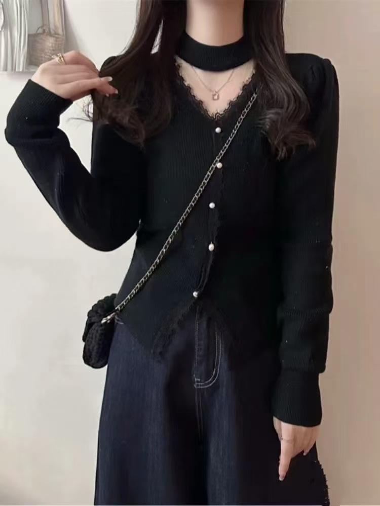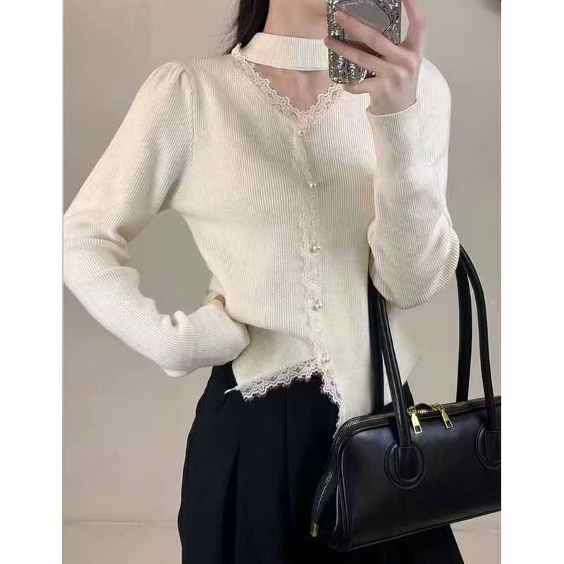 가을과 겨울 새로운 프랑스 스타일 부드러운 스타일 레이스 바느질 니트 스웨터 여성의 짧은 슬림 핏 올 매치 탑스토어 가기