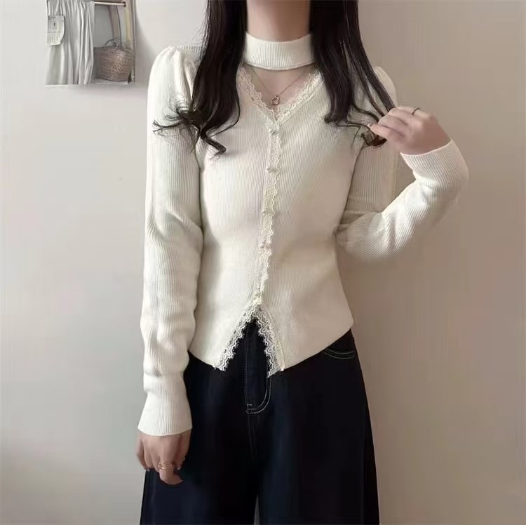 가을과 겨울 새로운 프랑스 스타일 부드러운 스타일 레이스 바느질 니트 스웨터 여성의 짧은 슬림 핏 올 매치 탑