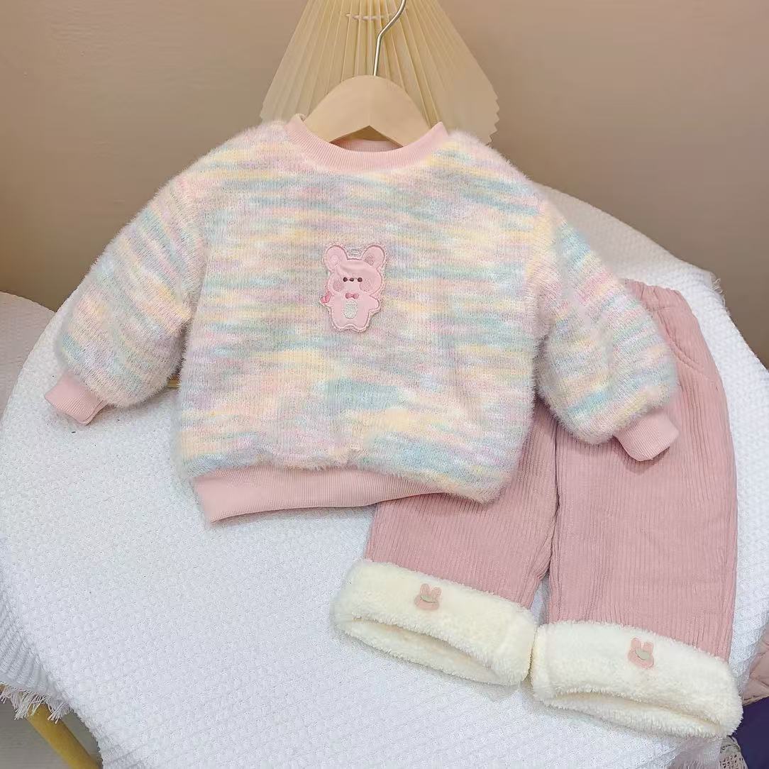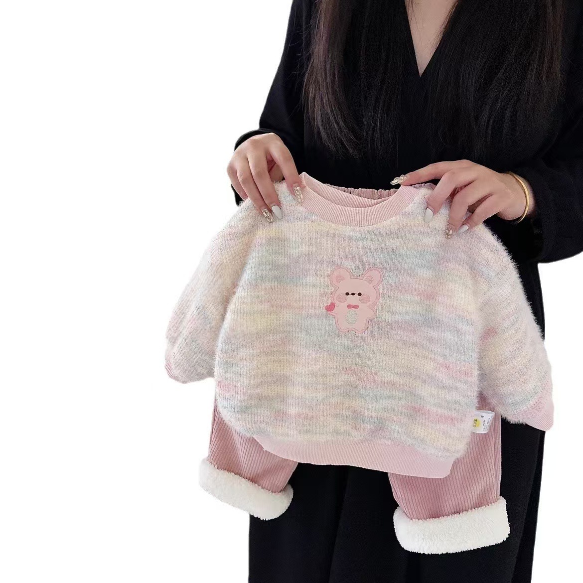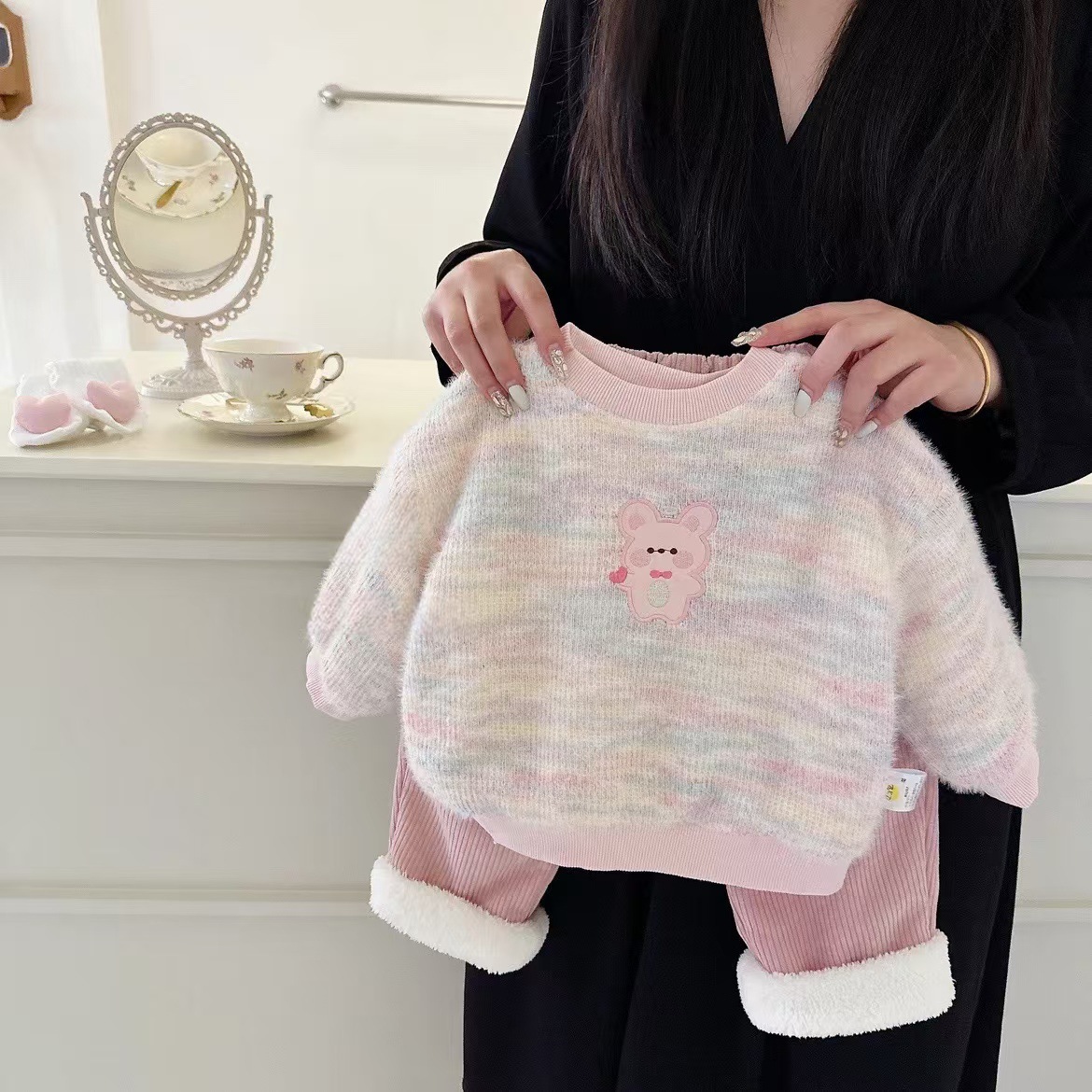 여자 2024 겨울 새로운 한국 사랑 기모 두껍게 세트 아기 소녀 새로운 스웨터 캐주얼 바지 투피스 세트
