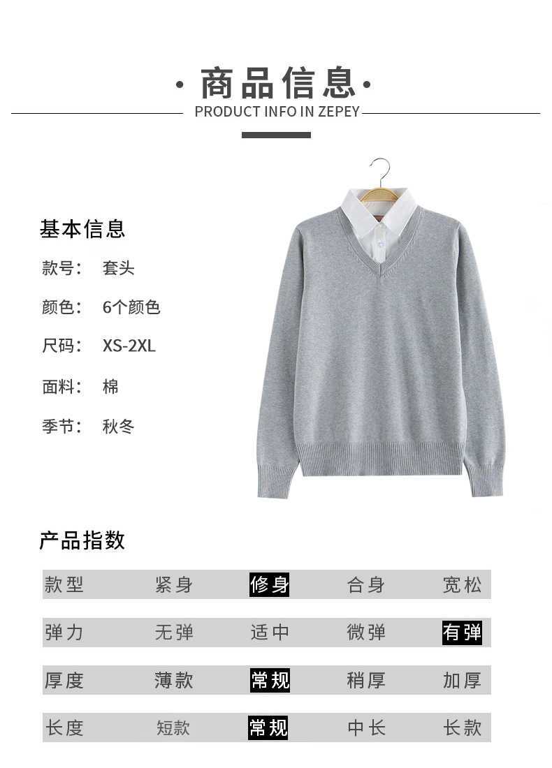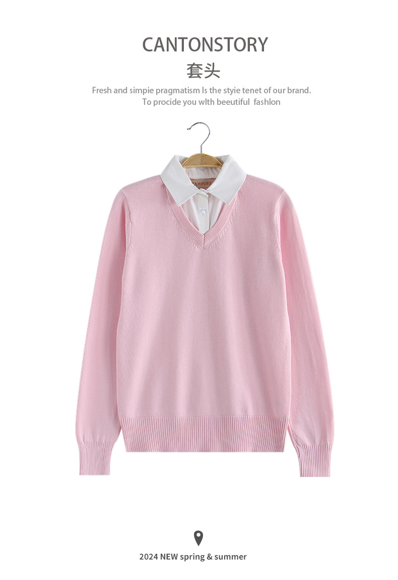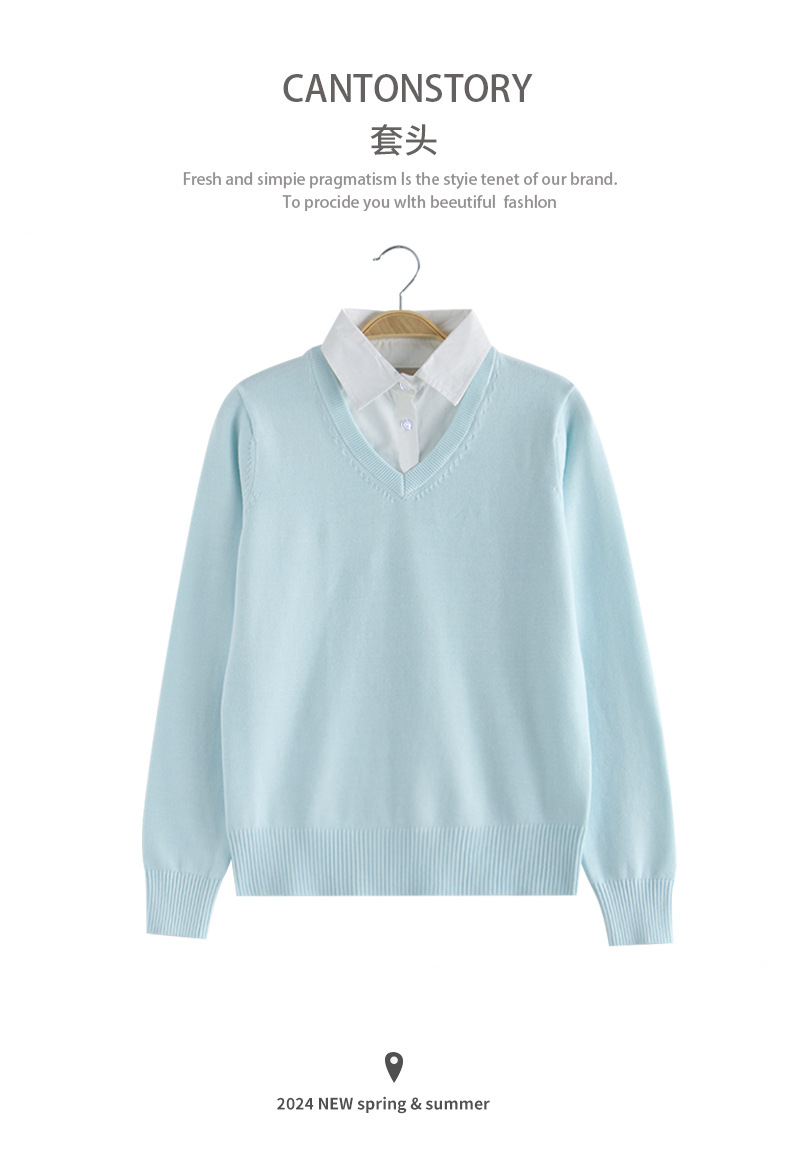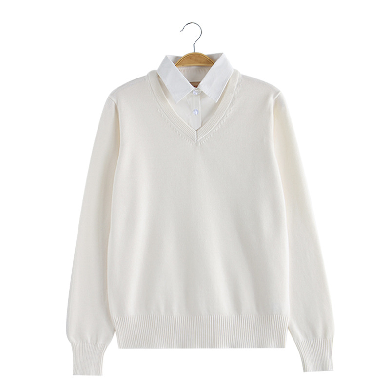 Chuandao 가을과 겨울 JK 유니폼 풀오버 스웨터 여성 일본식 솔리드 컬러 V 넥 니트 스웨터 긴 소매 가짜 두 조각