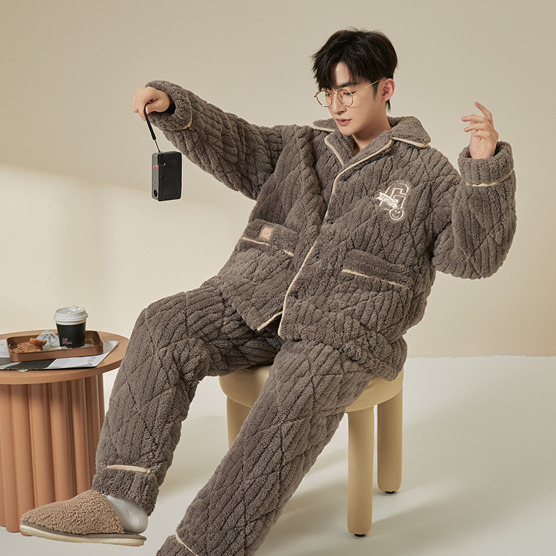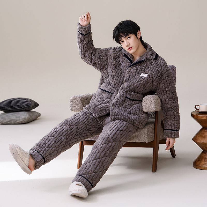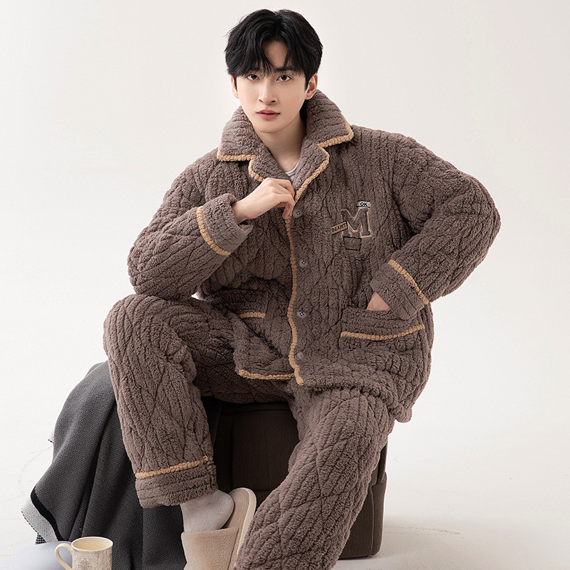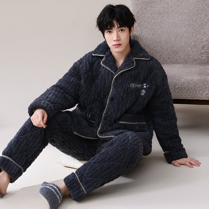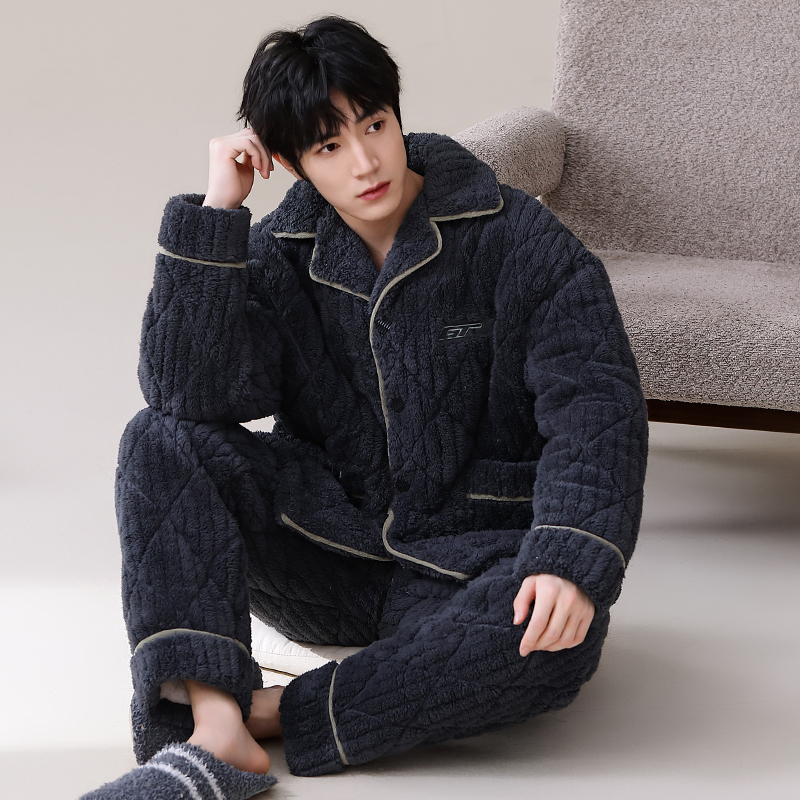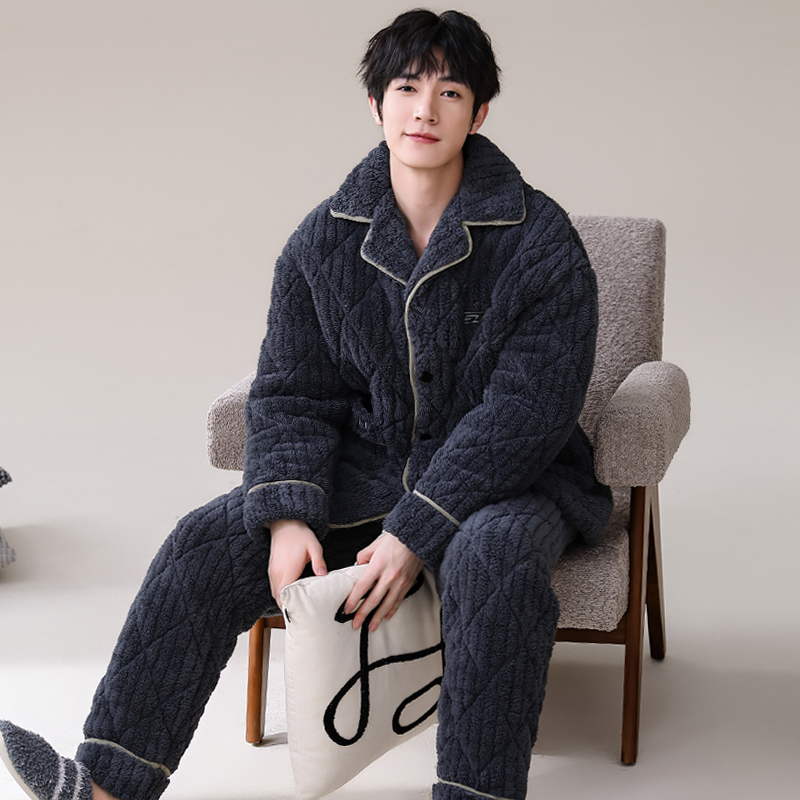 男士睡衣冬季珊瑚绒加绒加厚三层夹棉保暖秋冬款宽松青少年家居服