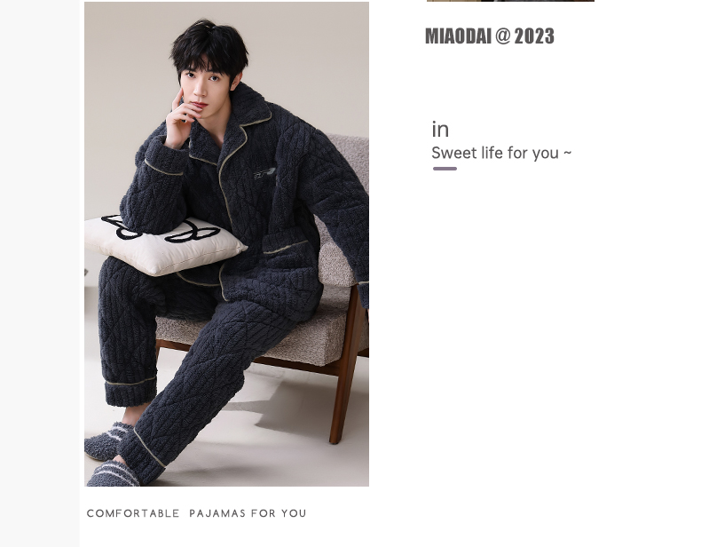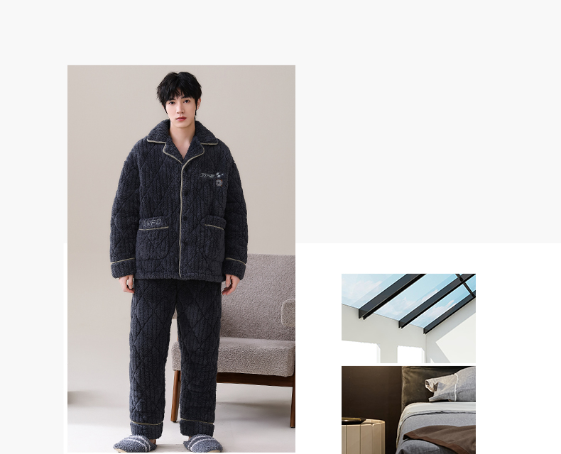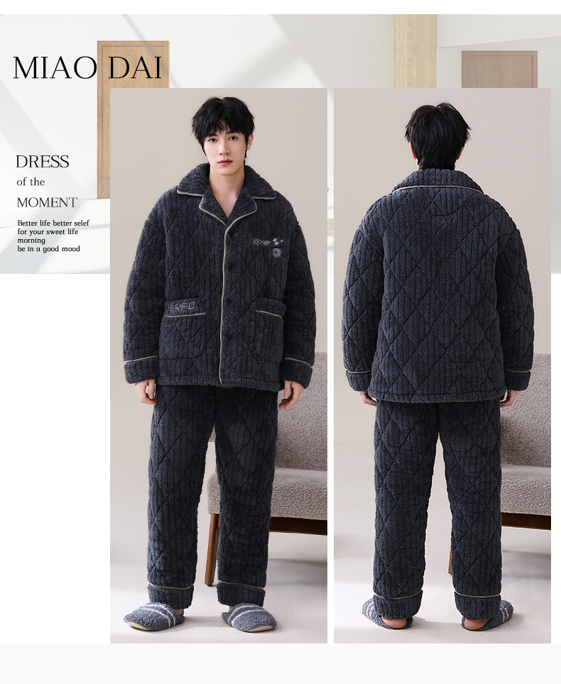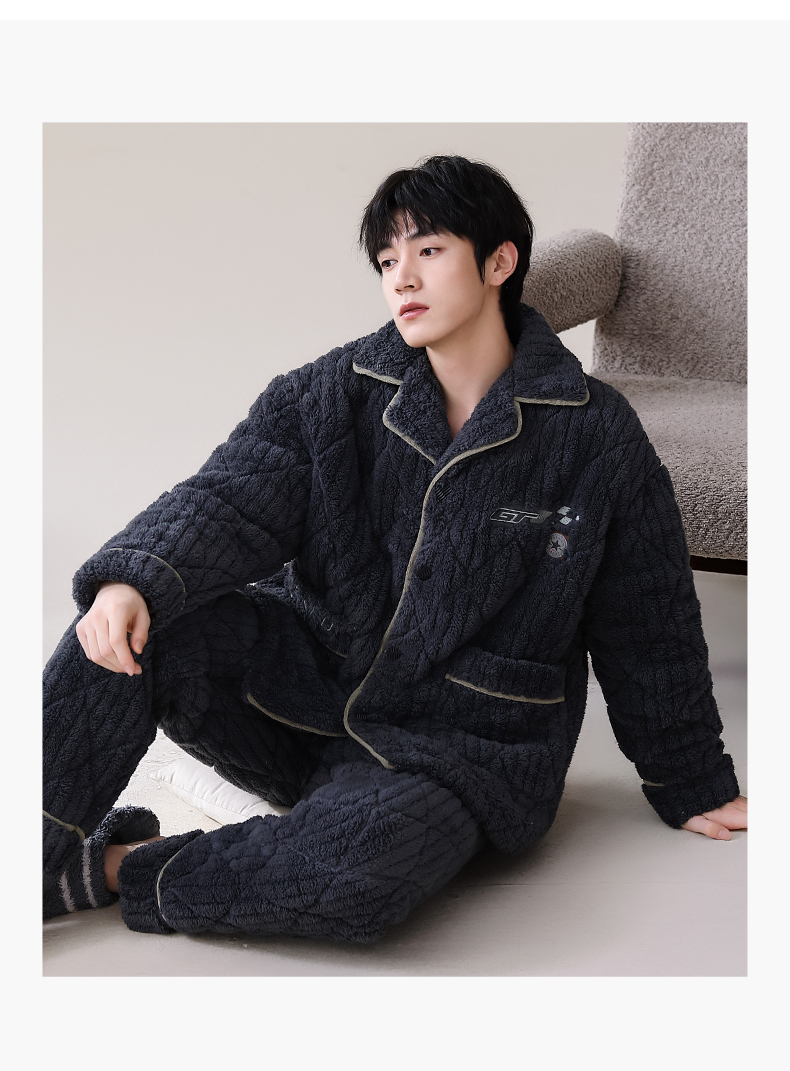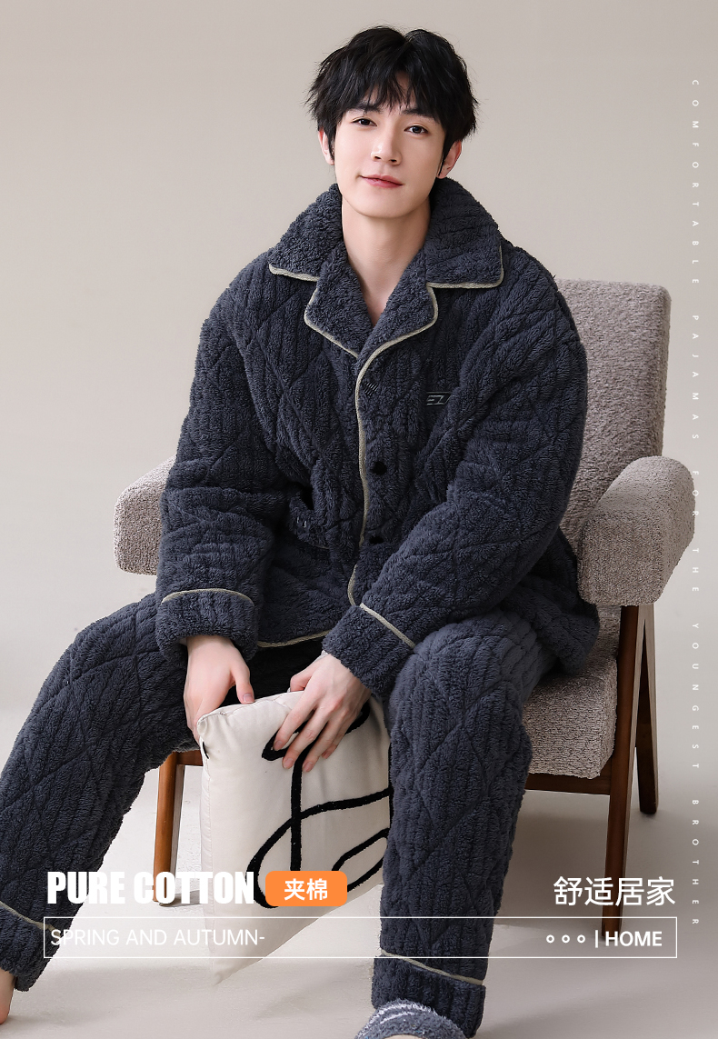男士睡衣冬季珊瑚绒加绒加厚三层夹棉保暖秋冬款宽松青少年家居服