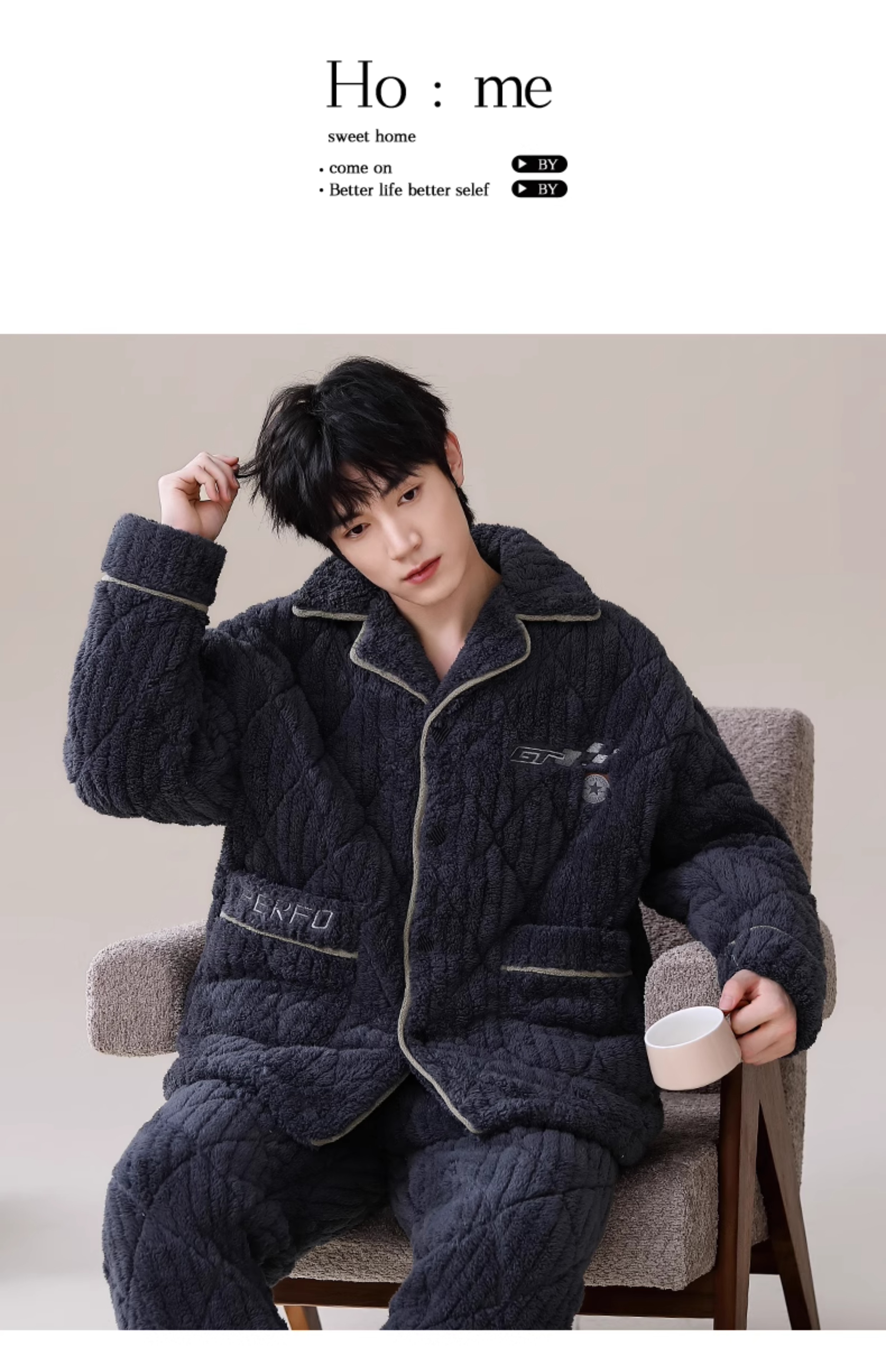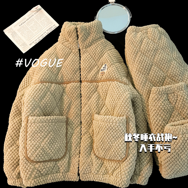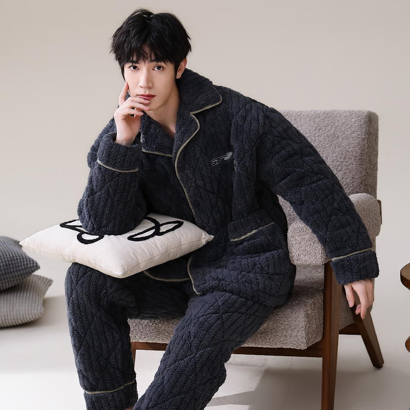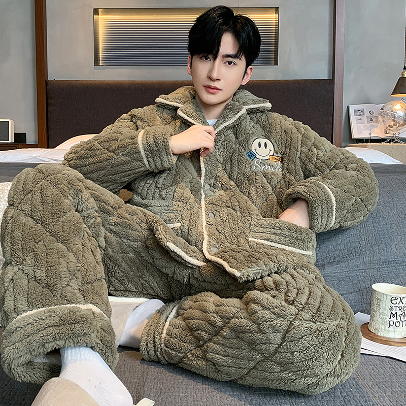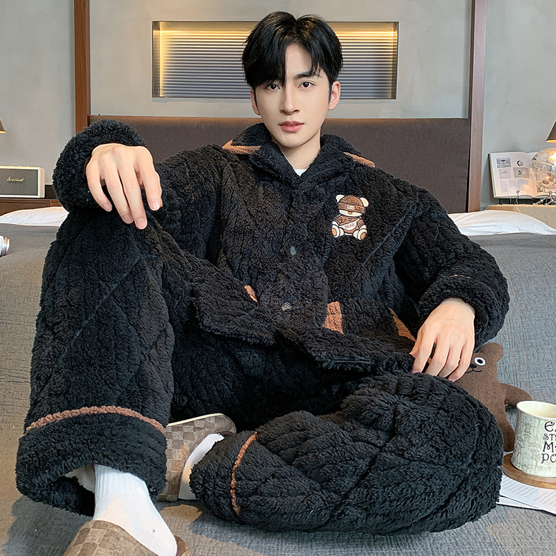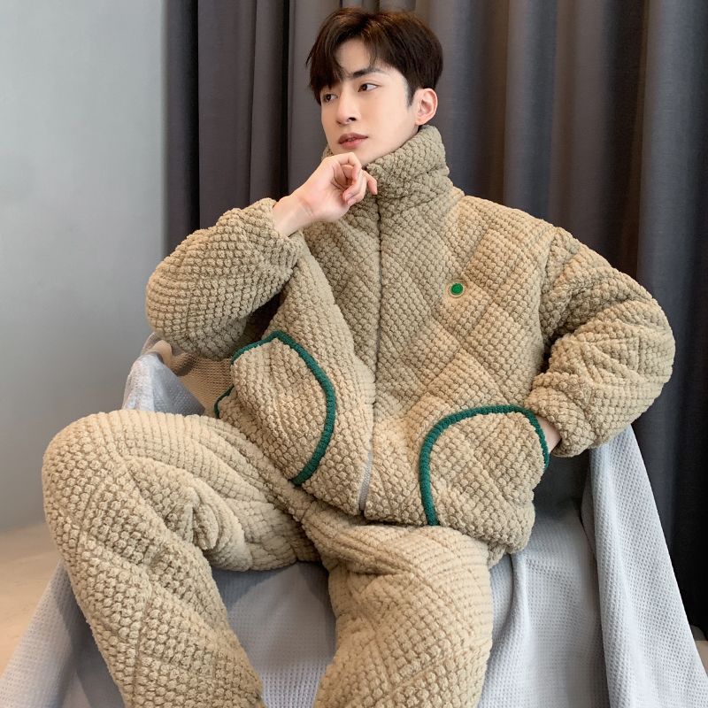 남자 잠옷 겨울 산호 양털 기모 가을과 겨울을위한 두꺼운 3 층 면 따뜻한 느슨한 청소년 홈 옷
