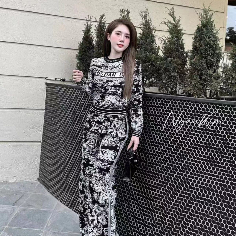 가을과 겨울 새로운 풀오버 탑 둥근 목 편지 니트 동물 패턴 넓은 다리 바지 세트 2024 우아한 두 조각 세트스토어 가기