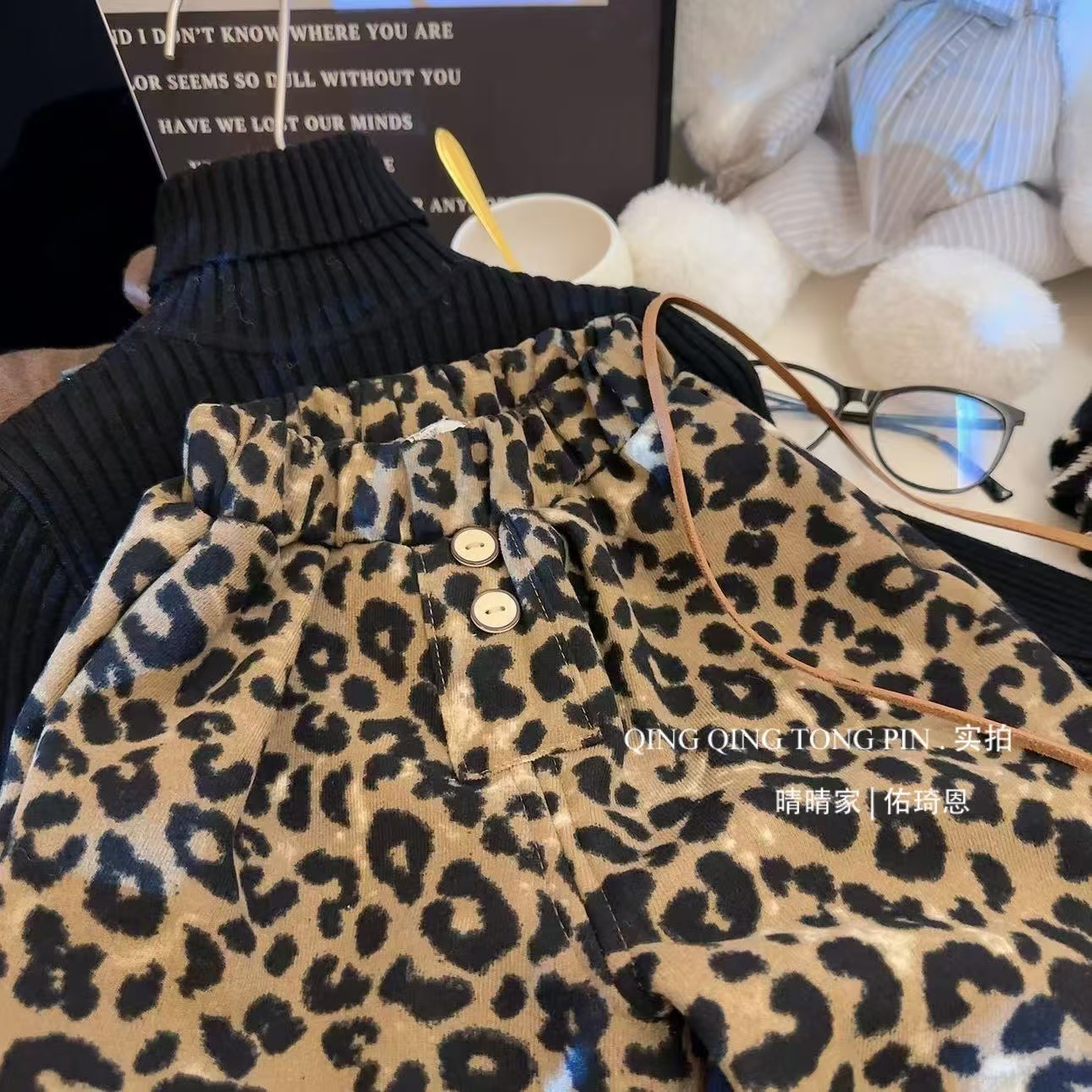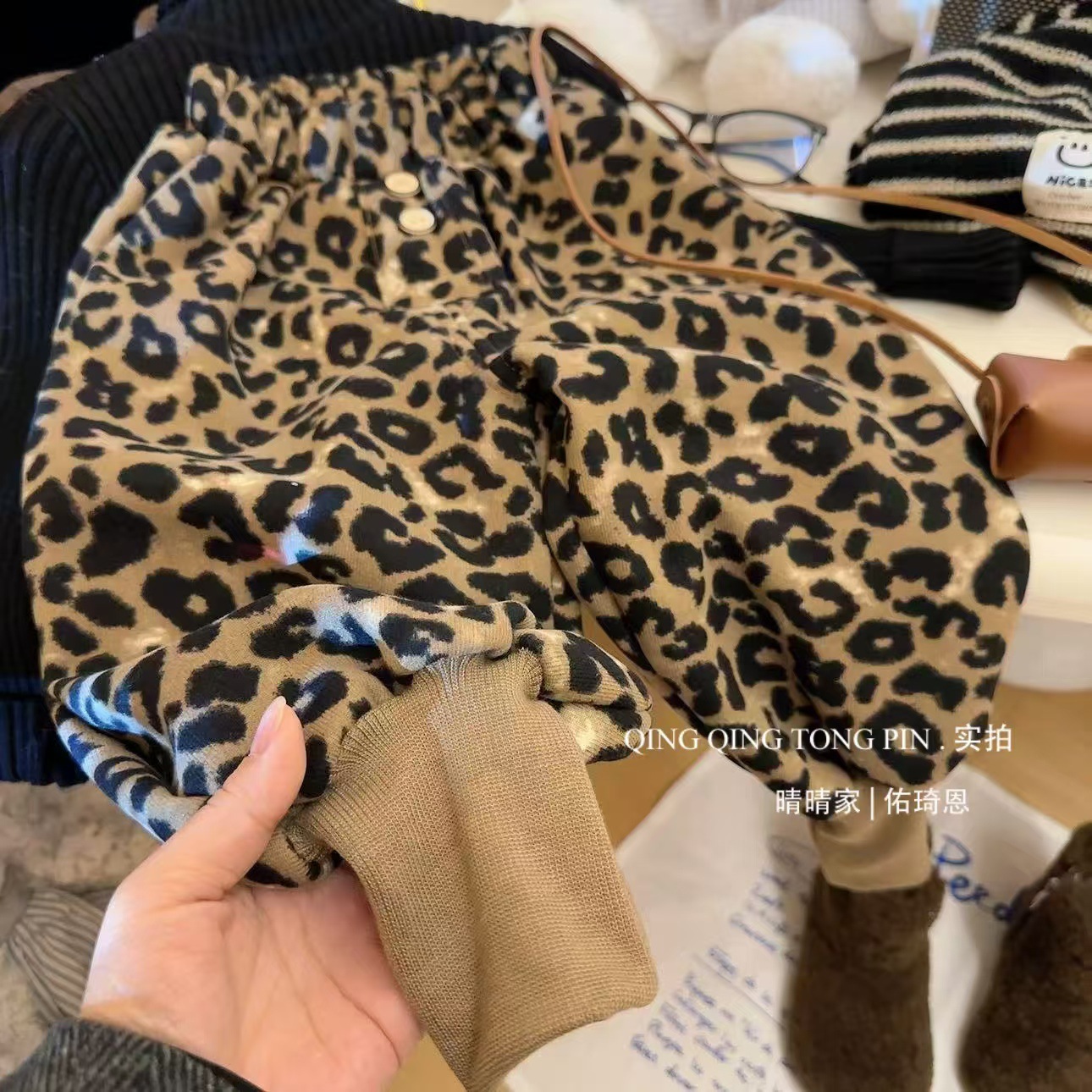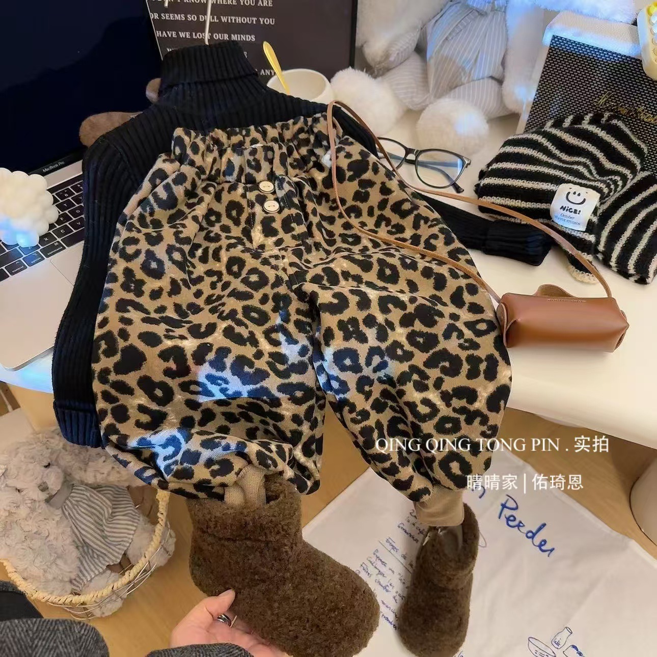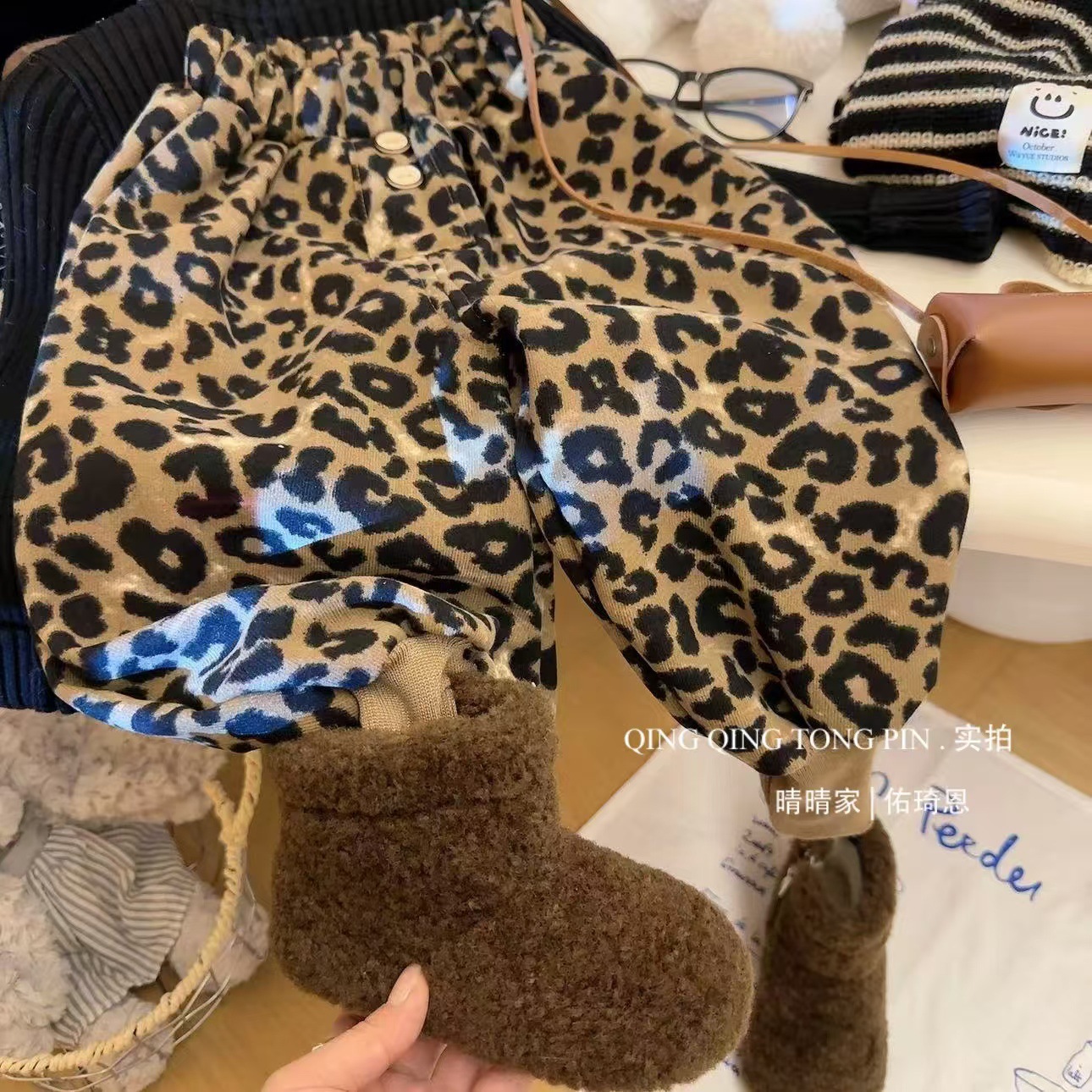 2024 가을과 겨울 새 여자 레오파드 바지 어린이 기모 두껍게 외주 캐주얼 바지 아기의 올 매치 웨스턴 스타일 바지스토어 가기