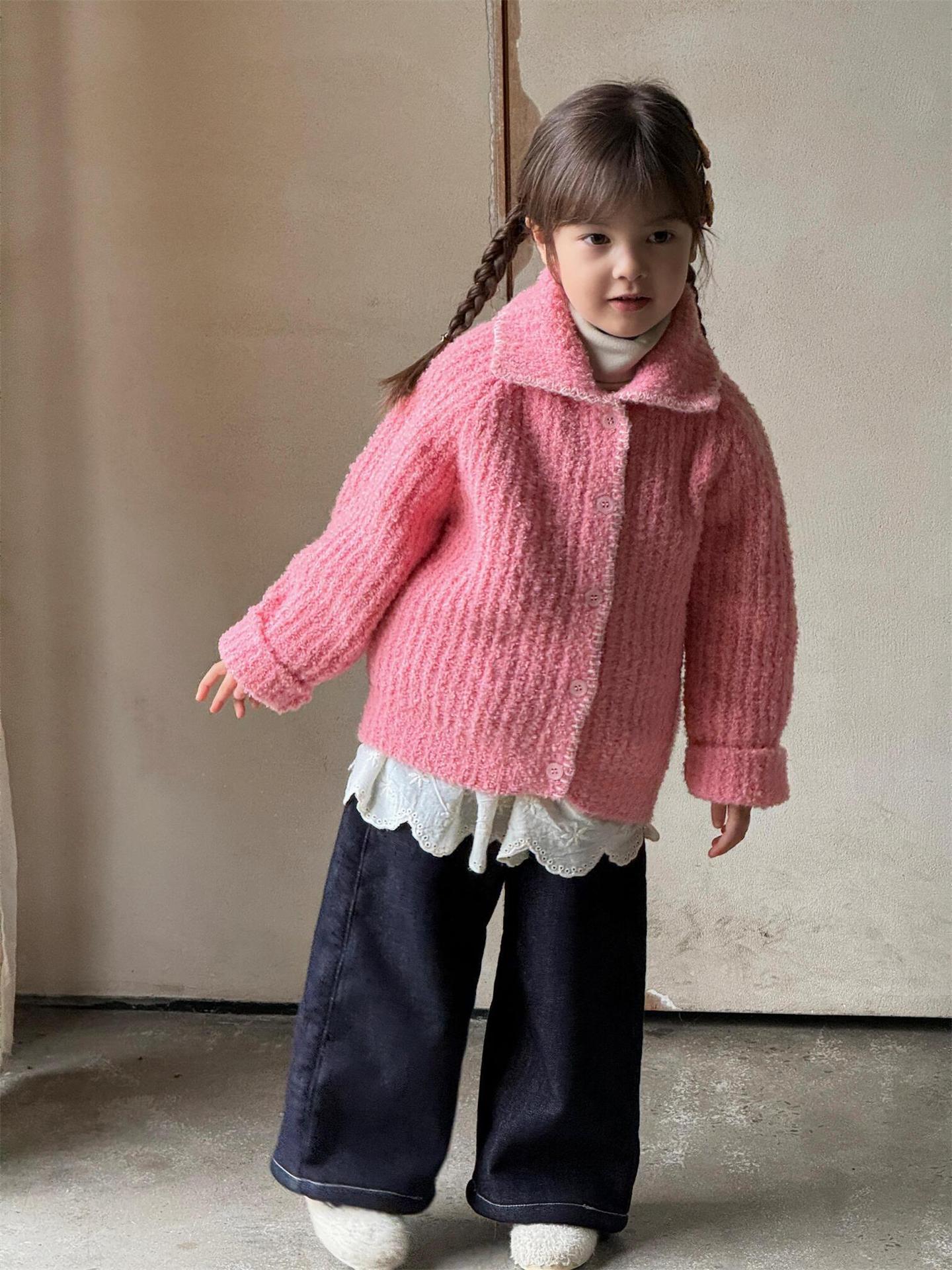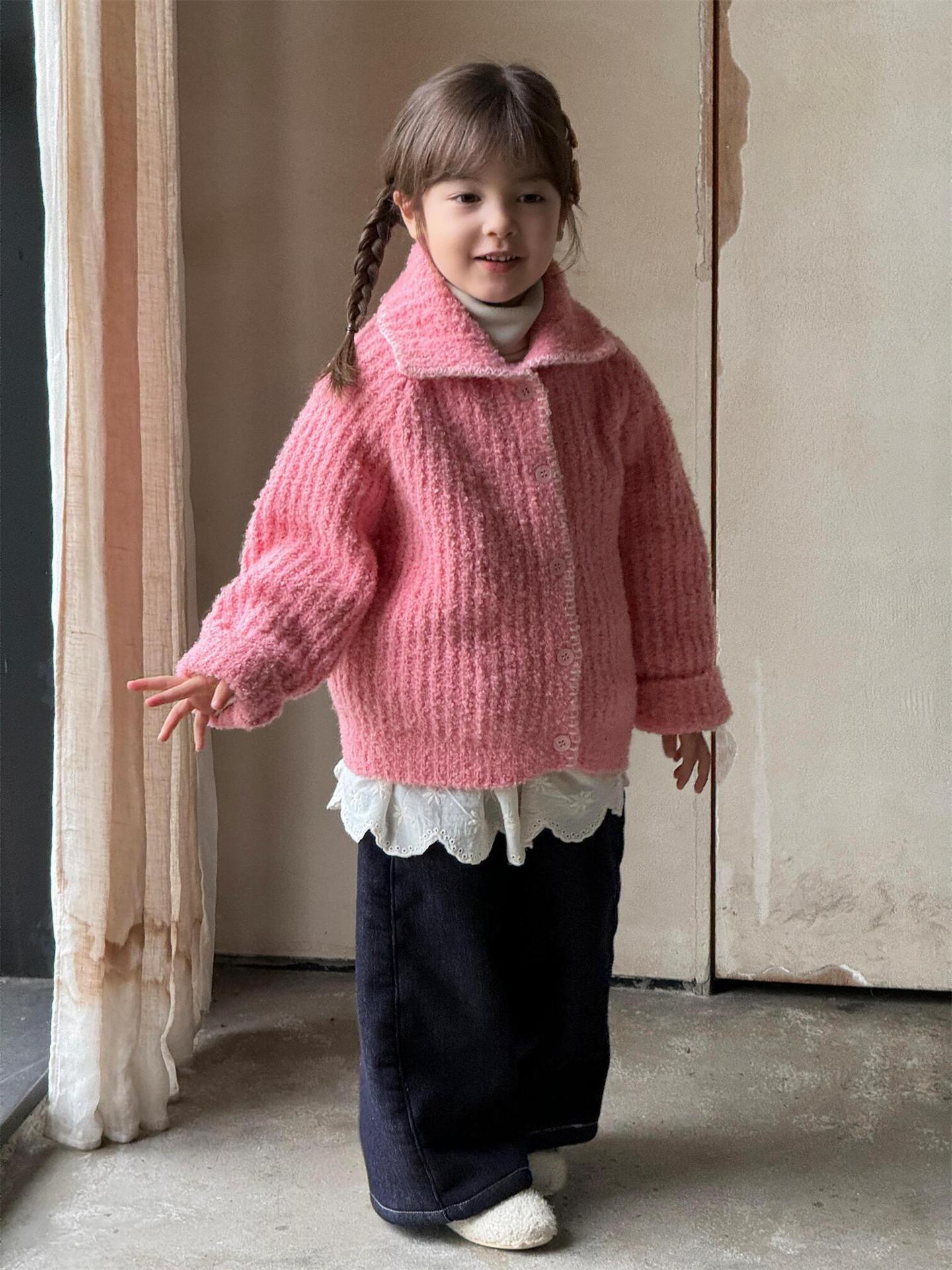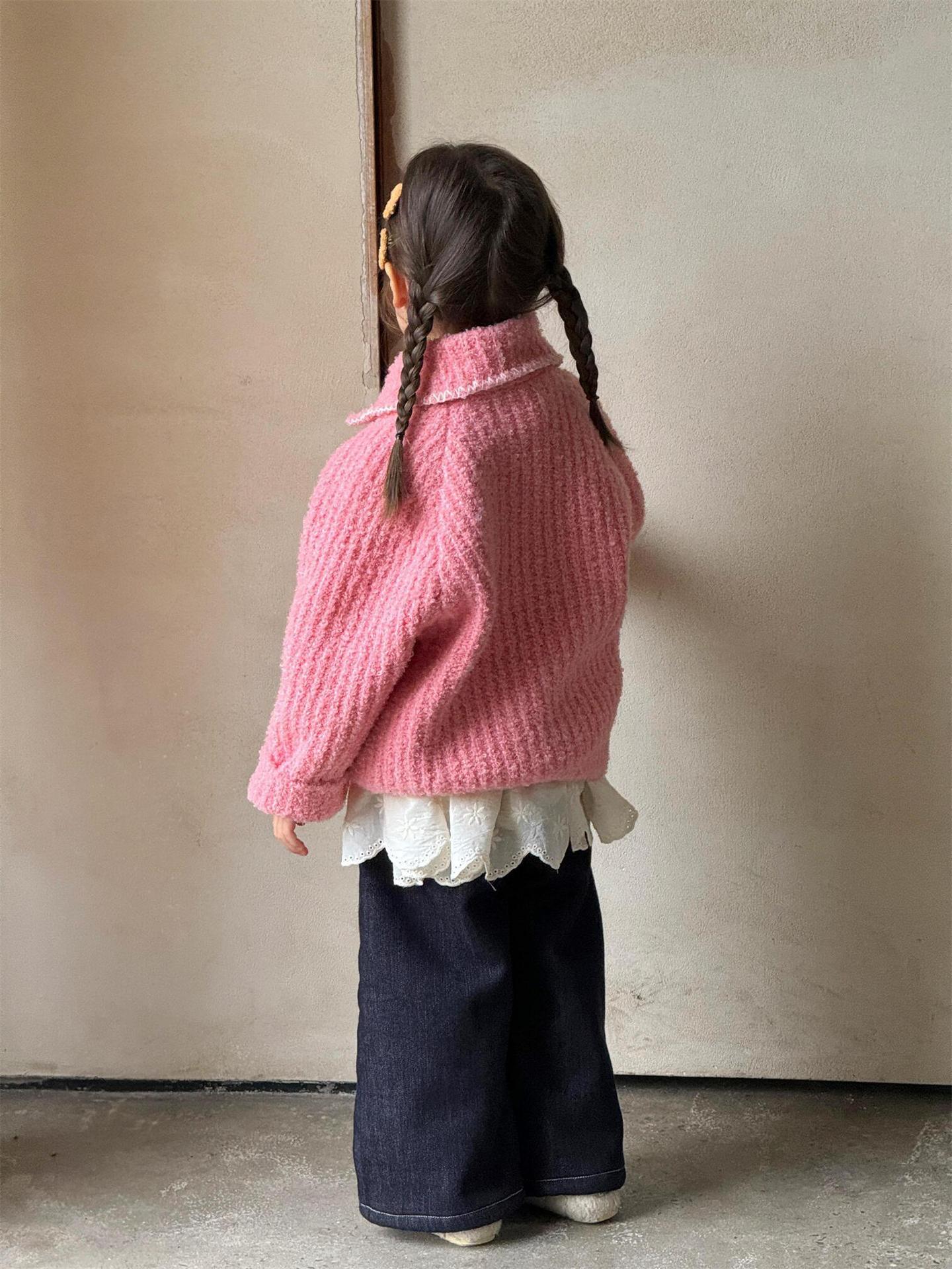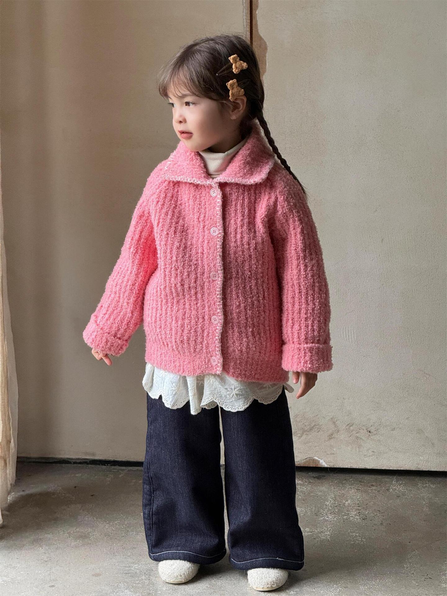최고의 계란 한국 아동복 2024 겨울 새 여아 코트 단색 달콤한 두꺼운 스웨터 카디건 핑크