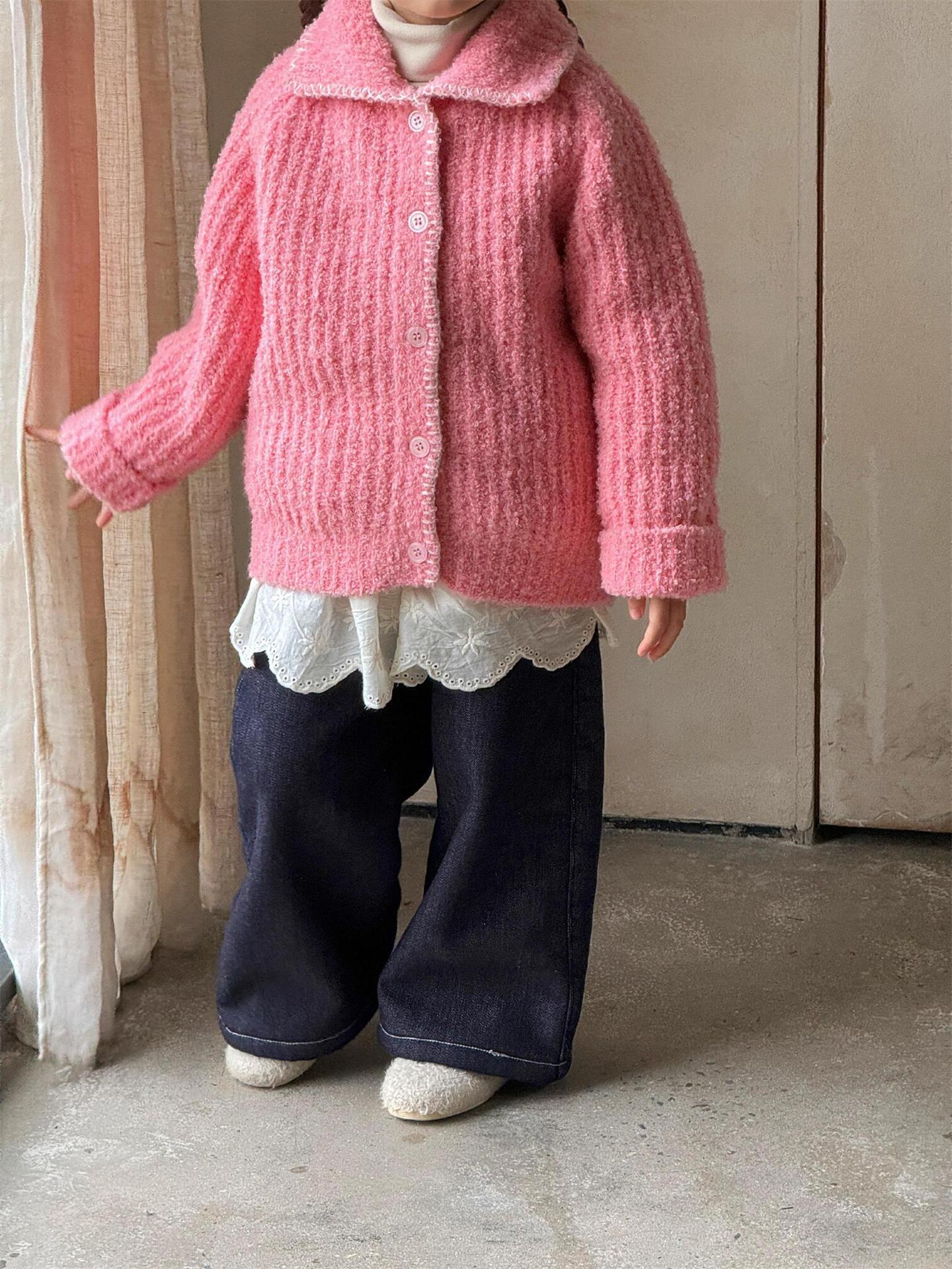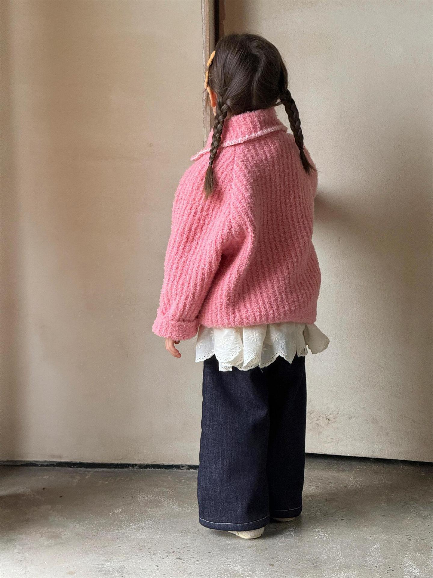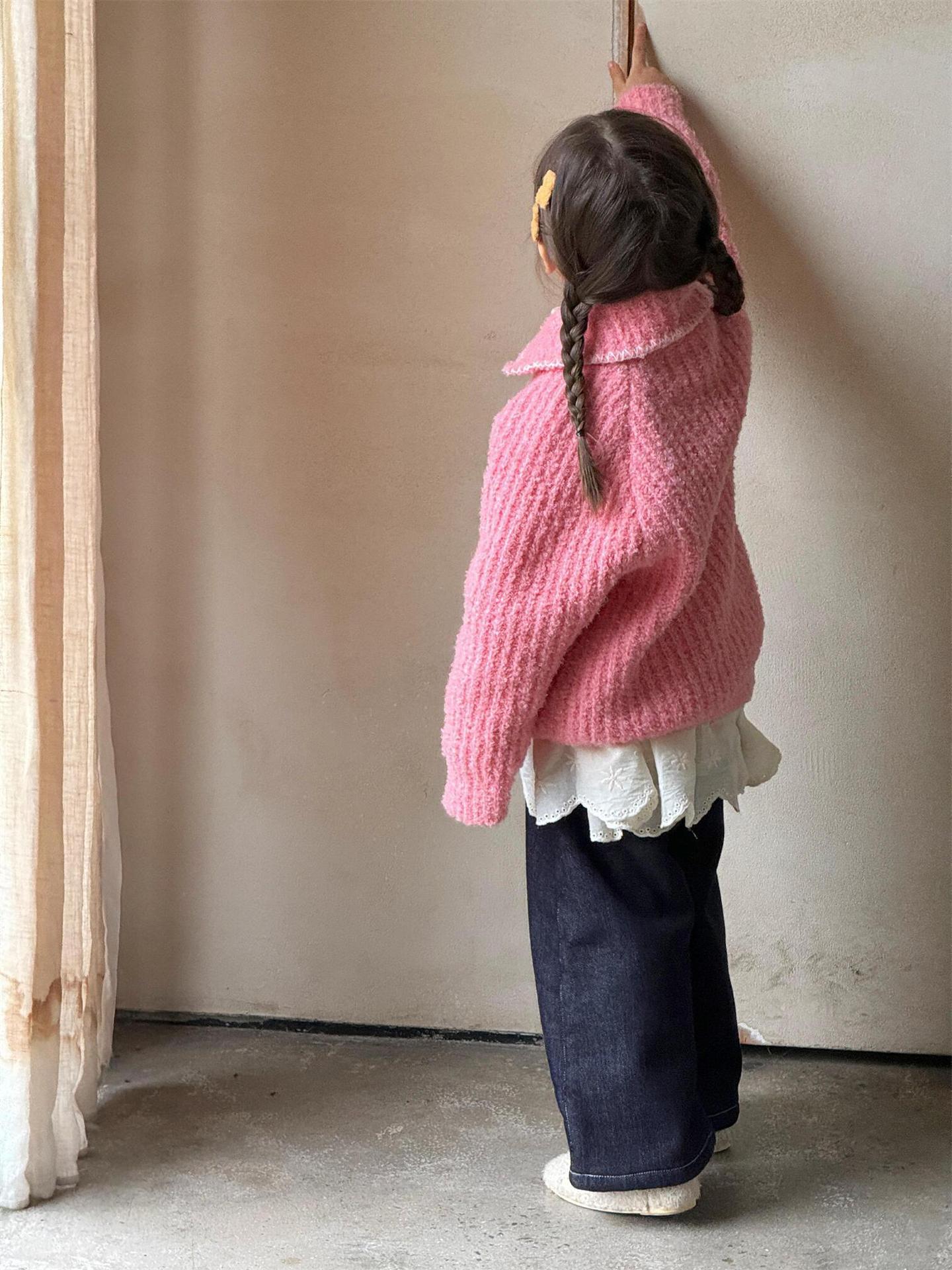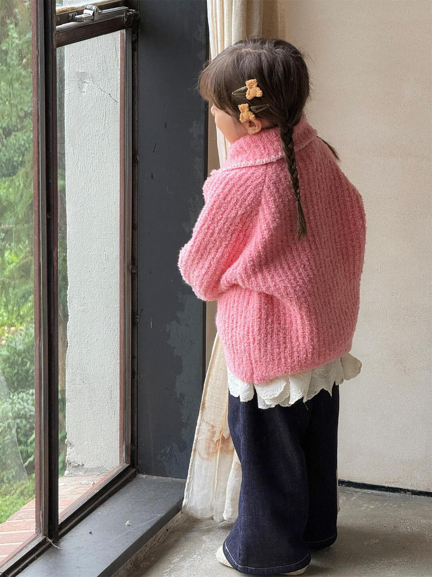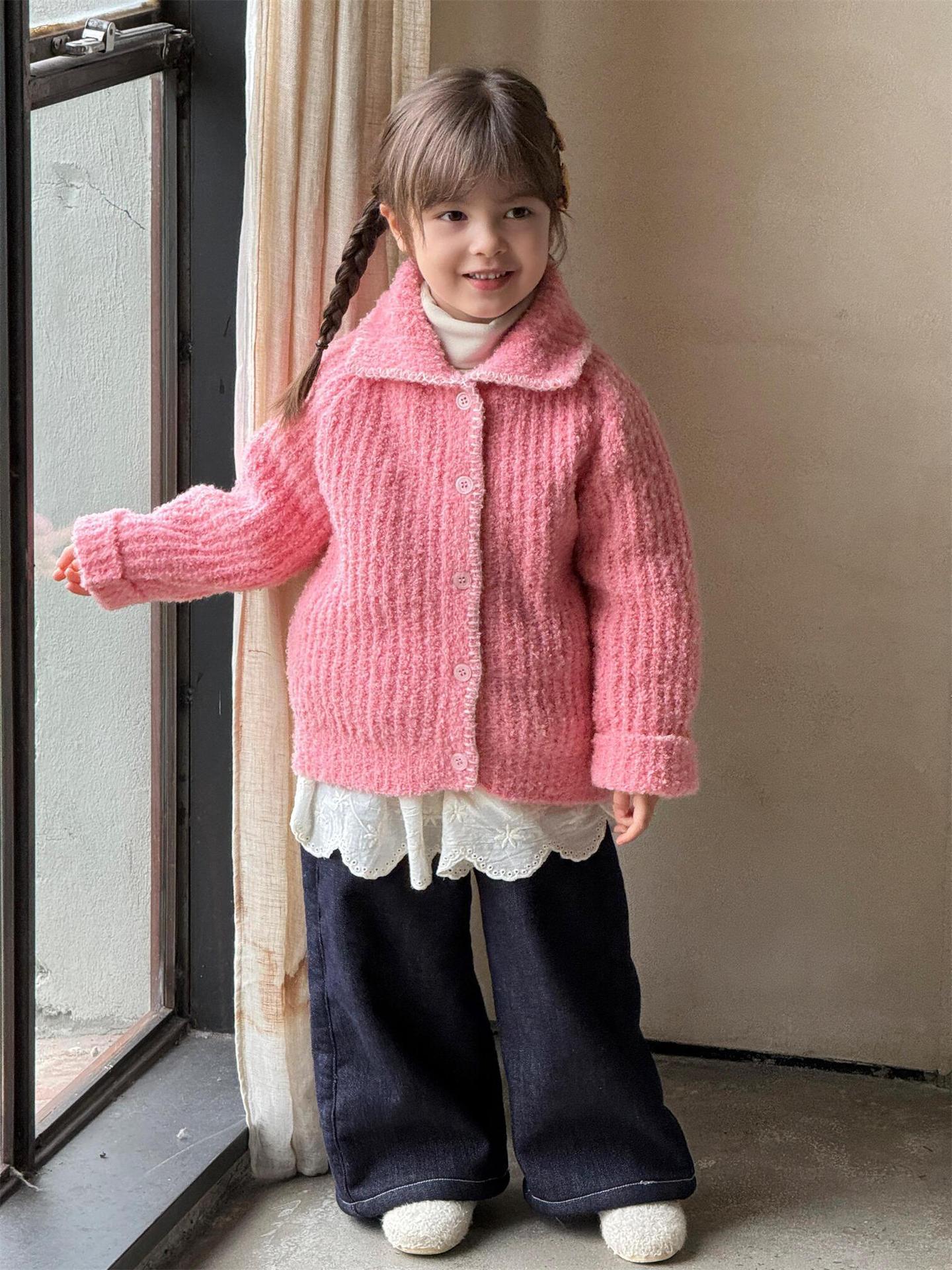 최고의 계란 한국 아동복 2024 겨울 새 여아 코트 단색 달콤한 두꺼운 스웨터 카디건 핑크