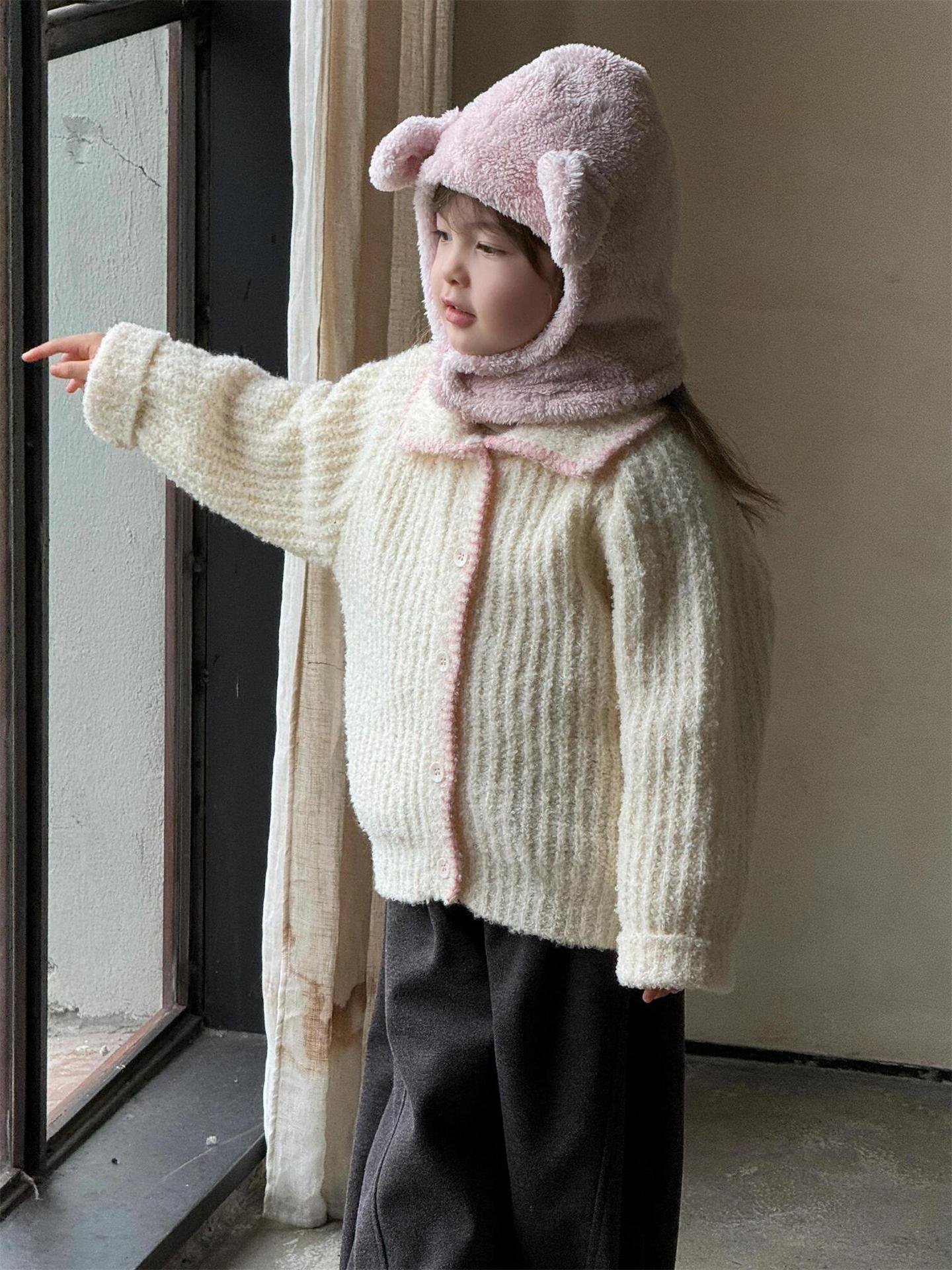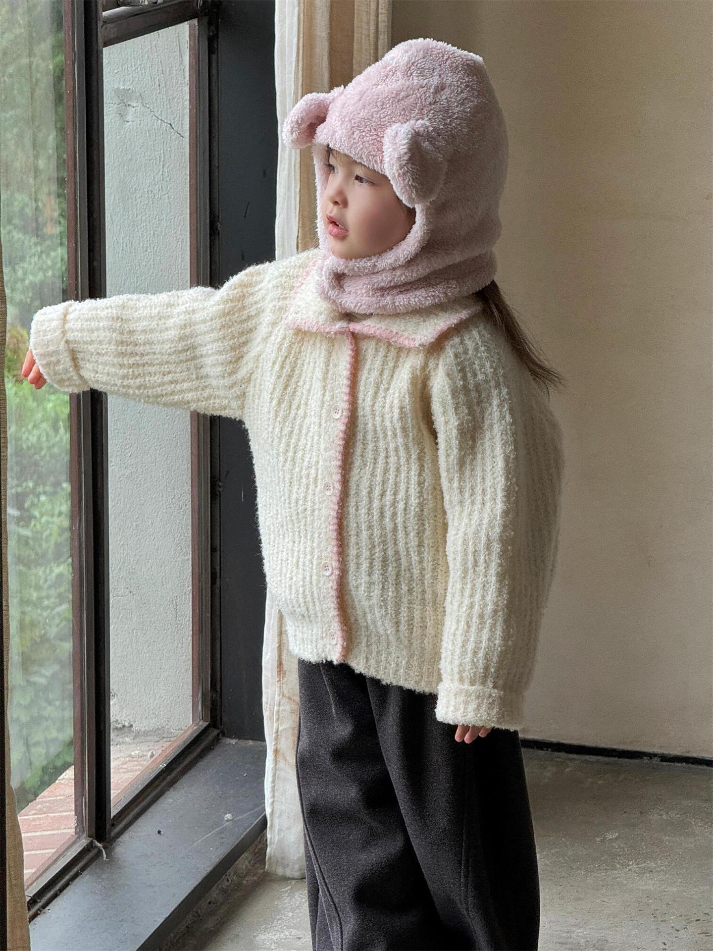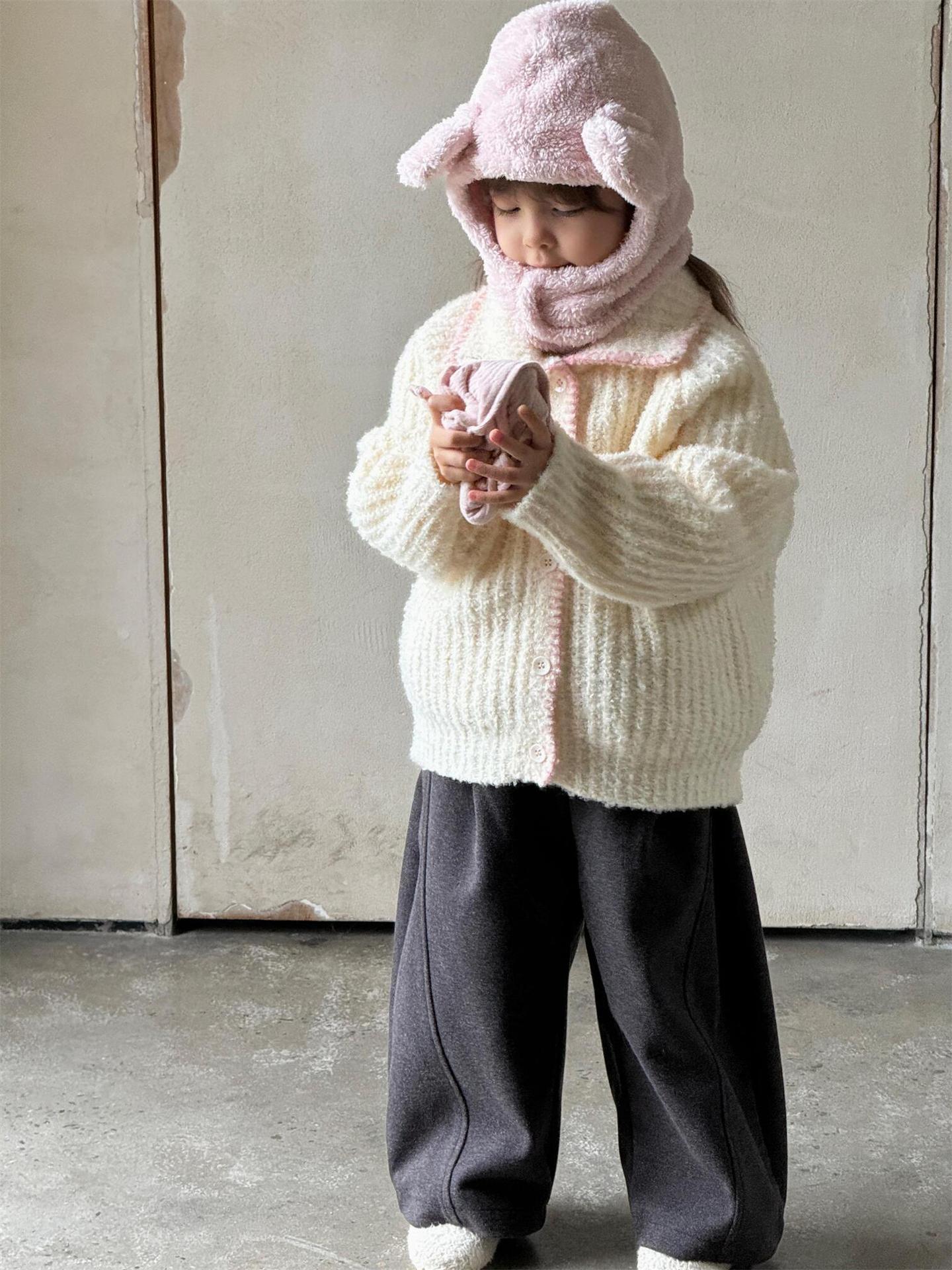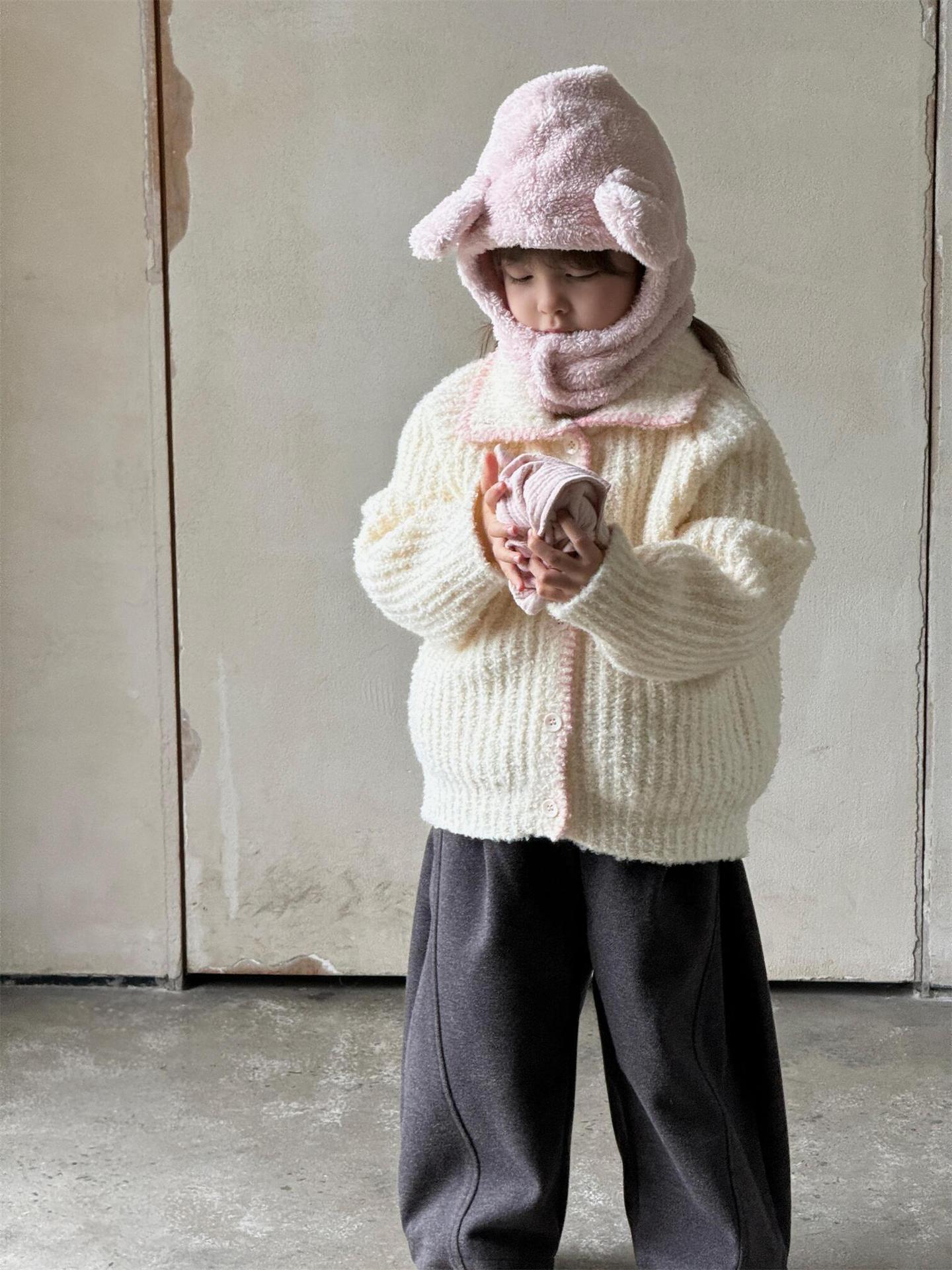 최고의 계란 한국 아동복 2024 겨울 새 여아 코트 단색 달콤한 두꺼운 스웨터 카디건 핑크