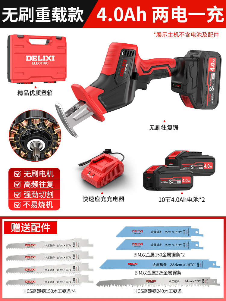• Delixi 고주파 세이버 왕복톱 [4.0Ah 배터리 2개] 플라스틱 상자 + 무료 톱날 8개, 가격 328