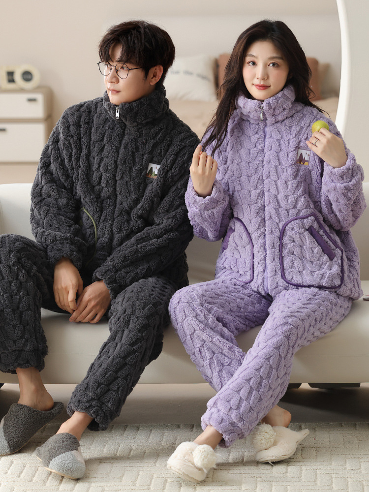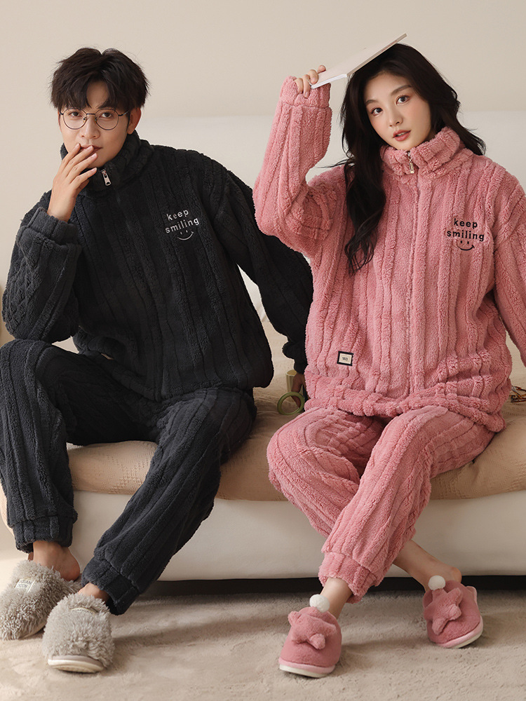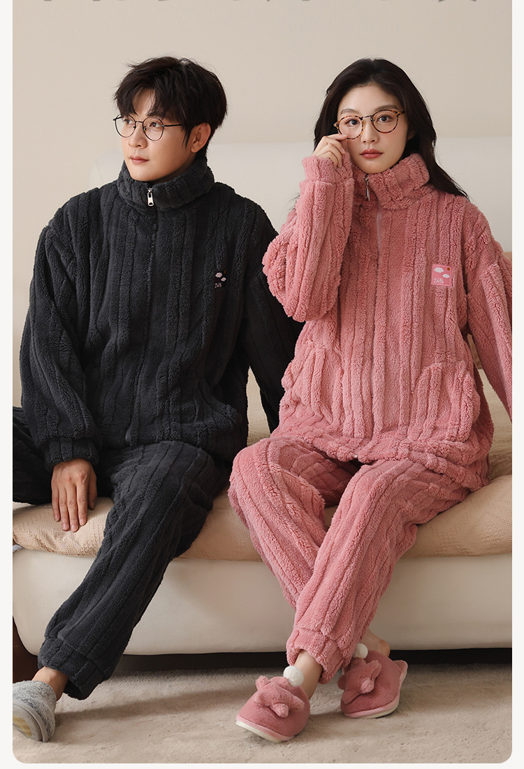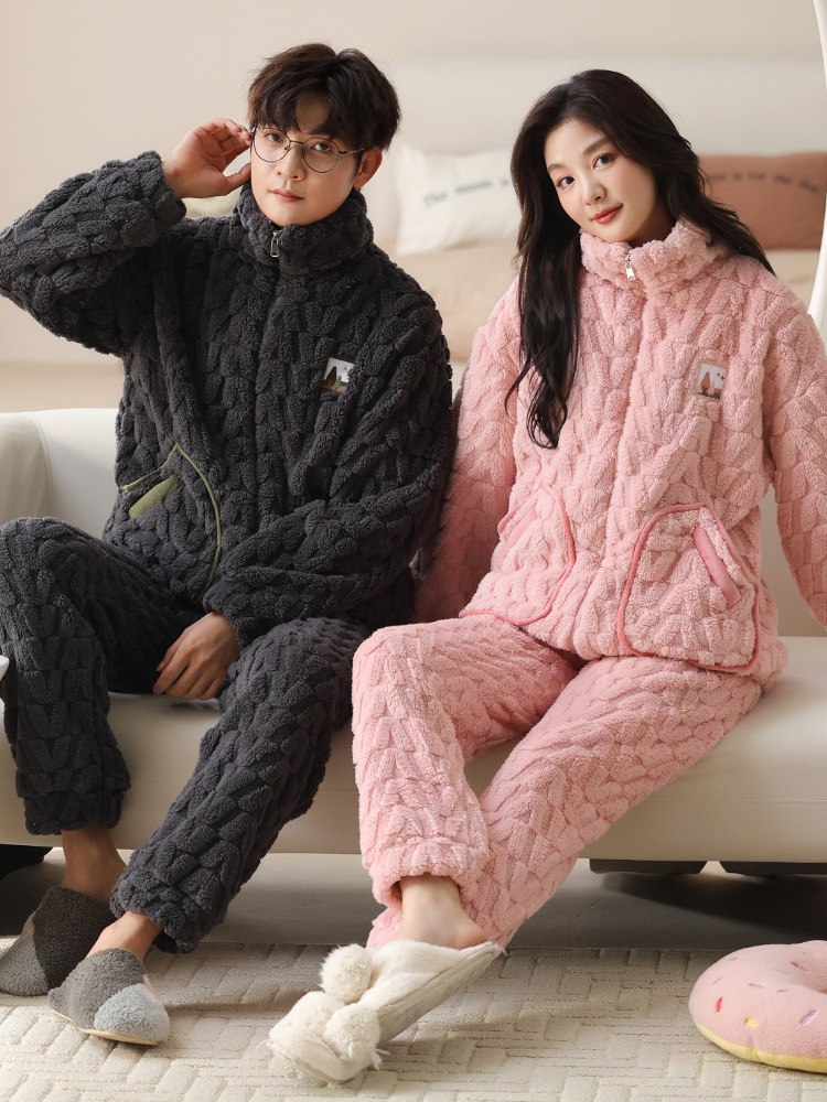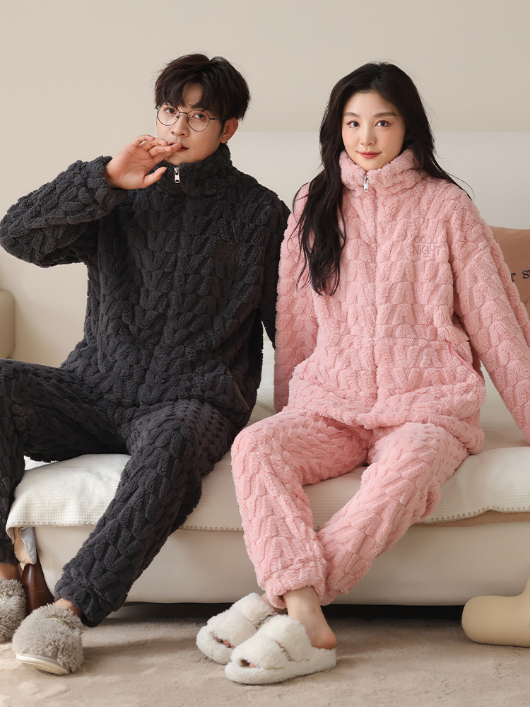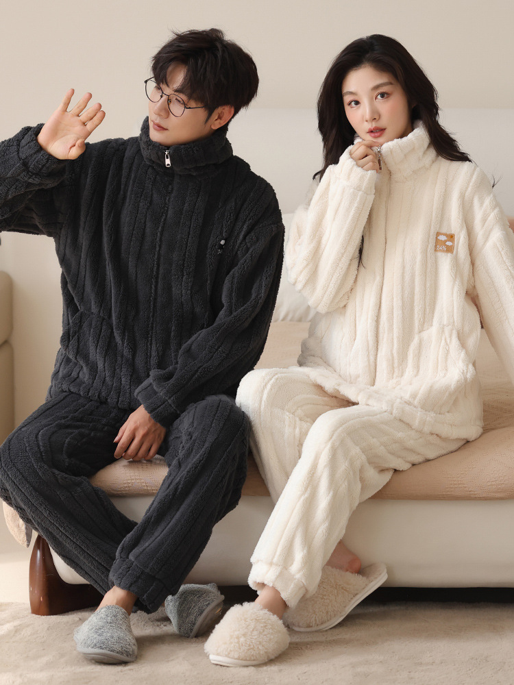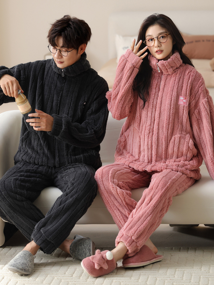커플 잠옷 여성의 가을과 겨울 산호 양털 두꺼운 따뜻한 남성 지퍼 캐주얼 홈 의류 세트