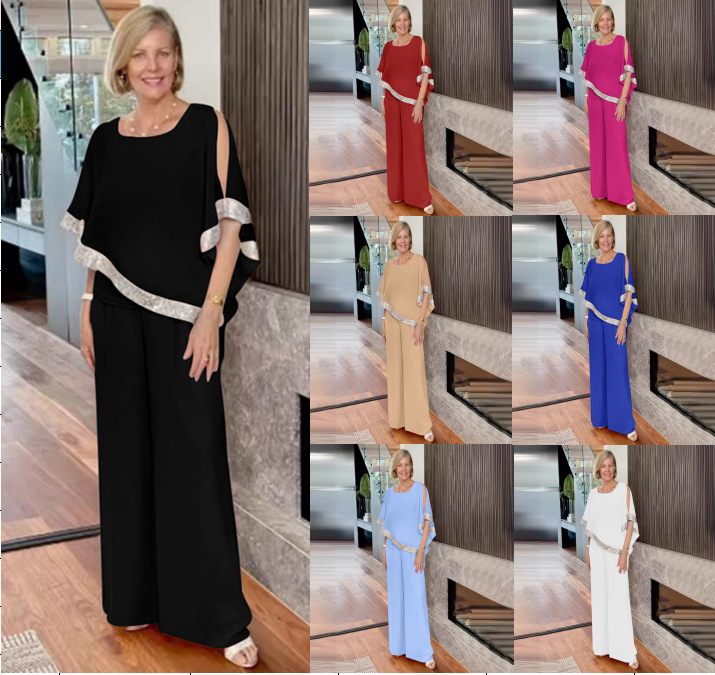 2025 봄 여름 휴가용 유럽풍 3피스 세트 아마존 라운드넥 스팽글 배색 박쥐소매 상의 와이드 팬츠 출퇴근룩 신상