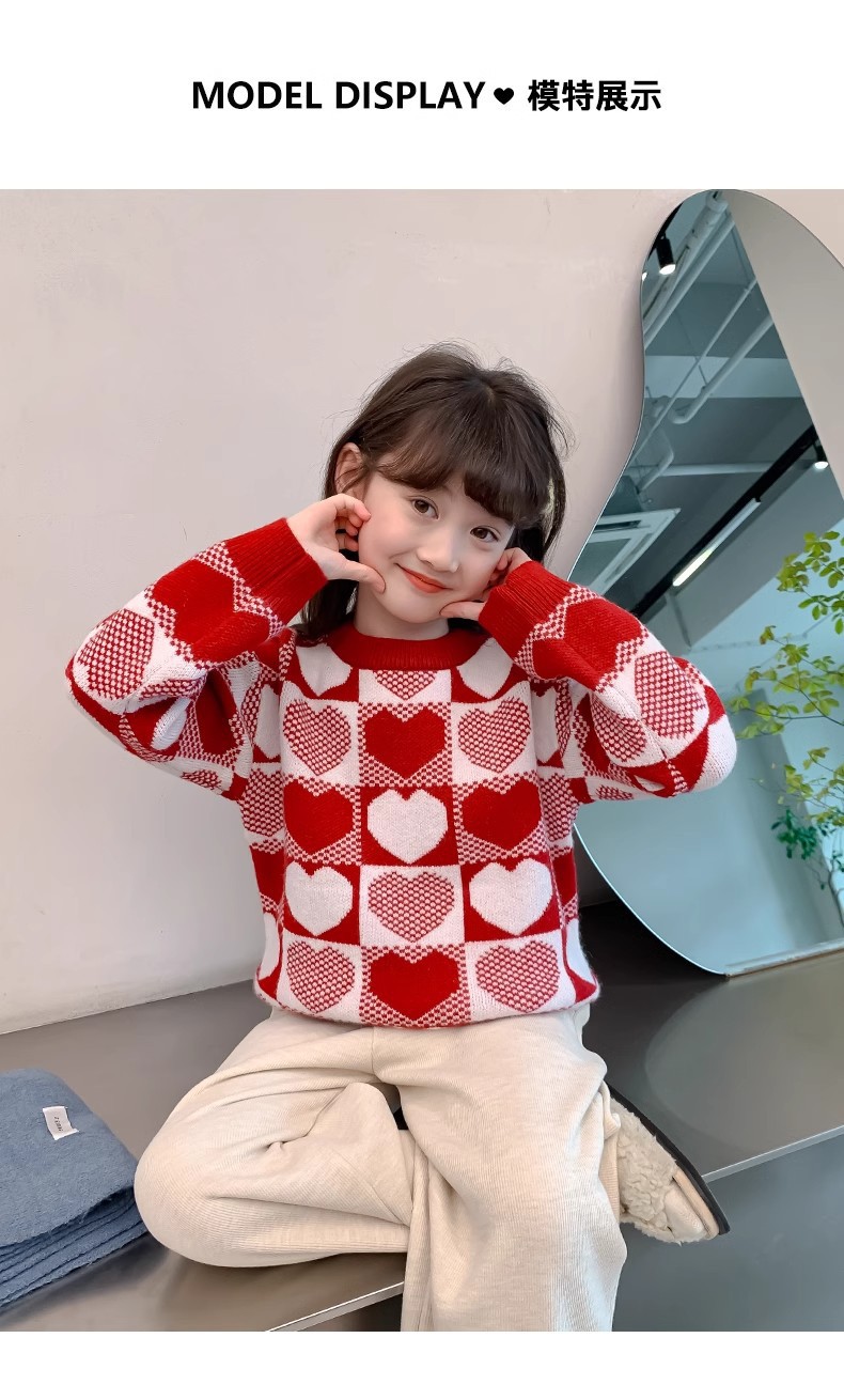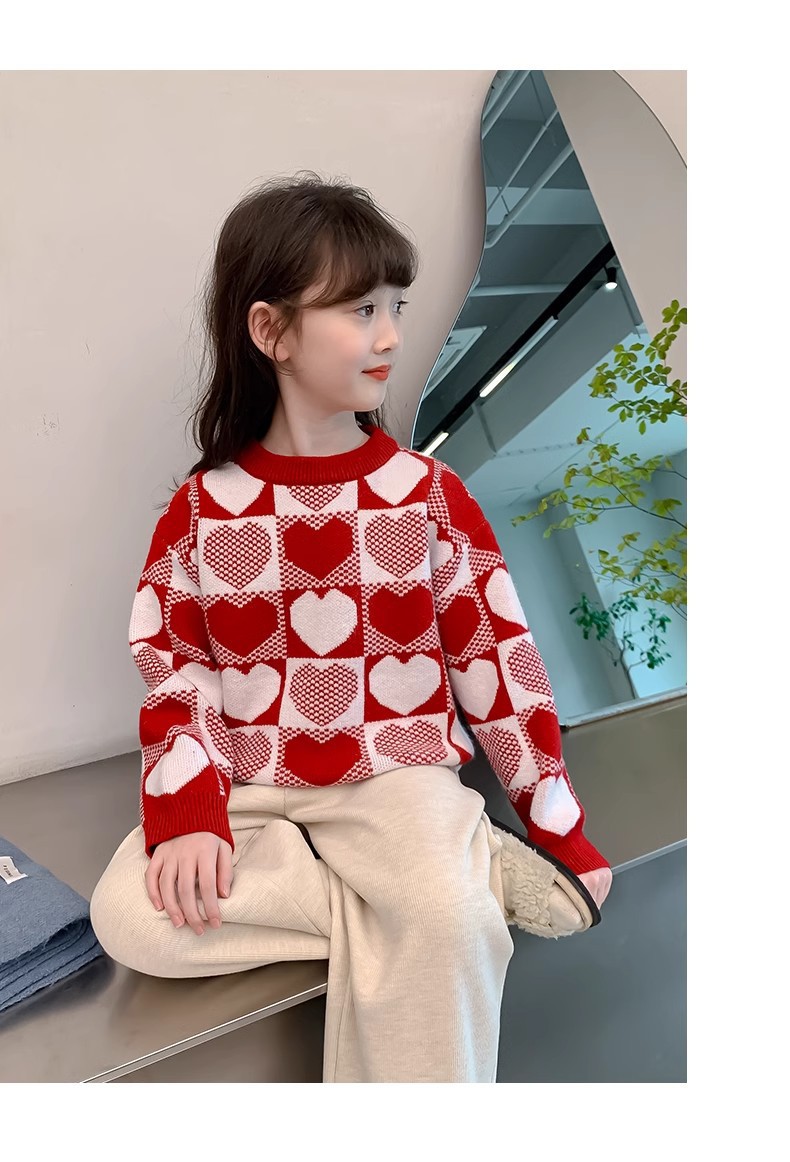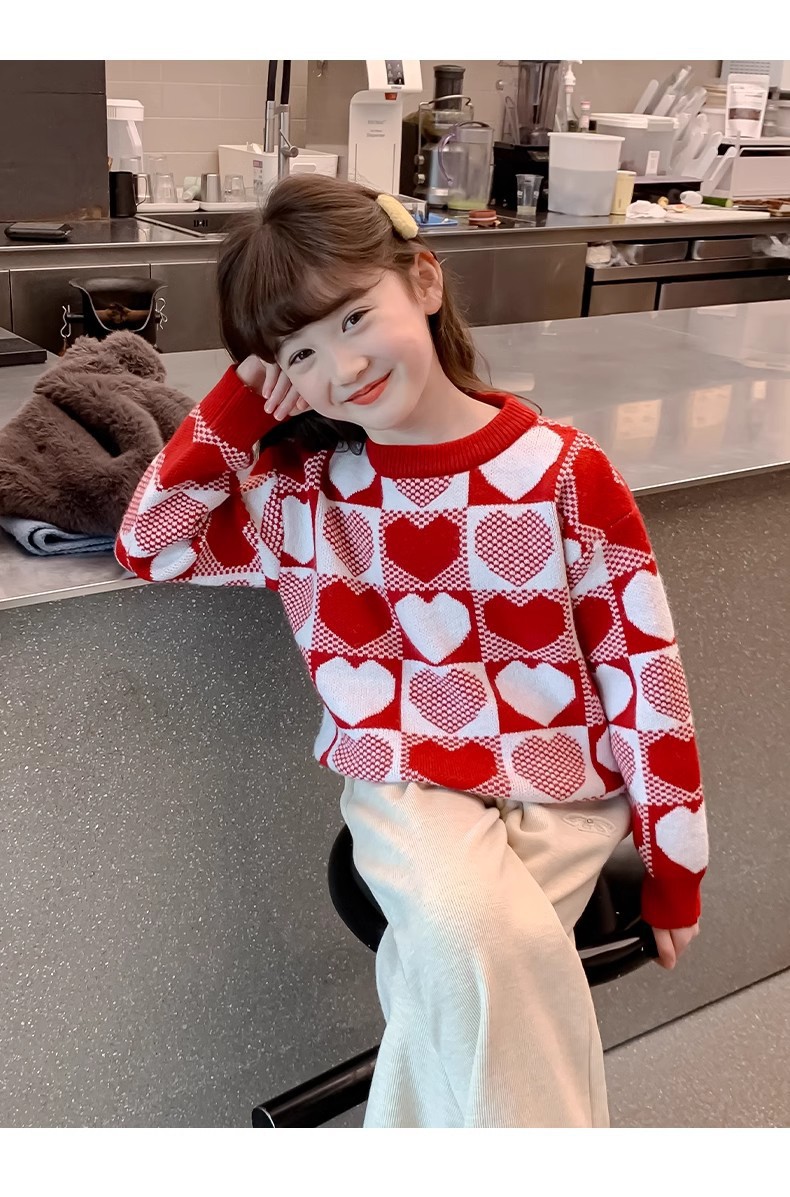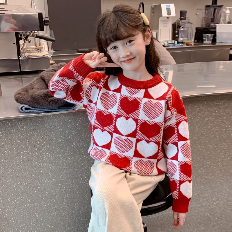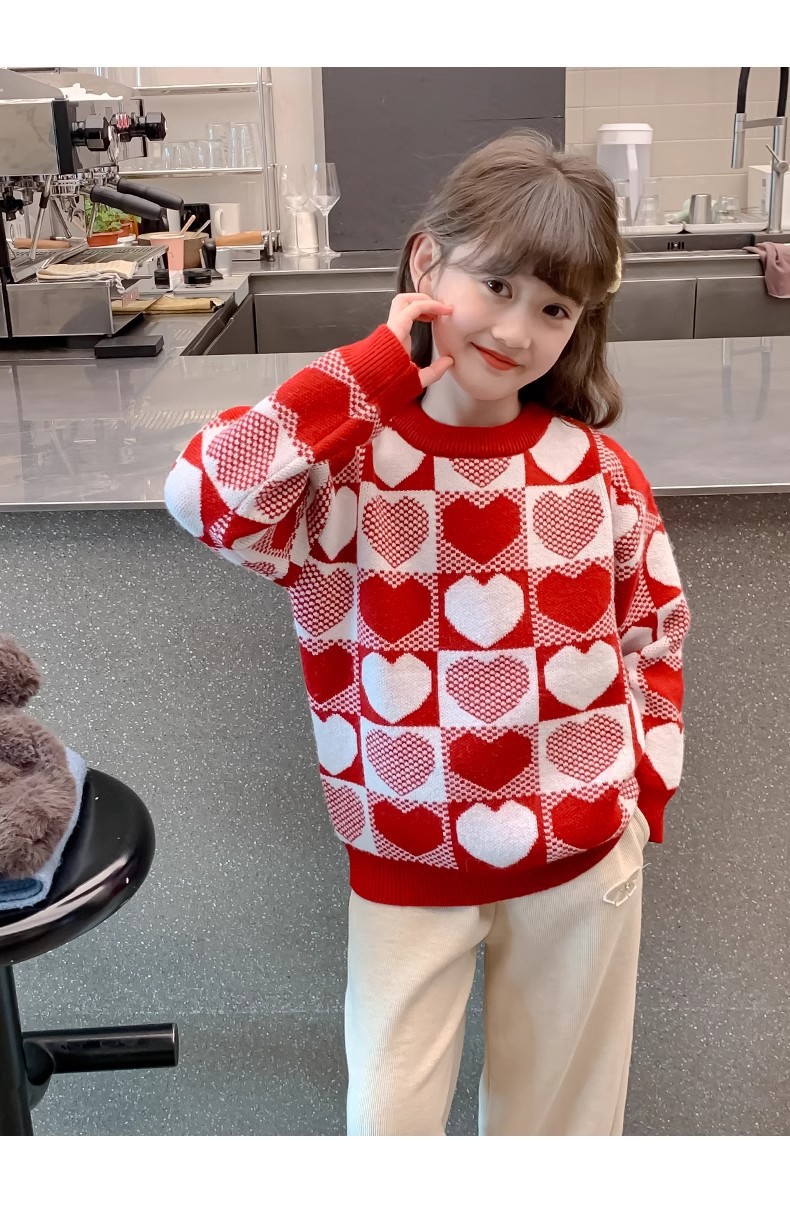 소녀 2024 새로운 스웨터 가을과 겨울 소녀 붉은 스웨터 어린이 풀오버 격자 무늬 러빙 백 스웨터스토어 가기