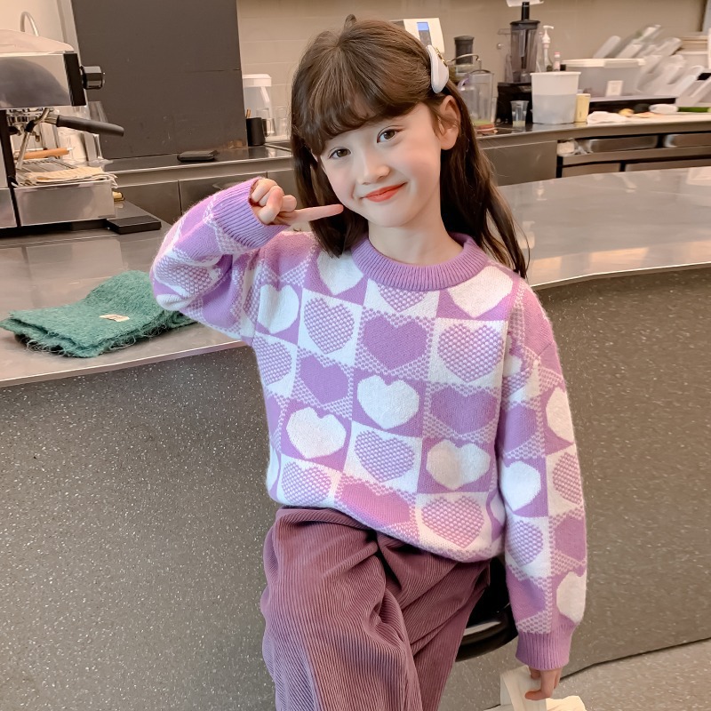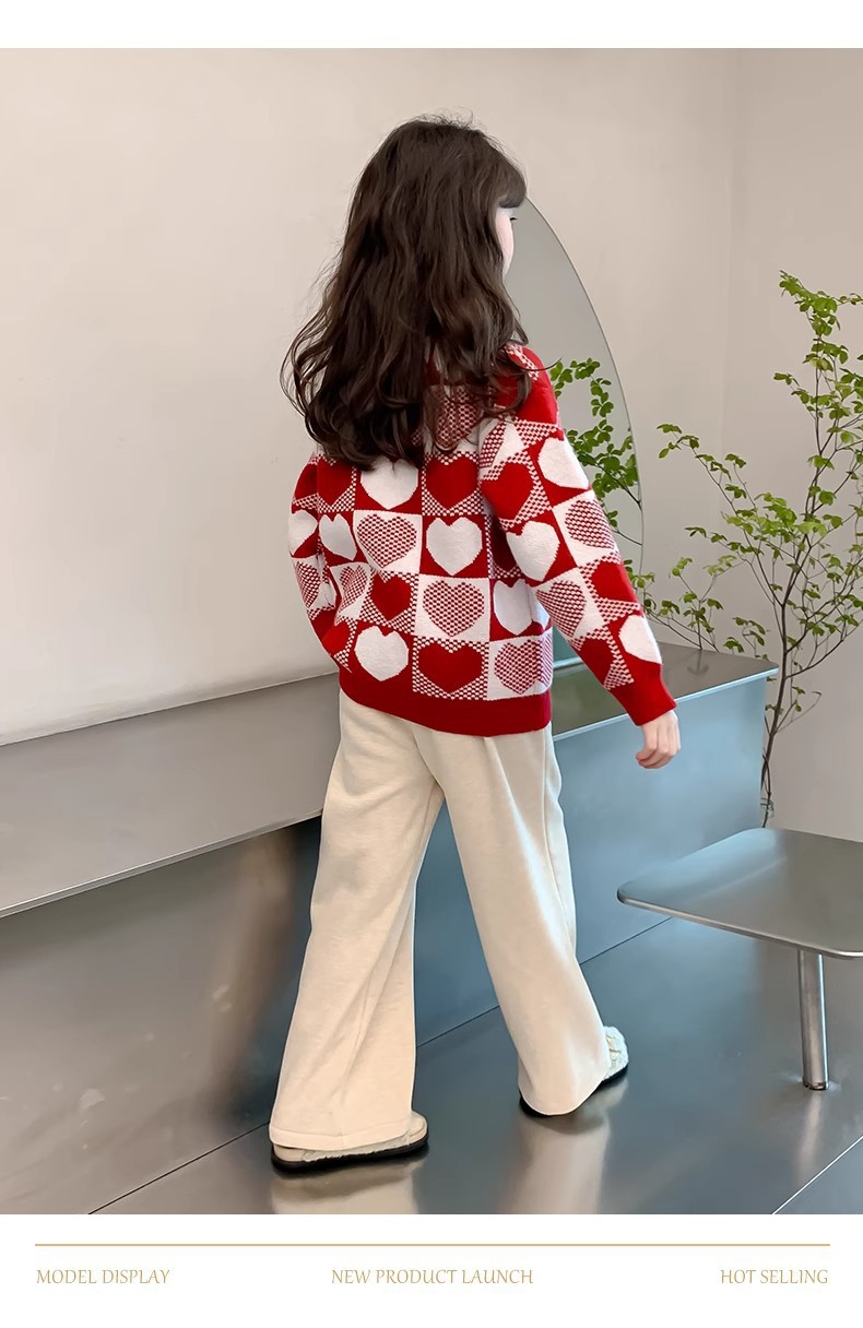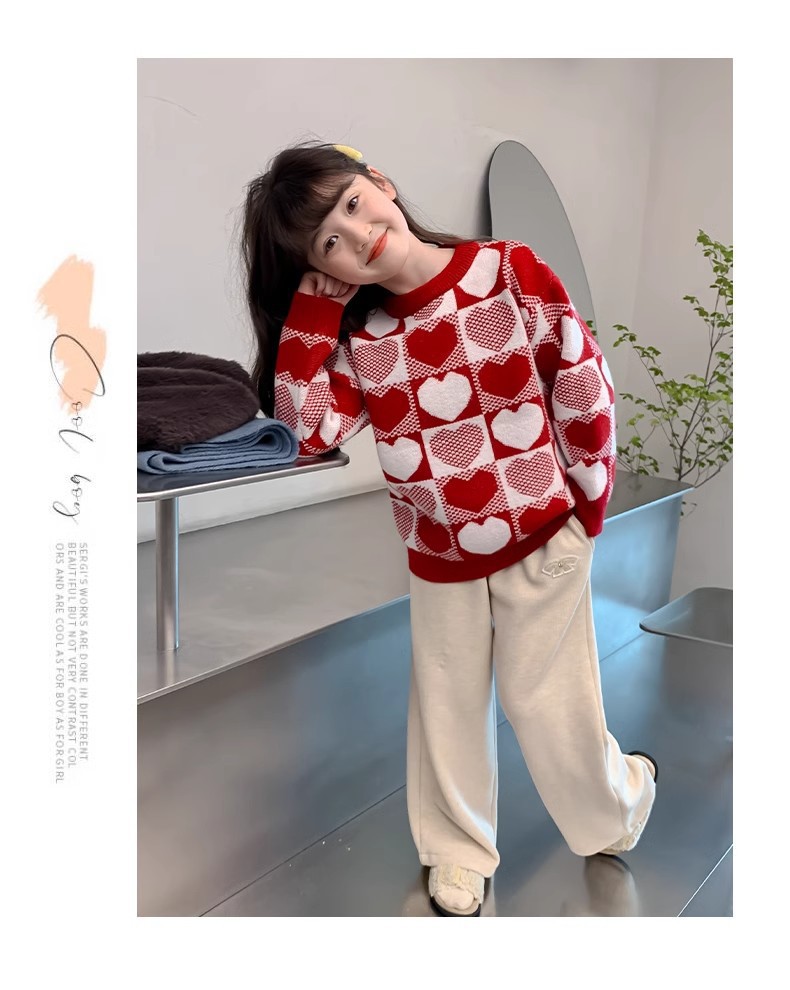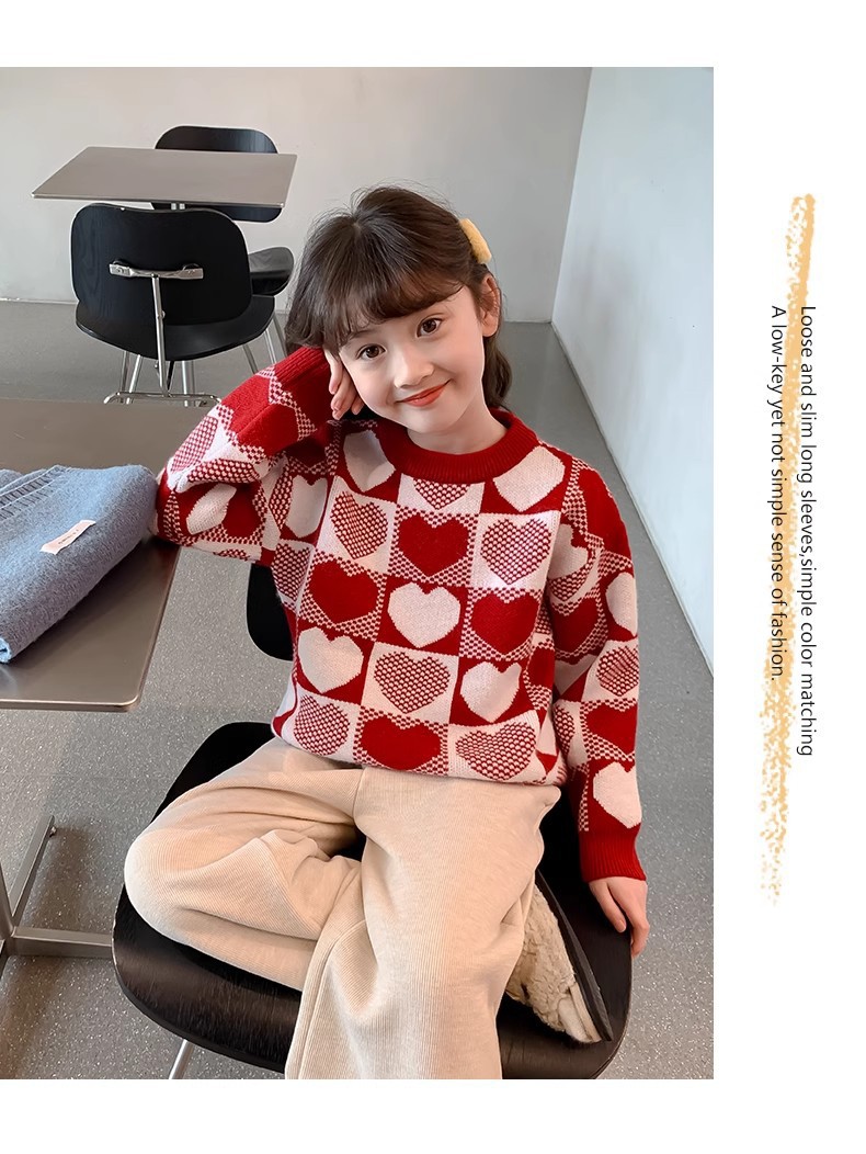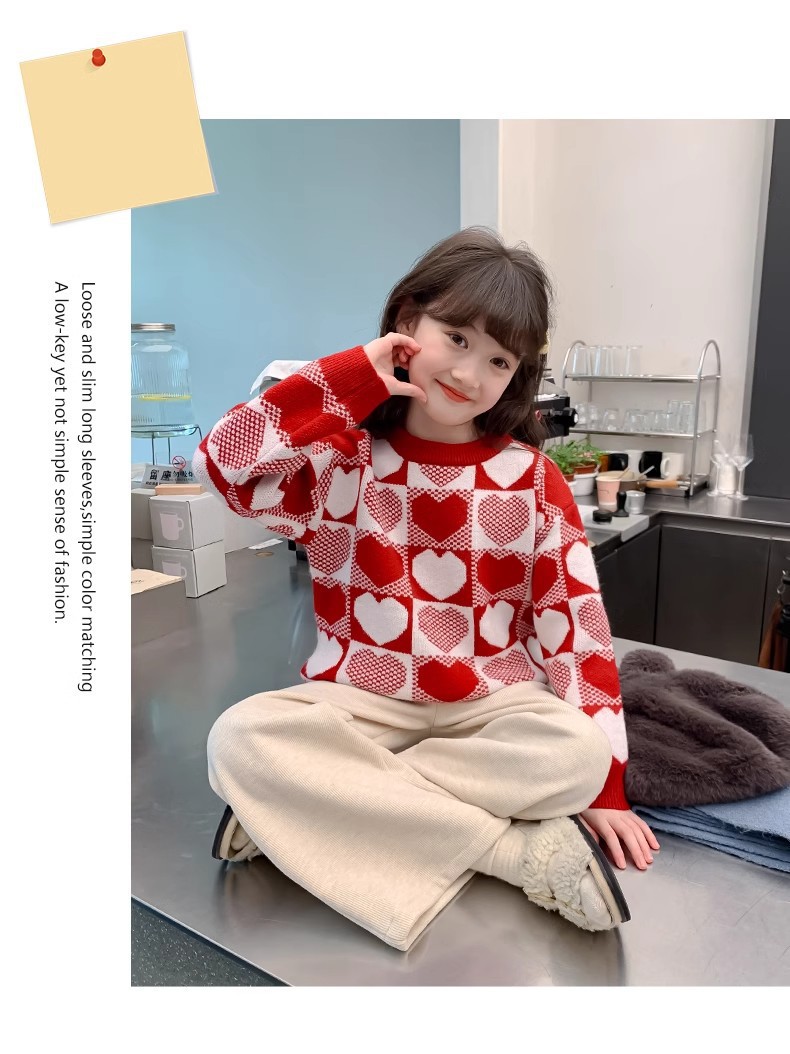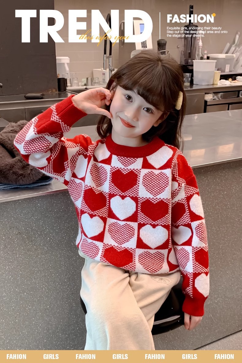 소녀 2024 새로운 스웨터 가을과 겨울 소녀 붉은 스웨터 어린이 풀오버 격자 무늬 러빙 백 스웨터스토어 가기