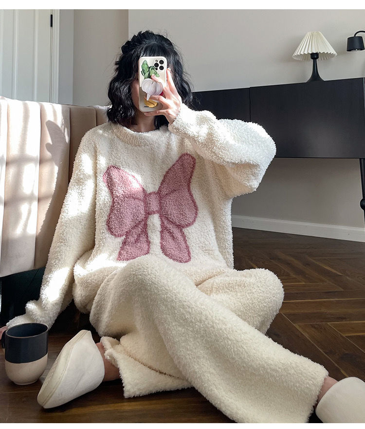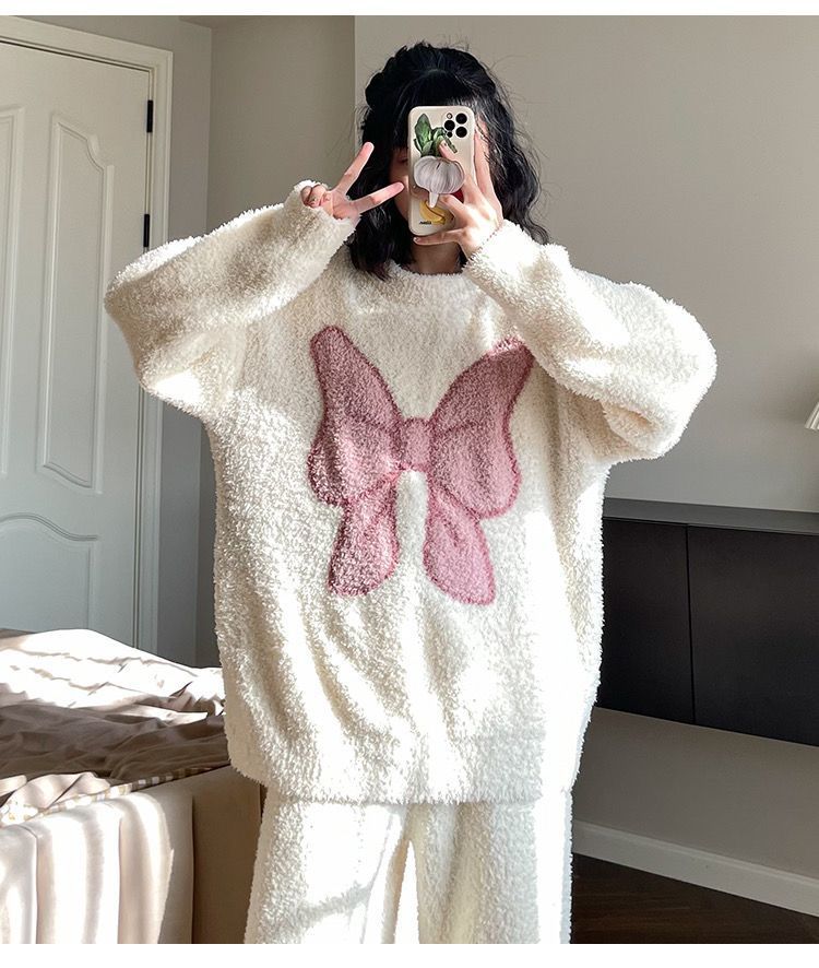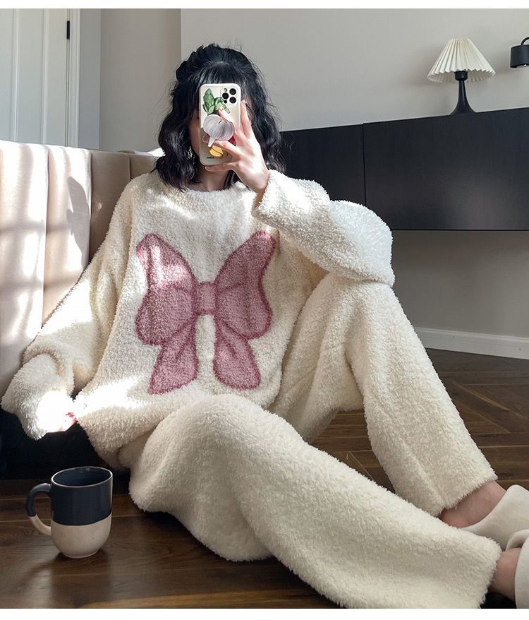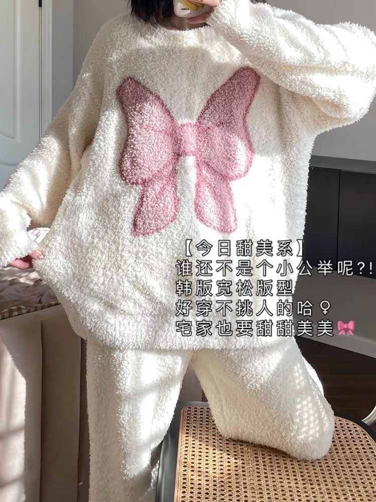 겨울용 잠옷 여성용 산호 양털 두꺼운 달콤한 긴팔 캐주얼 라운드 넥 플란넬 여성용 홈 의류 세트스토어 가기