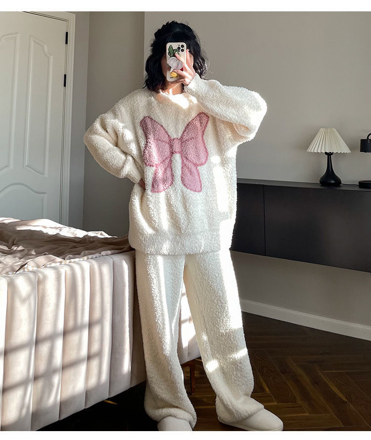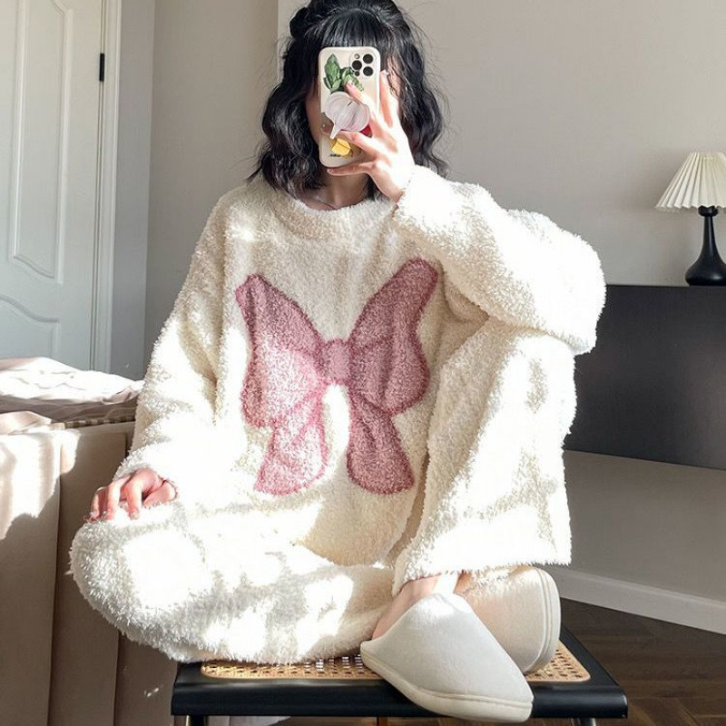 겨울용 잠옷 여성용 산호 양털 두꺼운 달콤한 긴팔 캐주얼 라운드 넥 플란넬 여성용 홈 의류 세트