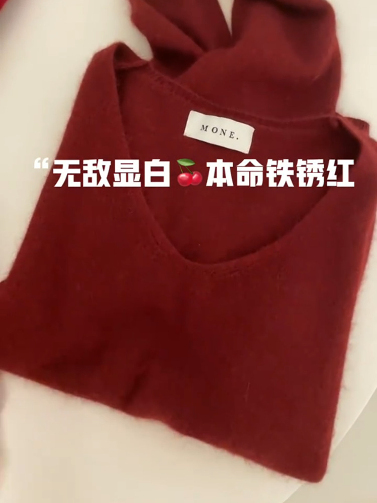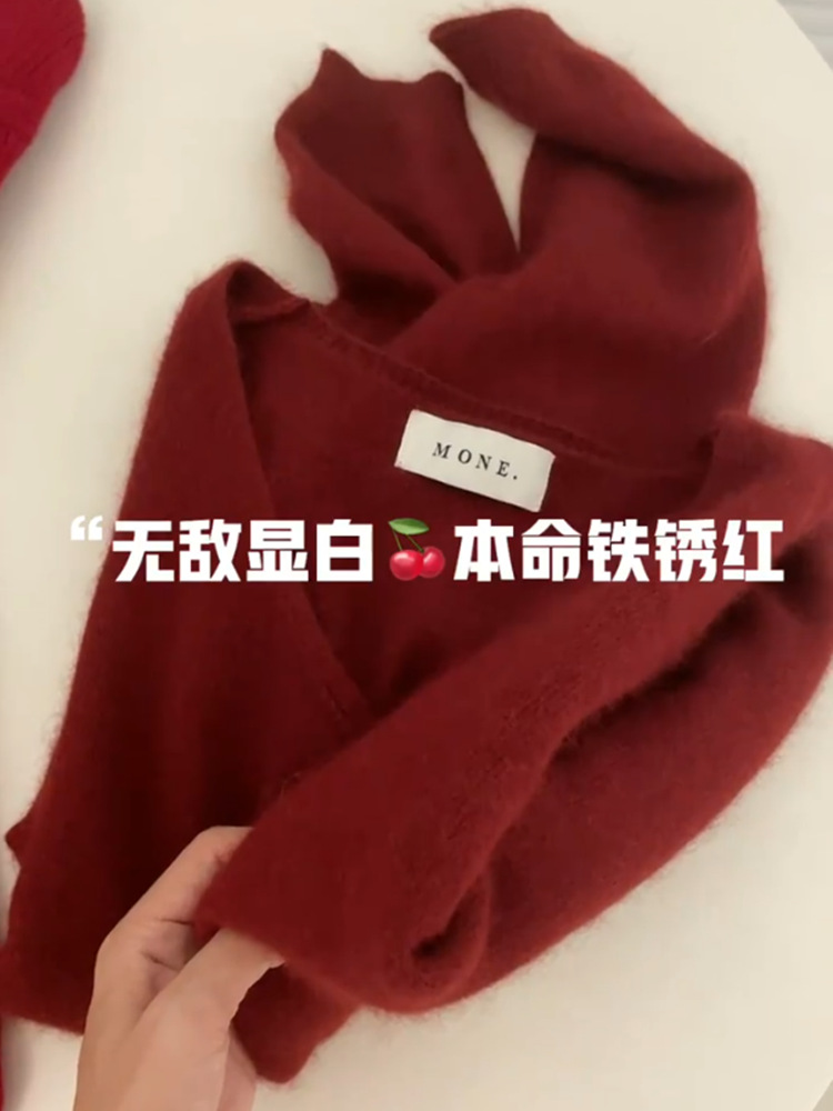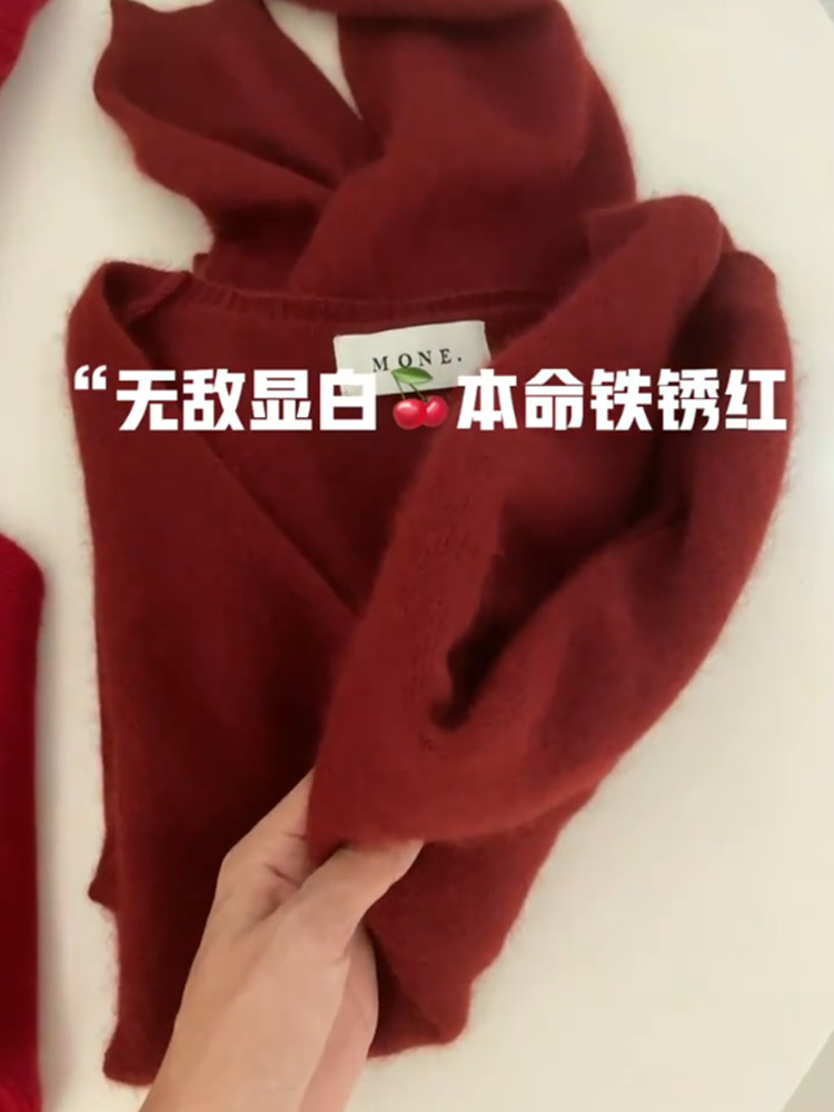 高级感慵懒风软糯浣熊绒打底针织衫秋冬季内搭V领本命红色毛衣女