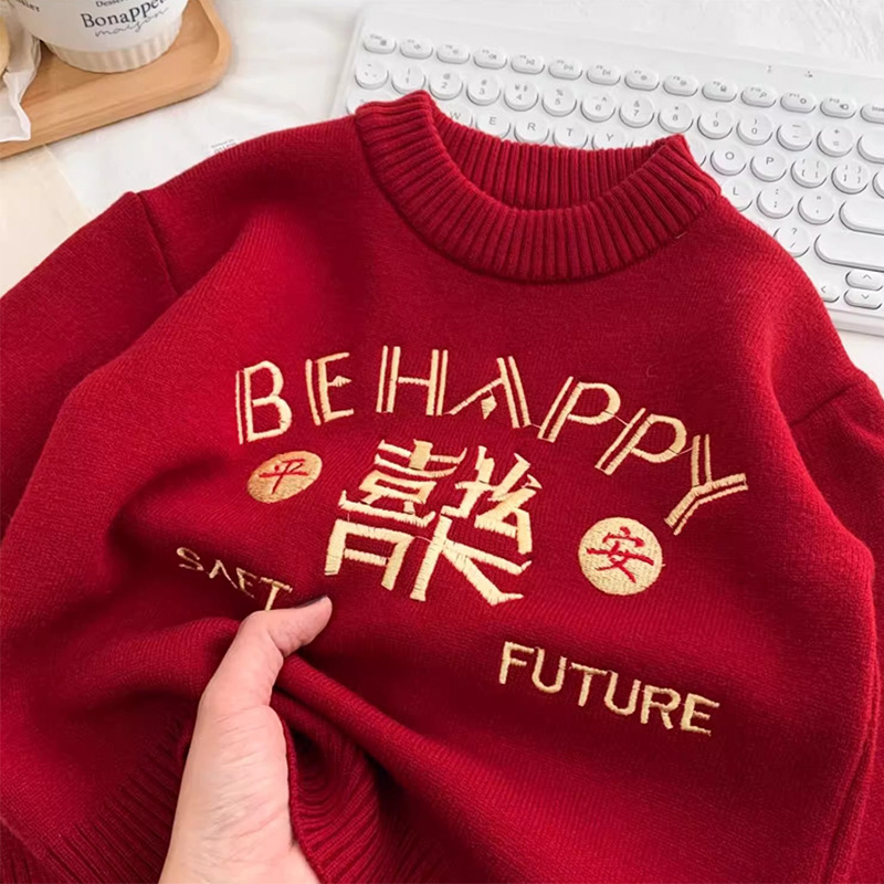 남녀 아동용 니트 상의 2026 가을 겨울 신상 아기 자수 레드 축제용 새해맞이 중국풍 스웨터