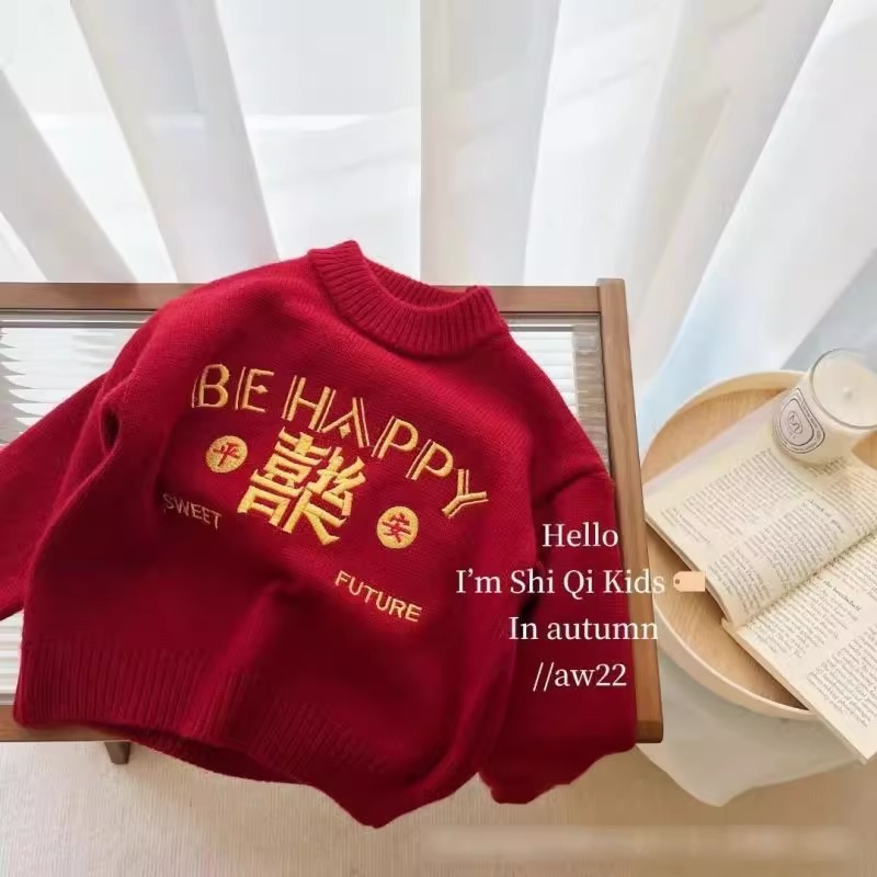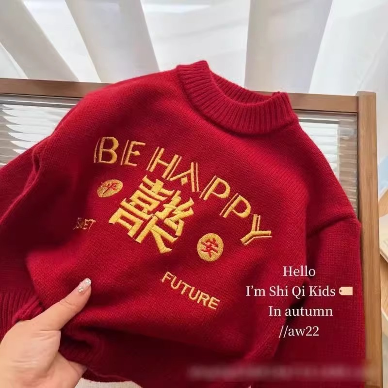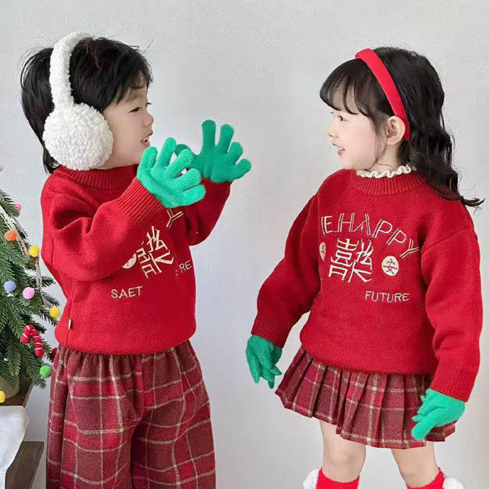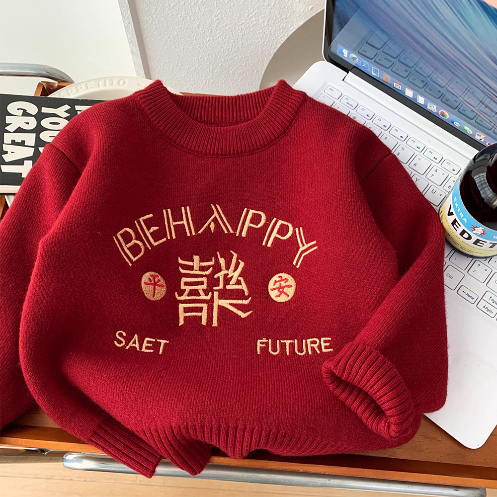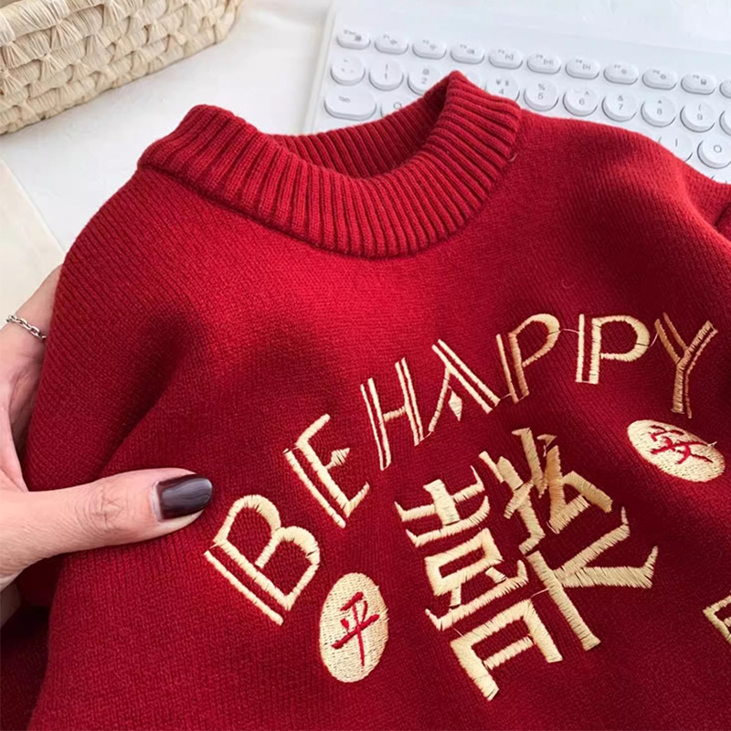 남녀 아동용 니트 상의 2026 가을 겨울 신상 아기 자수 레드 축제용 새해맞이 중국풍 스웨터스토어 가기